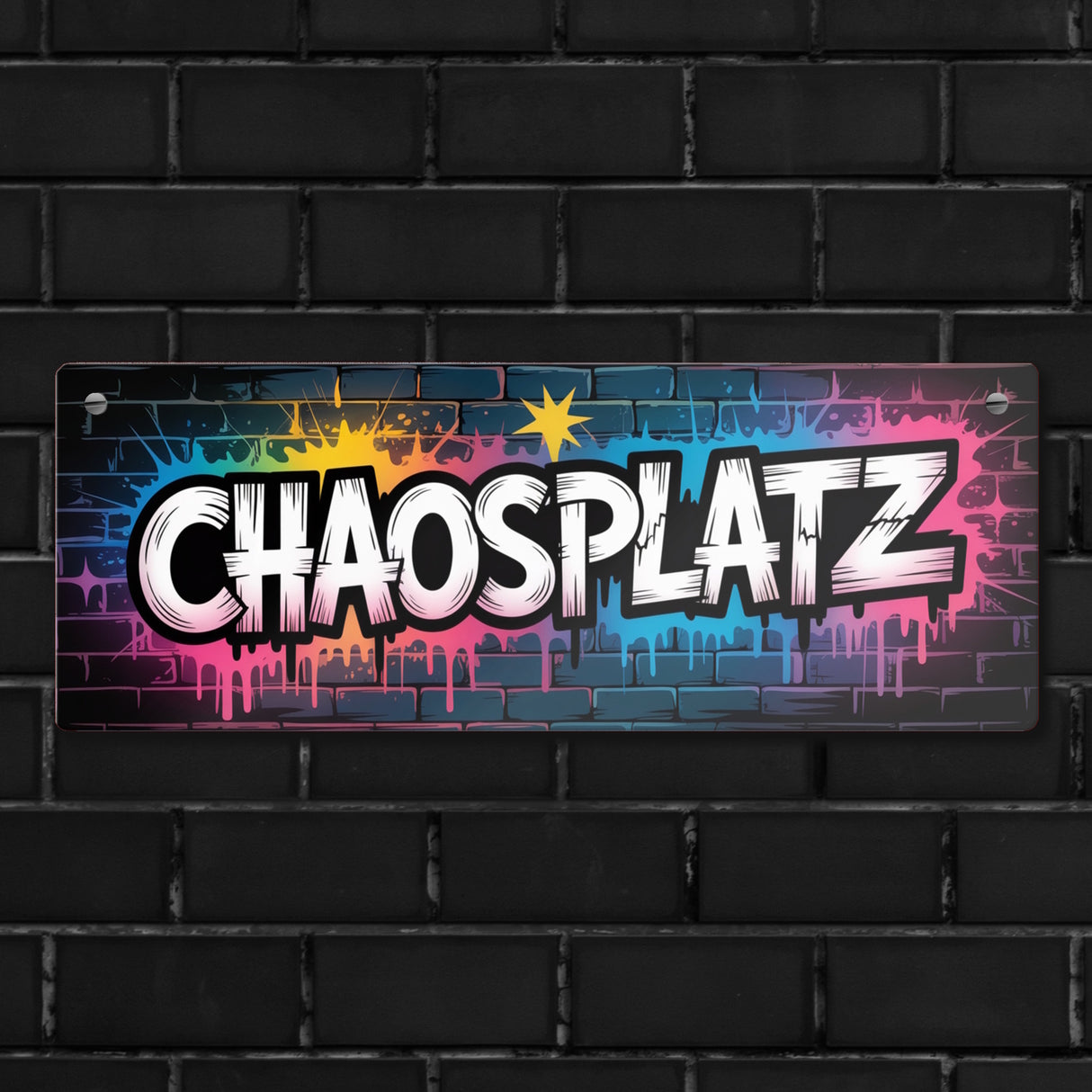 - Erlebe das ultimative Streetart-Erlebnis mit dem Chaosplatz Graffiti Metallschild! Mit seinem dynamischen Design aus tropfenden Neonfarben und dem abenteuerlichen Schriftzug "Chaosplatz" bringt es urbanen Flair in dein Zuhause. Der Hintergrund aus tiefem Schwarz, inspiriert von Ziegelwänden, verleiht deinem Raum eine rebellische, nächtliche Atmosphäre.