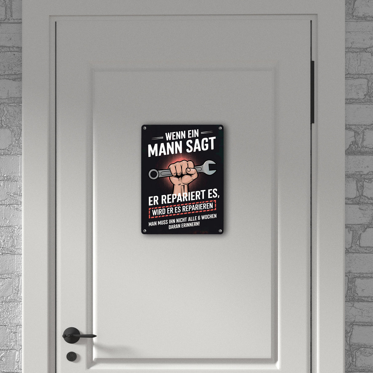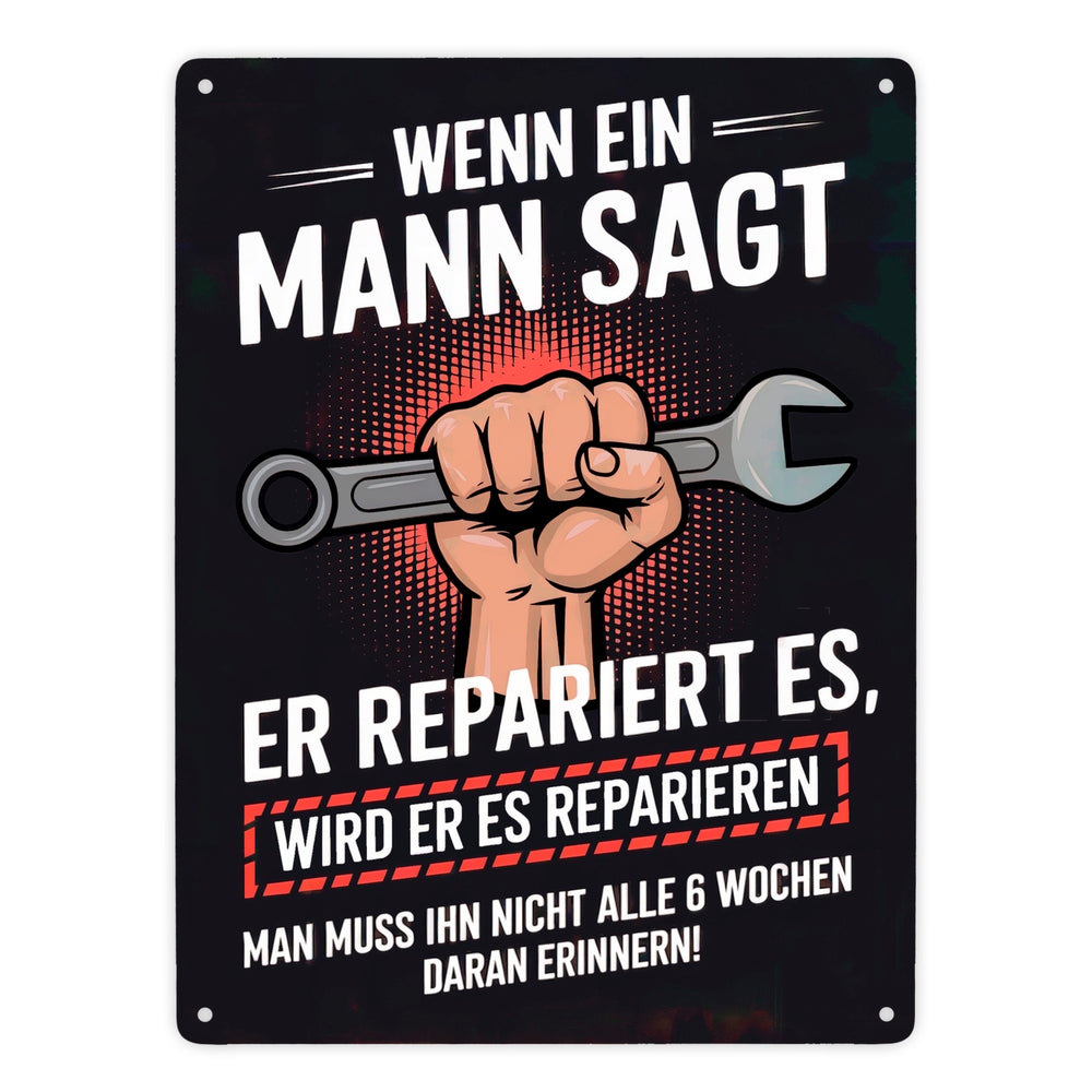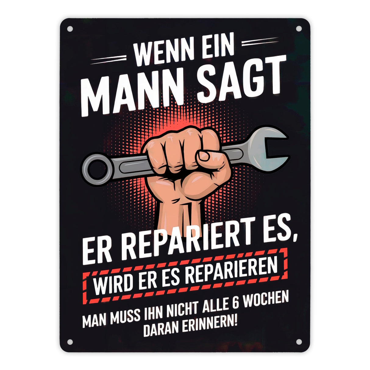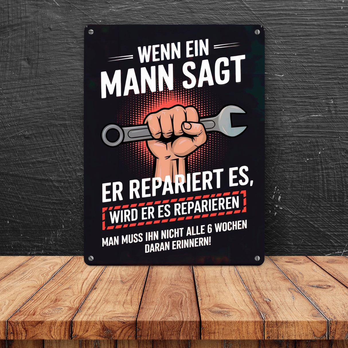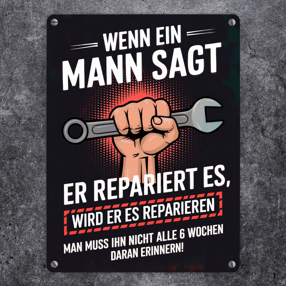 - Du suchst nach einem Geschenk für den Heimwerkerkönig in deinem Leben? Dieses Metallschild ist genau das Richtige! Mit einer geballten Faust und Schraubenschlüssel sorgt es für Lacher und zeigt, dass er mit seinem handwerklichen Geschick zuverlässig zur Stelle ist – irgendwann. Passt perfekt in jede Männerhöhle!