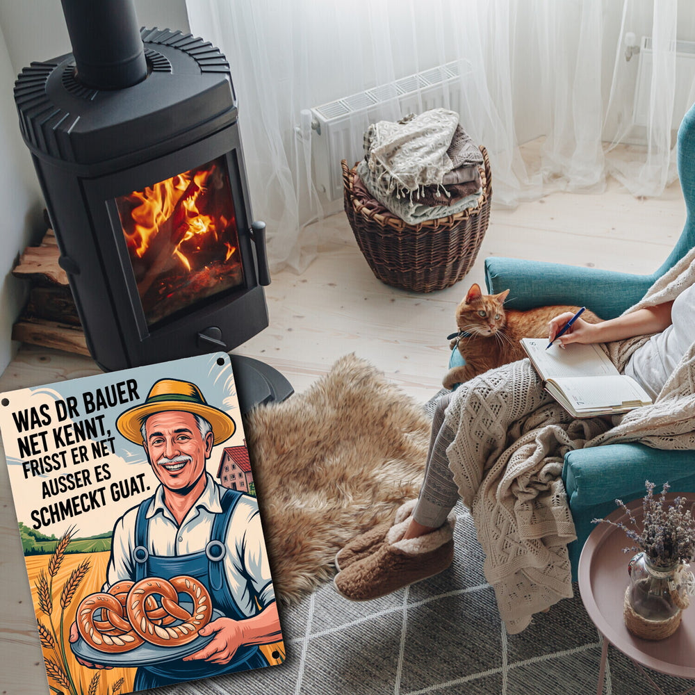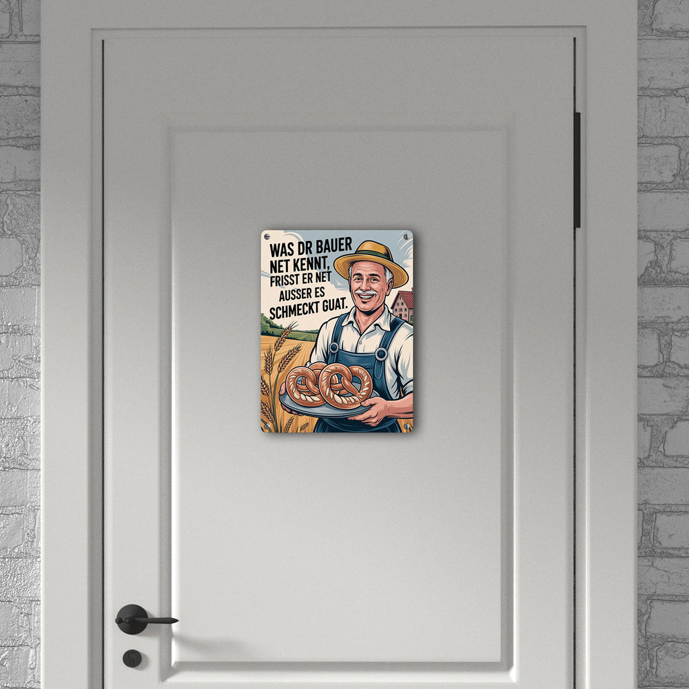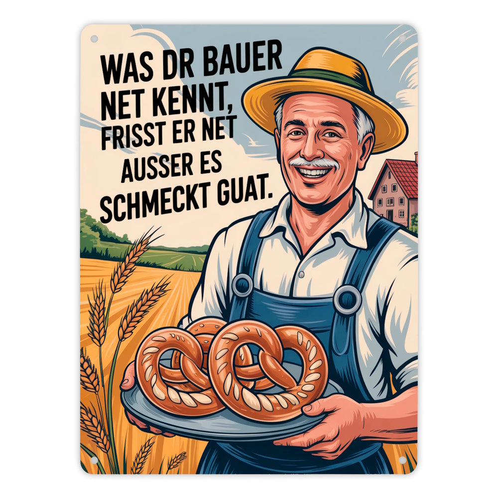 - Dieses charmante Metallschild zeigt einen fröhlichen schwäbischen Bauern im Vintage-Stil. Der Bauer mit Strohhut und Latzhose präsentiert stolz seine köstlichen Brezeln, während im Hintergrund ein idyllisches Weizenfeld und ein traditionelles Bauernhaus zu sehen sind. Der schwäbische Spruch 'Was dr Bauer net kennt, frisst er net ausser es schmeckt guat' vollendet die rustikale Szenerie.