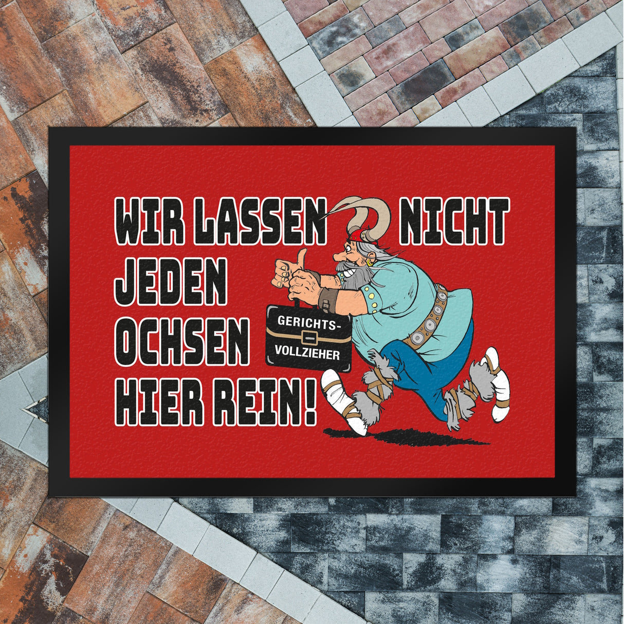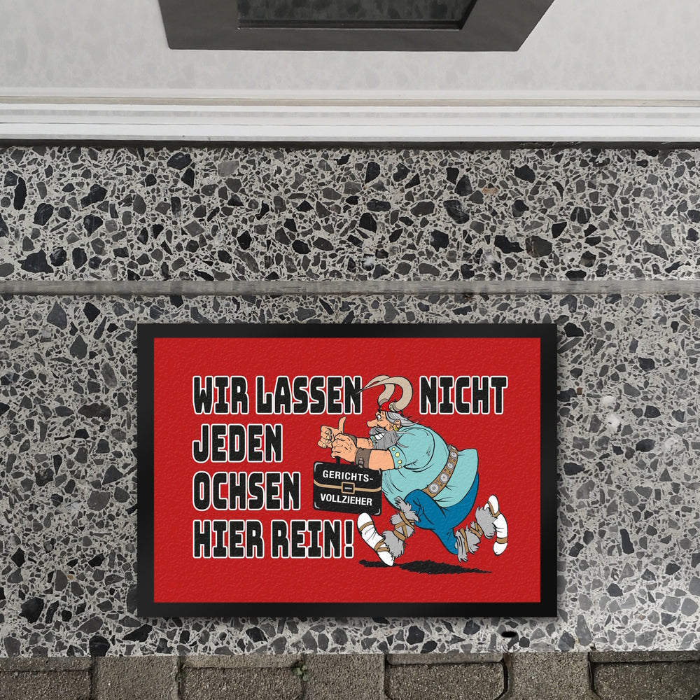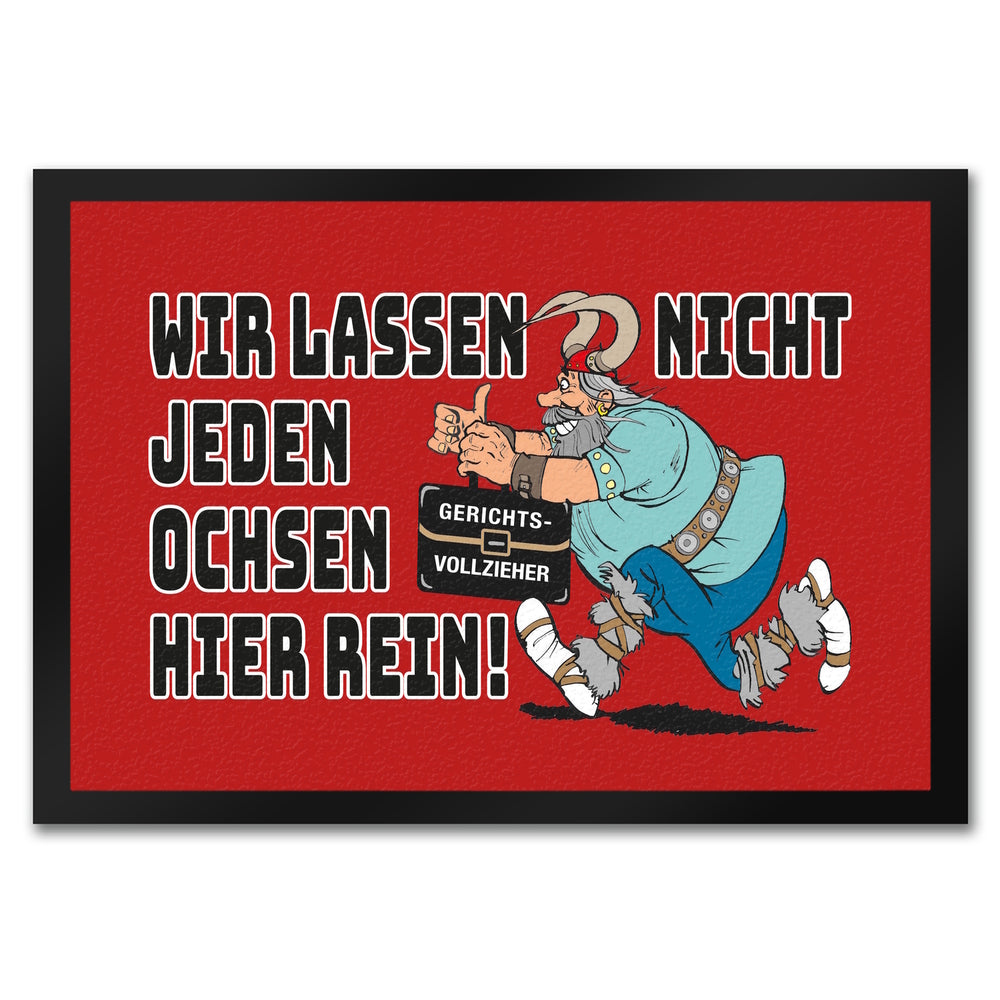 - Diese humorvolle Fußmatte besticht durch ein witziges Comicmotiv: Ein gallischer Krieger mit markanten Hörnern, der eine Aktenmappe schleppt. Der Spruch "Wir lassen nicht jeden Ochsen hier rein. Gerichtsvollzieher" sorgt garantiert für Schmunzeln und ist ein echter Hingucker vor jeder Tür.