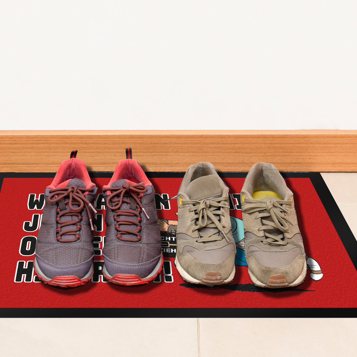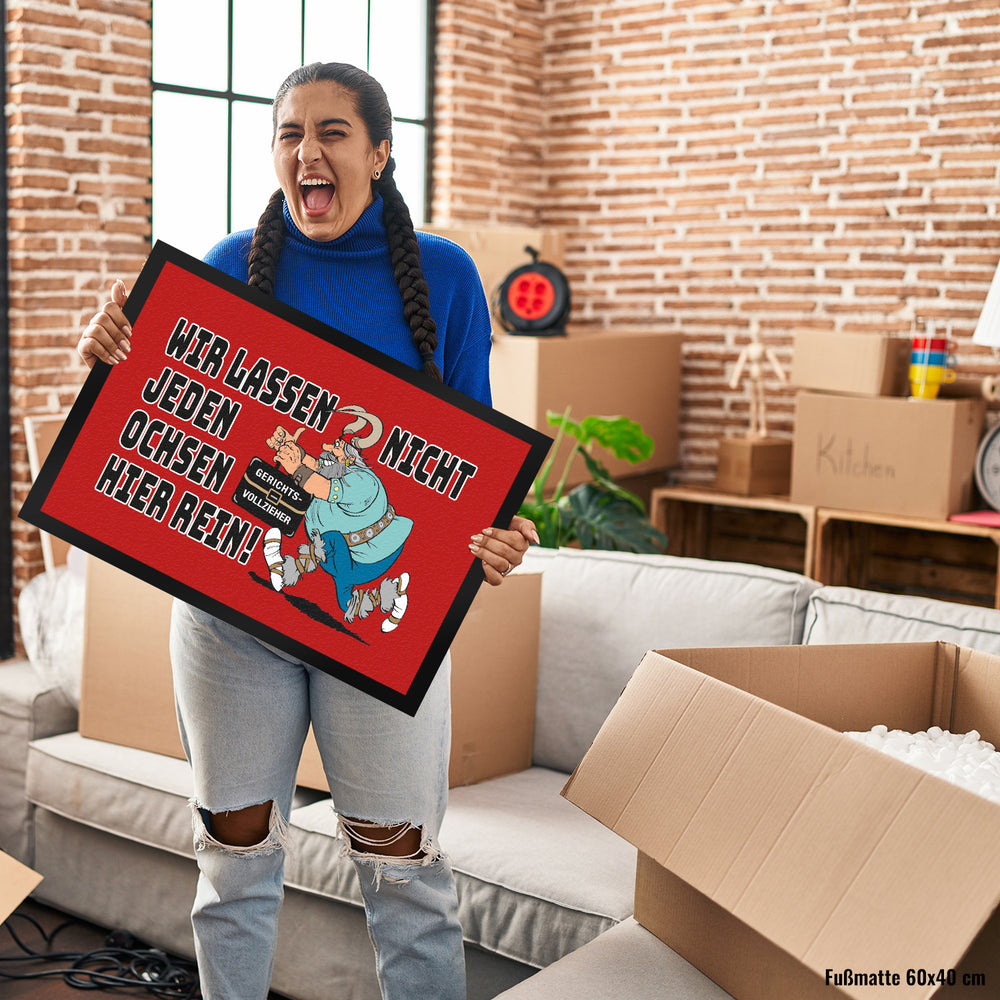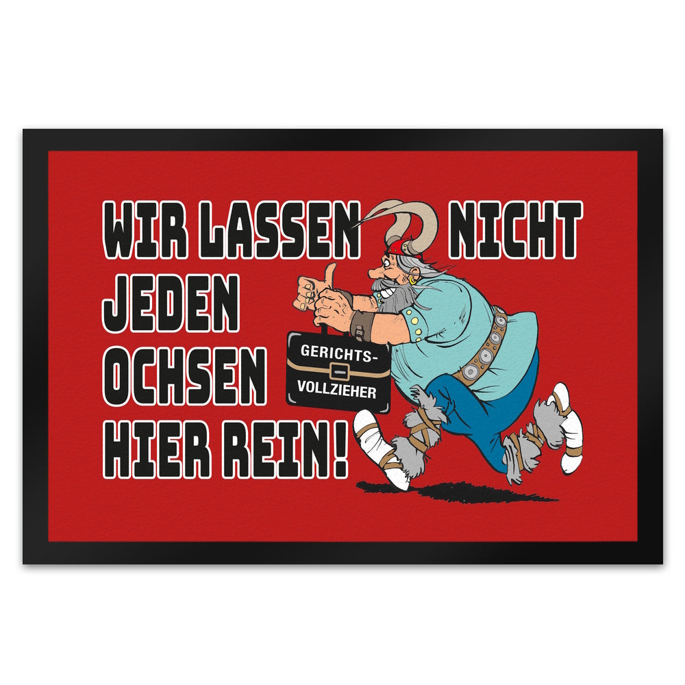 - Diese humorvolle Fußmatte besticht durch ein witziges Comicmotiv: Ein gallischer Krieger mit markanten Hörnern, der eine Aktenmappe schleppt. Der Spruch "Wir lassen nicht jeden Ochsen hier rein. Gerichtsvollzieher" sorgt garantiert für Schmunzeln und ist ein echter Hingucker vor jeder Tür.