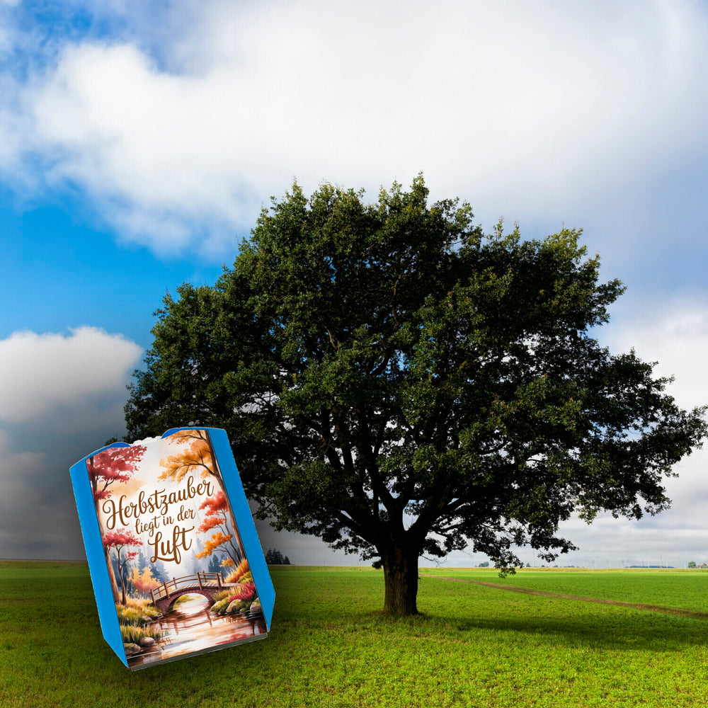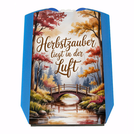 - Diese lustige Parkscheibe zeigt eine herbstliche Waldszene mit einer charmanten hölzernen Brücke. Die Landschaft ist in warmen Herbstfarben gehalten, mit rot-goldenen Bäumen und sanften Blautönen für die Berge im Hintergrund. Ein sanfter Fluss spiegelt den Herbstzauber wider und der freche Spruch „Herbstzauber liegt in der Luft“ setzt das i-Tüpfelchen auf das Design.