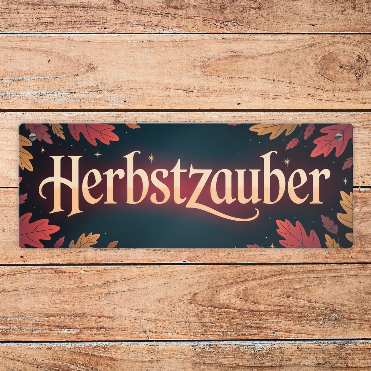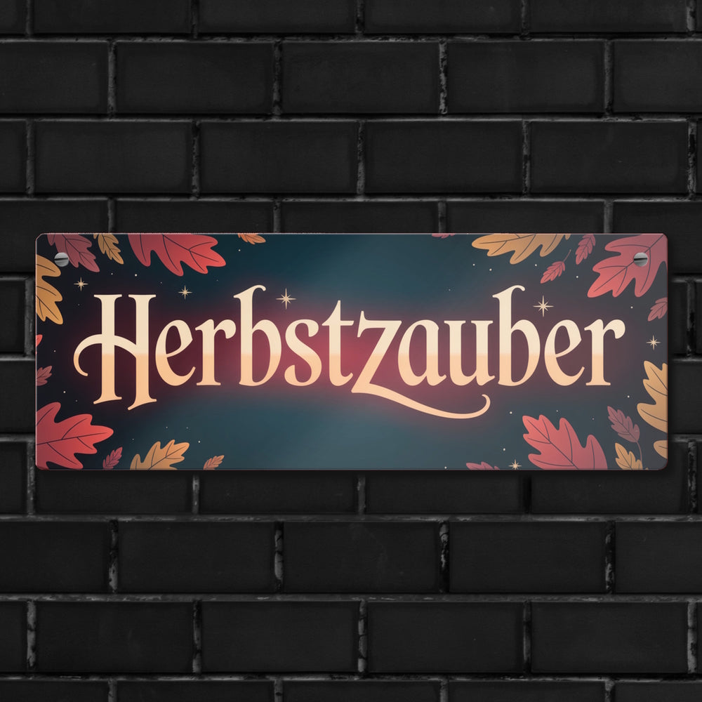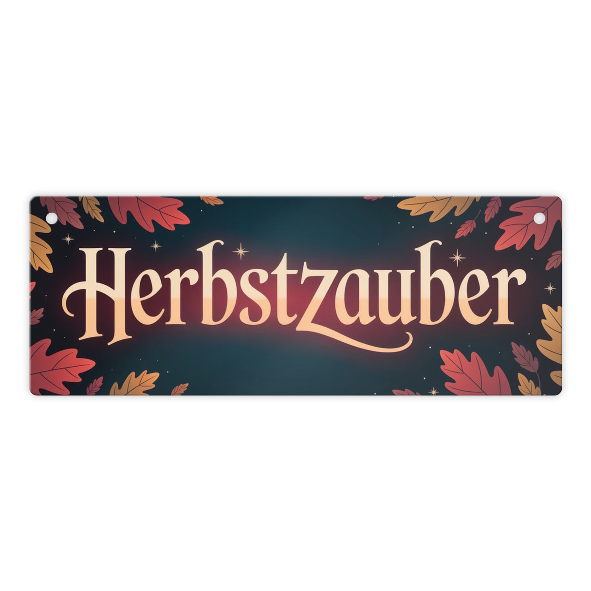 - Ein Metallschild, das den Herbst in seiner ganzen magischen Pracht einfängt! Mit leuchtendem Goldschriftzug "Herbstzauber" vor einem tiefen Indigo-Hintergrund, glitzernden Sternen und stilisierten, wirbelnden Herbstblättern in Rottönen und Orange. Ein wahres Schmuckstück für jeden Raum!