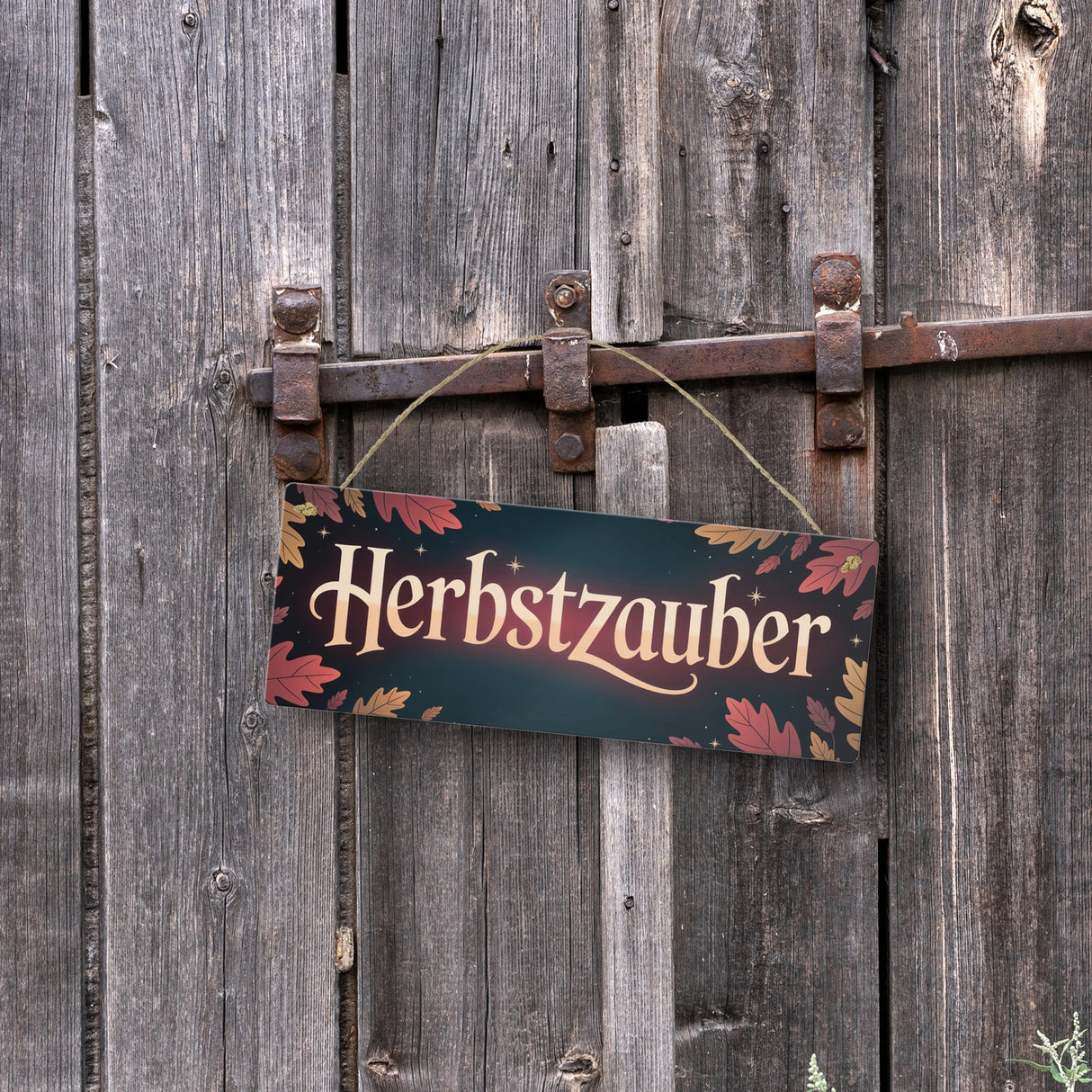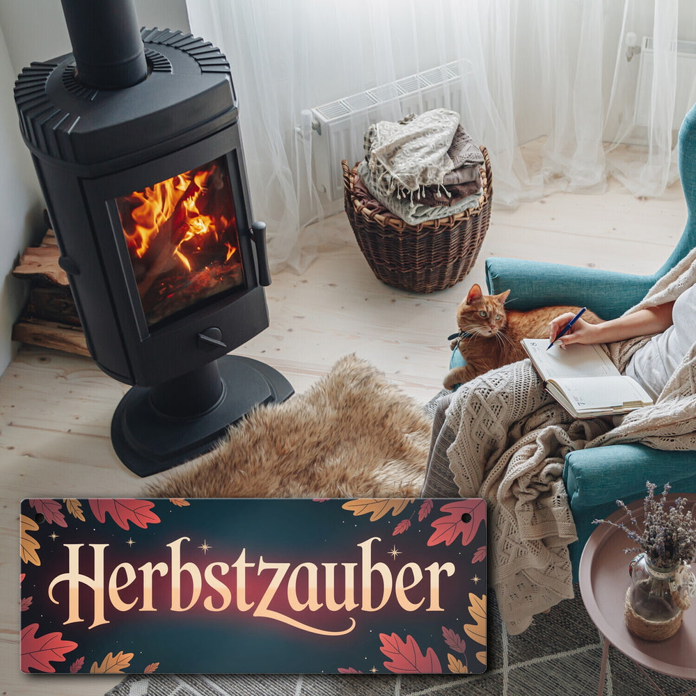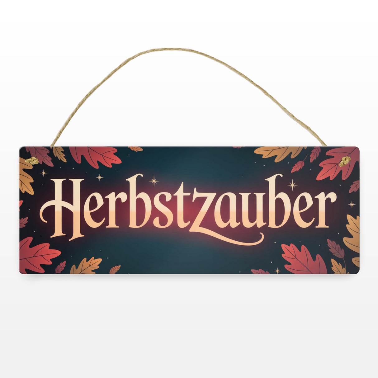 - Ein Metallschild, das den Herbst in seiner ganzen magischen Pracht einfängt! Mit leuchtendem Goldschriftzug "Herbstzauber" vor einem tiefen Indigo-Hintergrund, glitzernden Sternen und stilisierten, wirbelnden Herbstblättern in Rottönen und Orange. Ein wahres Schmuckstück für jeden Raum!