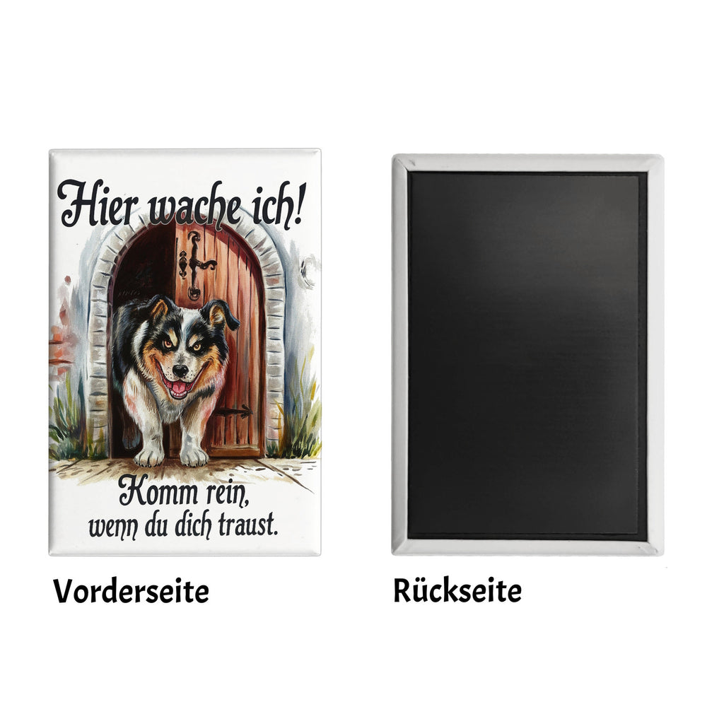 - Entdecke den lustigen Kühlschrankmagneten mit dem charmanten "Hund bewacht Tür"-Motiv! Der rechteckige Magnet zeigt einen fröhlichen Border Collie, der mit einem schelmischen Grinsen aus einer Holztür hervorschaut. Der Hund besitzt ein schwarz-weiß-braunes Fell und streckt freudig die Zunge heraus. Umgeben von einer steinernen Mauer, versprüht das Design einladenden Charme.