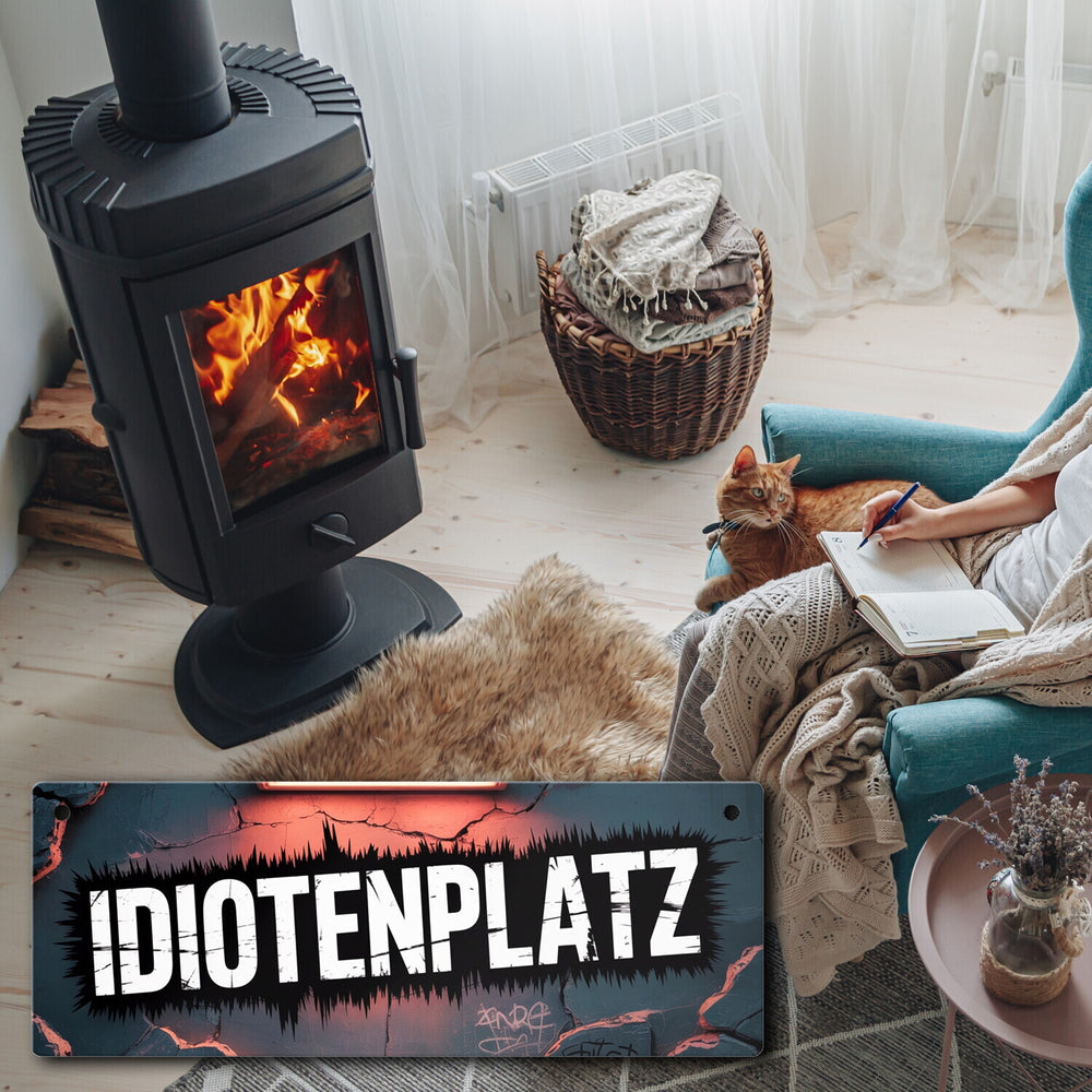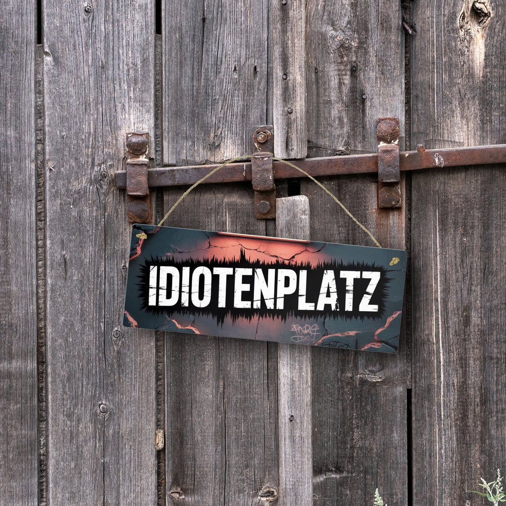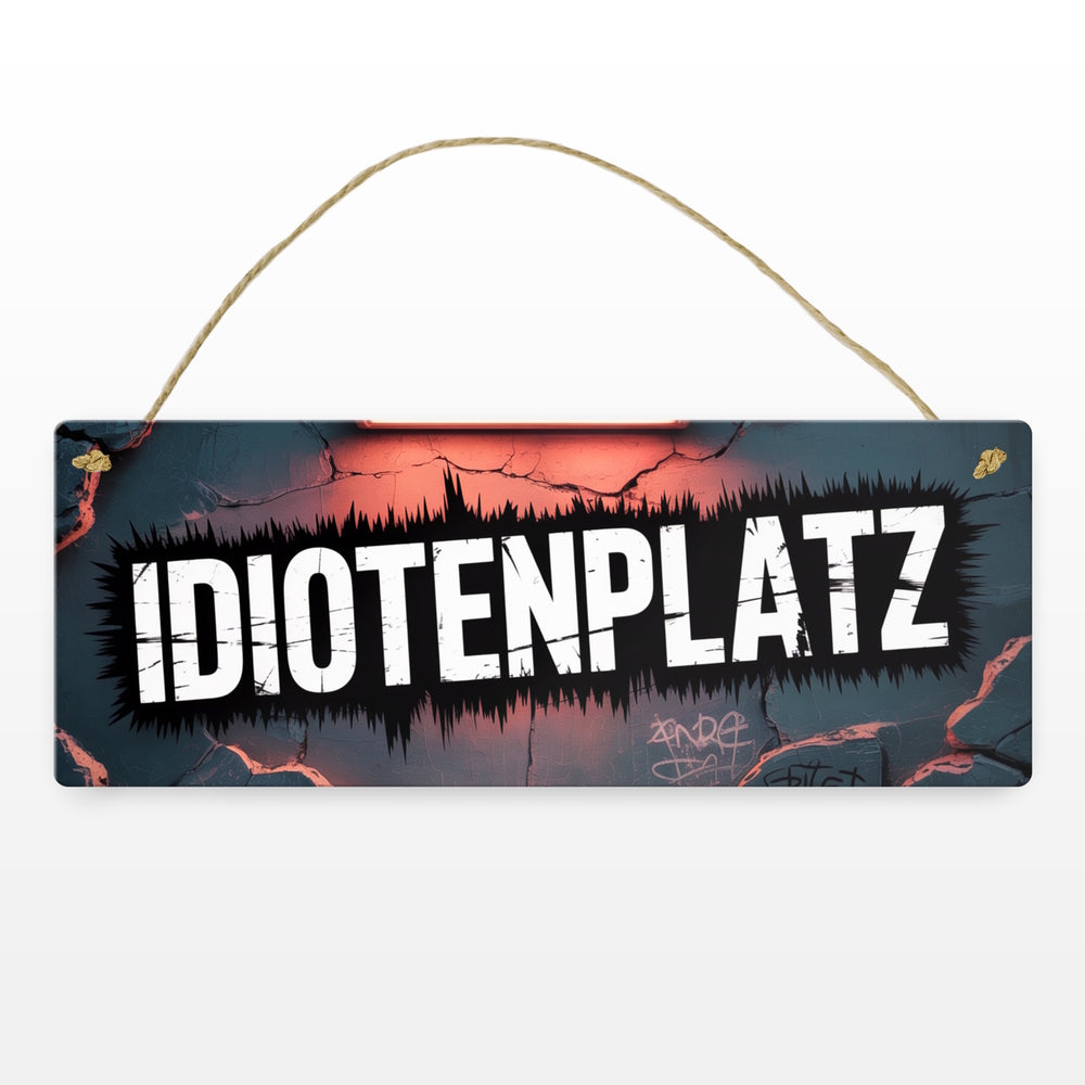 - Dieses Metallschild im Graffiti Design zeigt den deutschen Ausdruck "Idiotenplatz" in auffälliger, abgenutzter Schrift auf einer rissigen Betonwand. Abblätternde Farbe, subtile Graffiti-Tags und rostfarbene Flecken verleihen ihm eine authentische urbane Ästhetik. Ein schwaches rotes Leuchten eines flackernden Neonlichts sorgt für eine rebellische Atmosphäre.