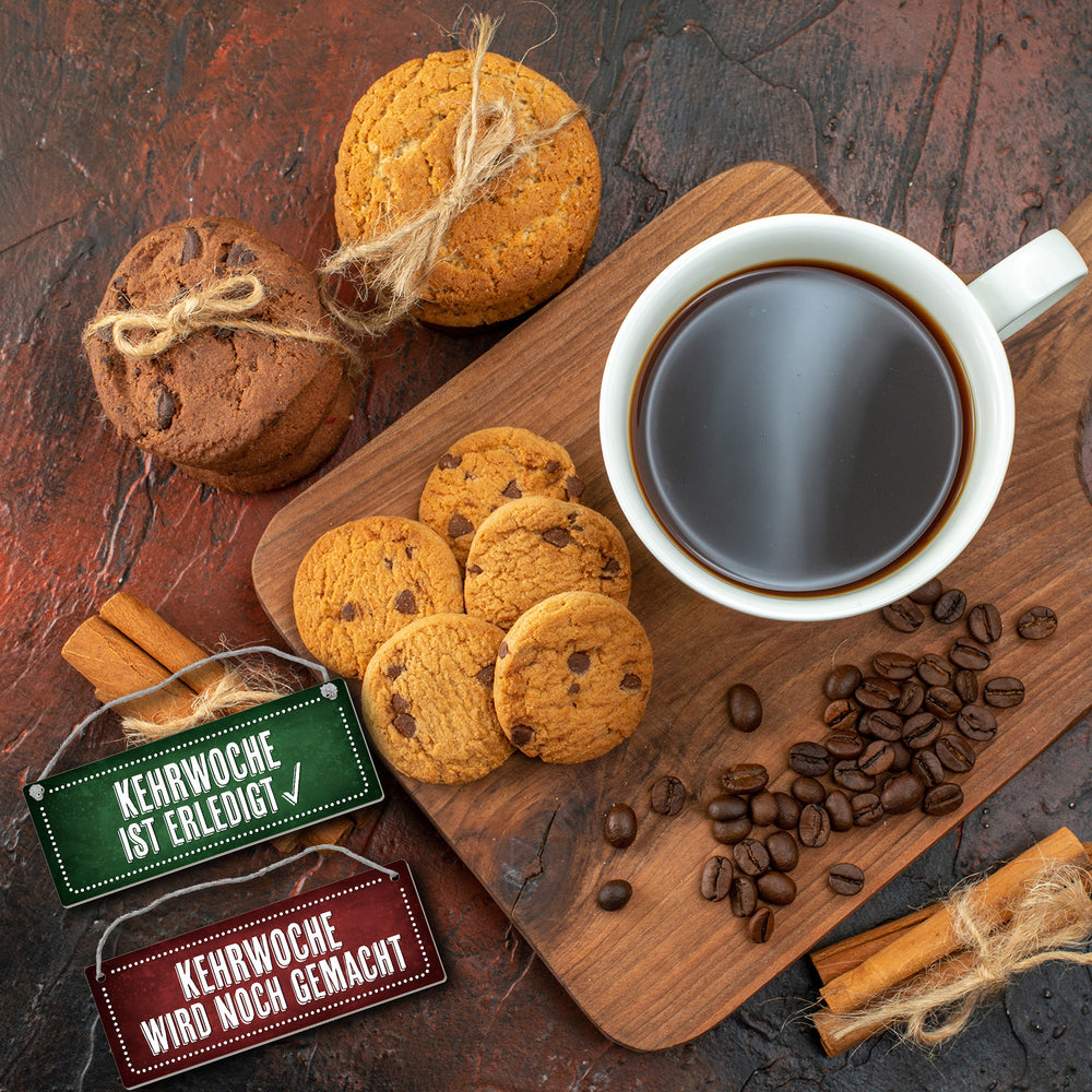 - Lieferumfang: 1x Kehrwoche wird noch gemacht oder ist erledigt Wendeschild mit Kordel in Rot-grün