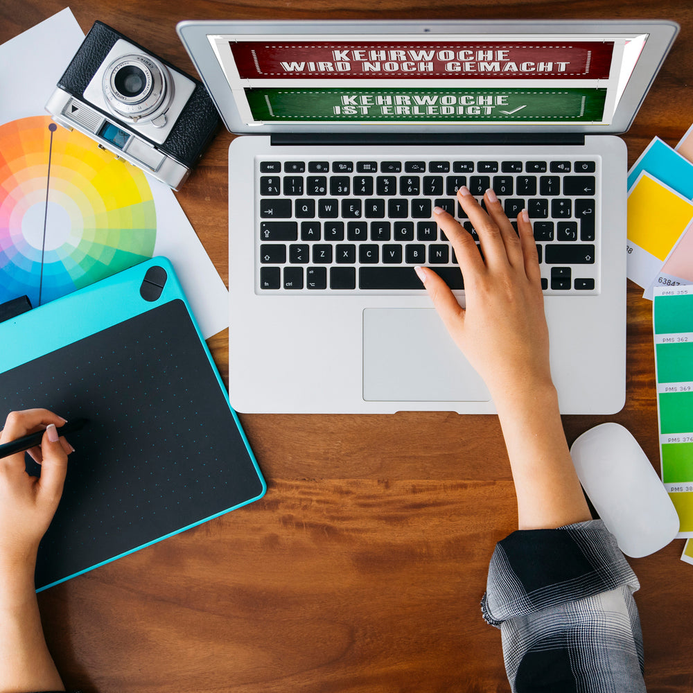 - Vorderseite: Kehrwoche wird noch gemacht - Rückseite: Kehrwoche ist erledigt