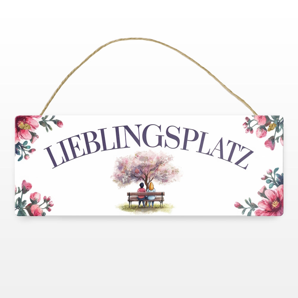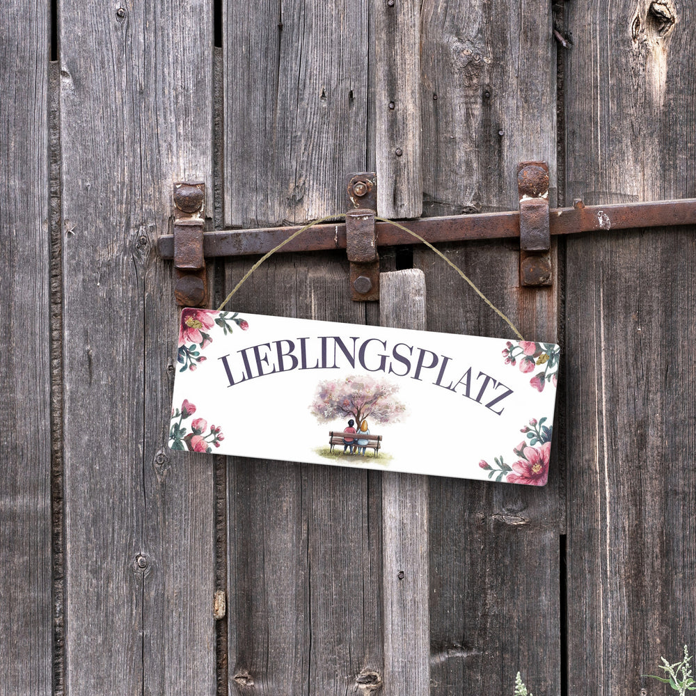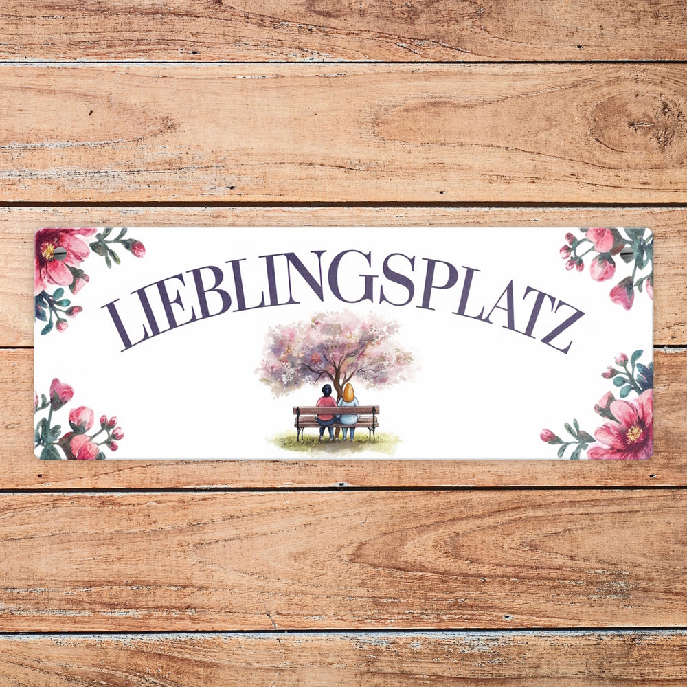 - Das Metallschild im Format 75x200 cm ist eine Augenweide. Mit zauberhaften Aquarell-Pastellfarben und weißen Hintergrund präsentiert es die deutsche Aufschrift "LIEBLINGSPLATZ" in Großbuchstaben. Zwei Menschen sitzen gemütlich auf einer Bank unter einem blühenden Baum, umrahmt von rosa Blumen – pure Romantik und Geborgenheit!