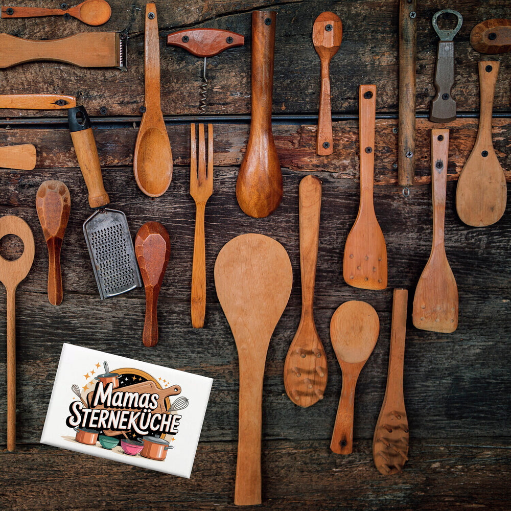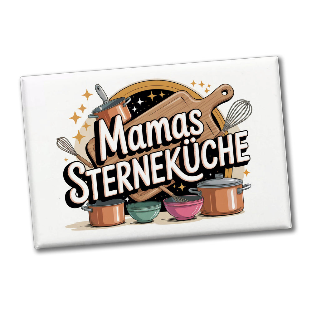 - Der Magnet "Mamas Sterneküche" besticht durch eine verspielte Illustration von Küchenutensilien. Der Spruch ist in einer handgeschriebenen, verspielten Schriftart mit sternenbesetztem Rand gestaltet. Umgeben von Kupfertöpfen, Vintage-Schneebesen und bunten Keramikschüsseln, strahlt er eine gemütliche, heimelige Küchenatmosphäre aus.
