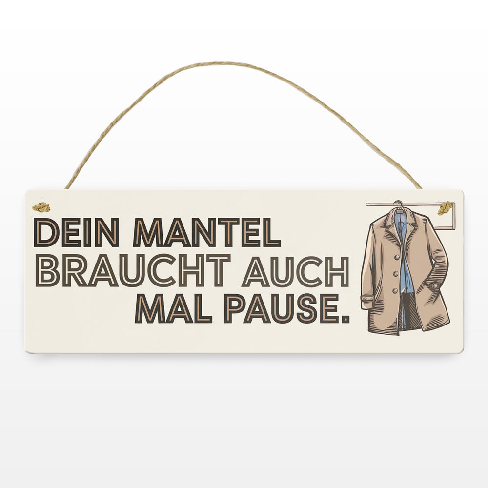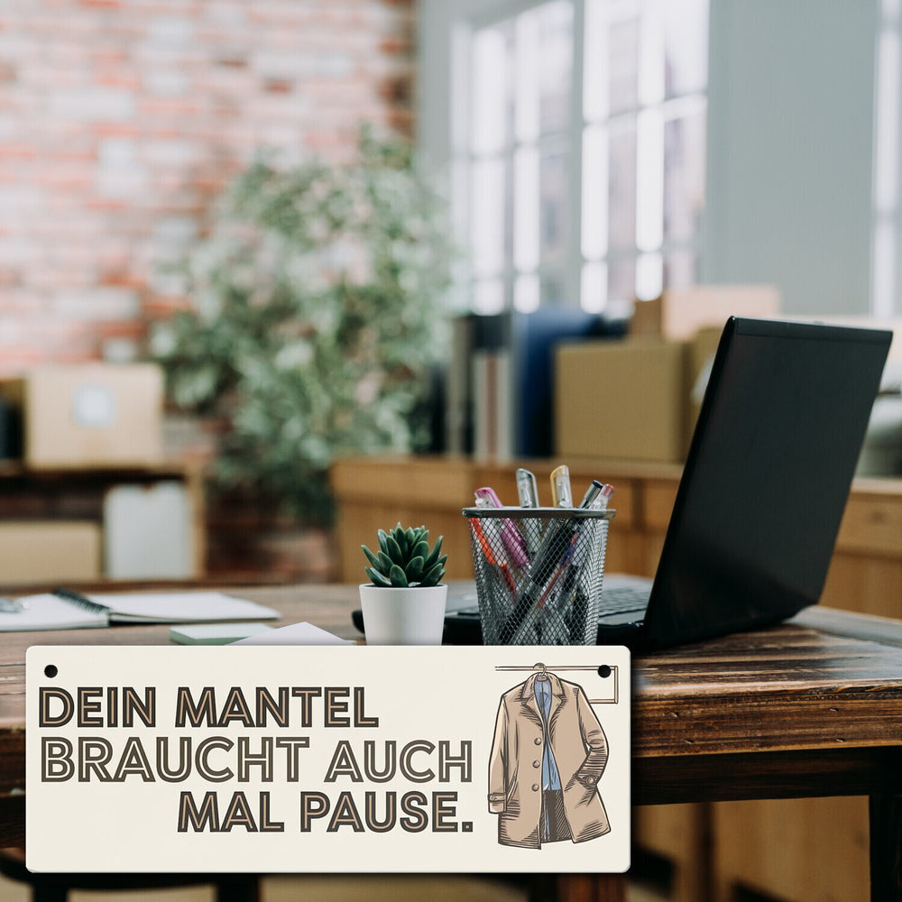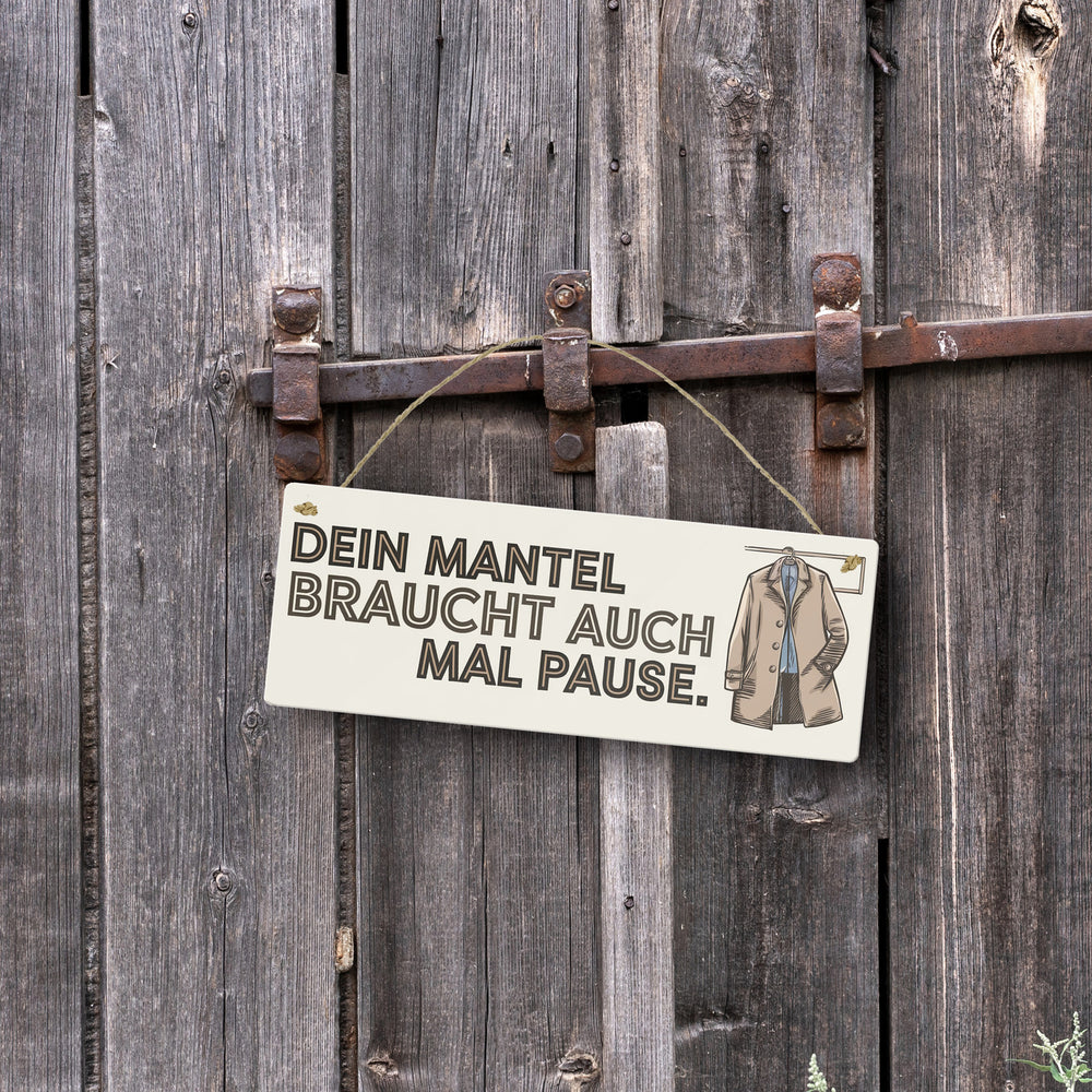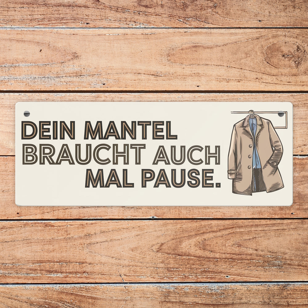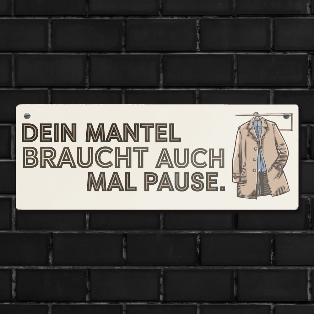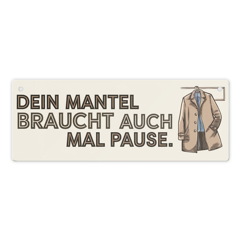 - Das Metallschild zeigt einen beigen Mantel, der auf einem hölzernen Kleiderständer hängt, mit einem blauen Innenfutter. Der Hintergrund ist hell und beige, während der Spruch "DEIN MANTEL BRAUCHT AUCH MAL PAUSE" in fetten, schwarzen Großbuchstaben darüber prangt. Die Illustration im Retro-Stil verleiht der Szene einen charmanten, humorvollen Touch.