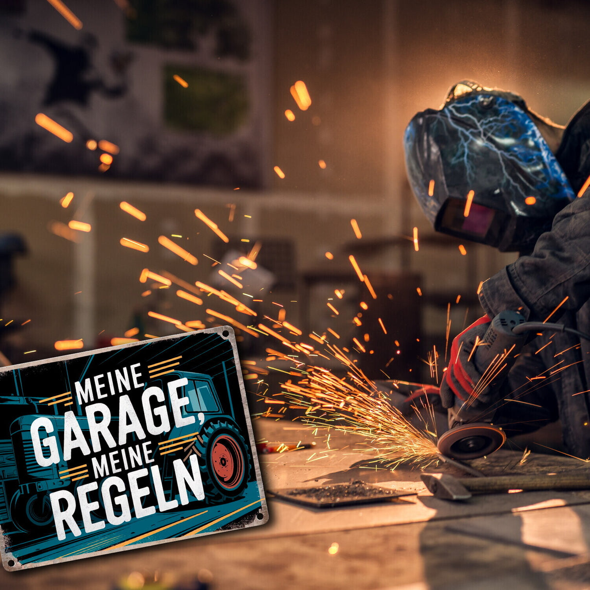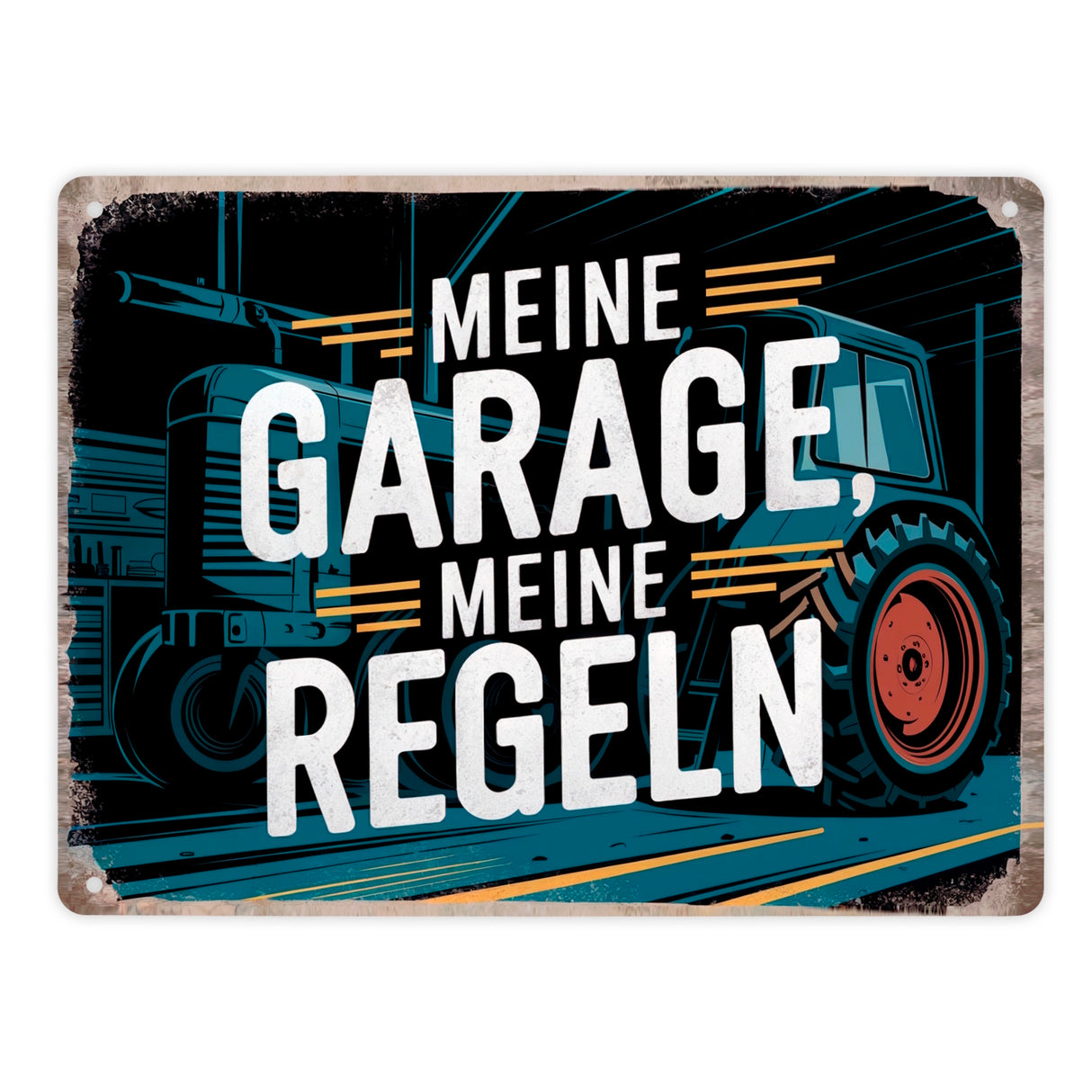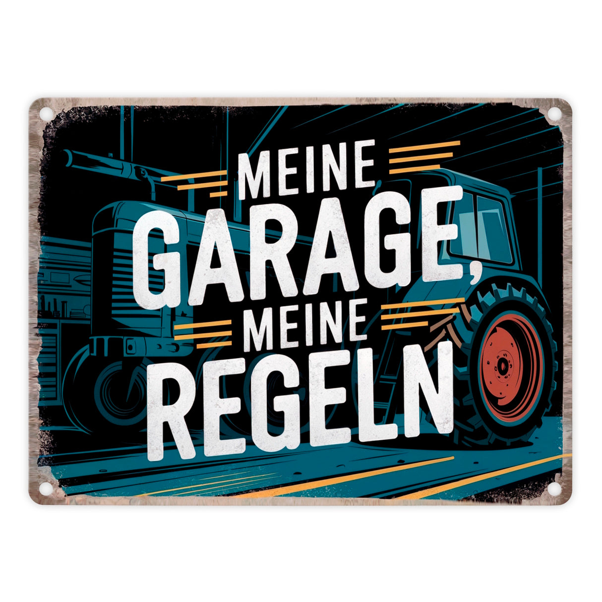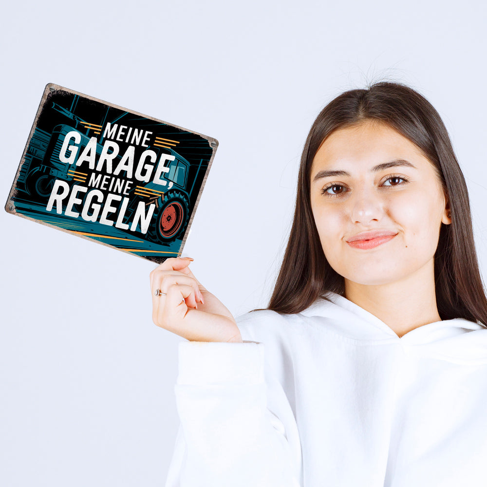 - Hast du je das Bedürfnis gehabt, deiner Garage eine humorvolle Note zu verleihen? Dann ist unser Metallschild "Meine Garage, meine Regeln" genau das Richtige! Mit einem Traktor im Mittelpunkt und einem rustikalen Hintergrund aus Werkzeugen und Ausrüstungen bringt es Vintage-Charme und klare Ansagen in jede Werkstatt.