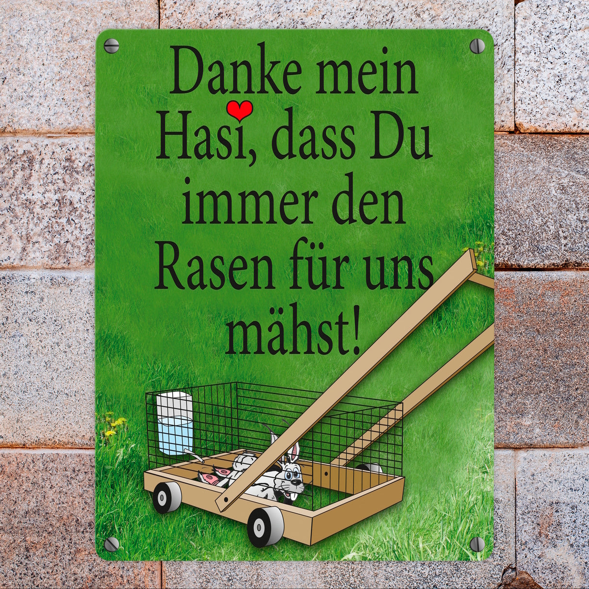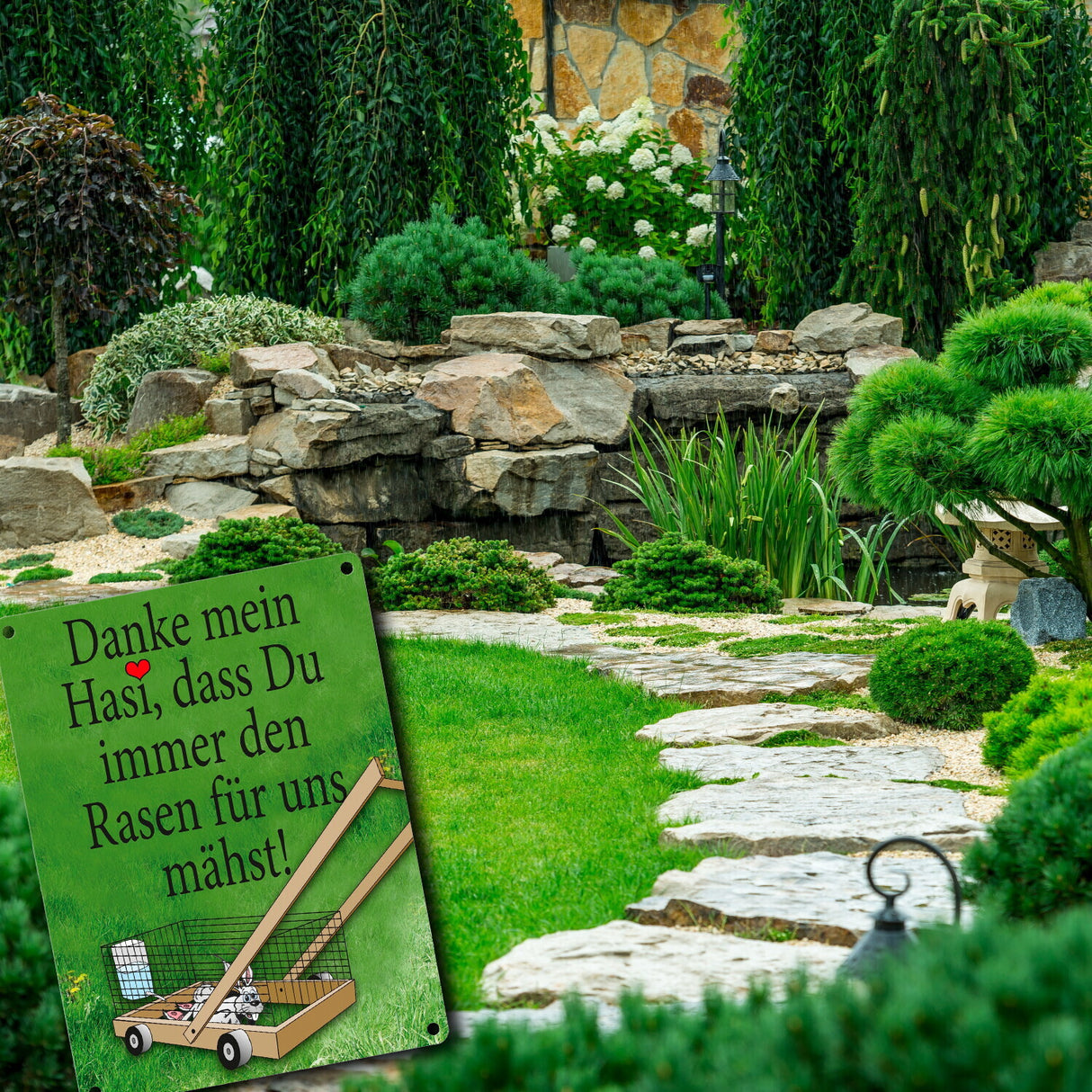 - Dieses Metallschild ist das perfekte Geschenk für alle Rasenmäher-Liebhaber! Ein Comic-Hase sitzt fröhlich in einem fahrbaren Käfig - bereit, den Garten zum Leuchten zu bringen. Ob als witzige Deko oder liebevolle Anerkennung, dieses Schild sagt ganz charmant: "Danke mein Hasi, dass du immer den Rasen für uns mähst!"