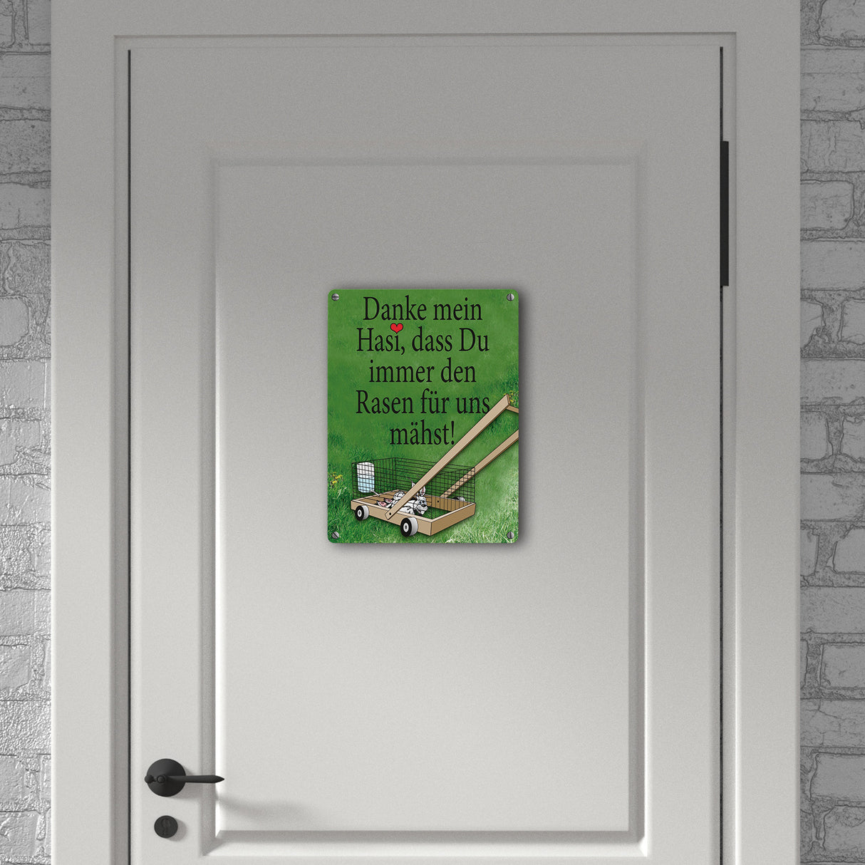 - 1x Metallschild in 15x20 cm Comic-Hase für Rasenmäher-Fans in der gewählten Größe