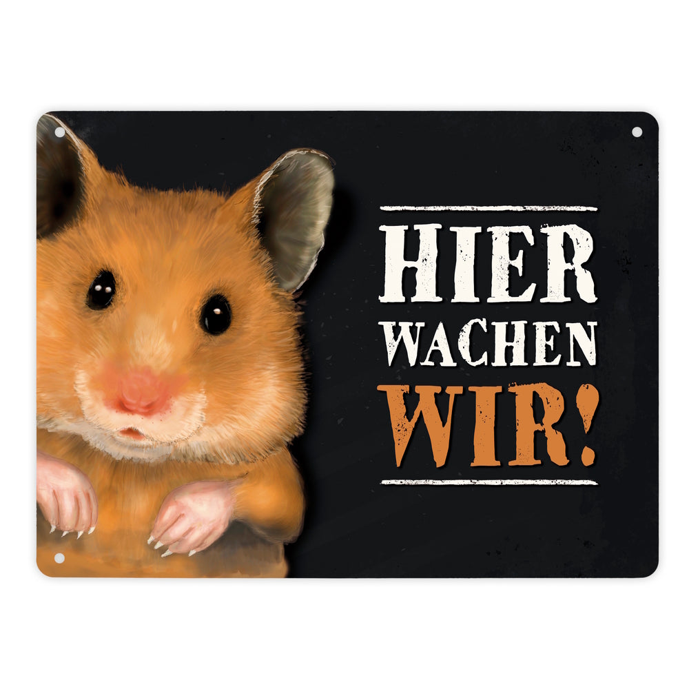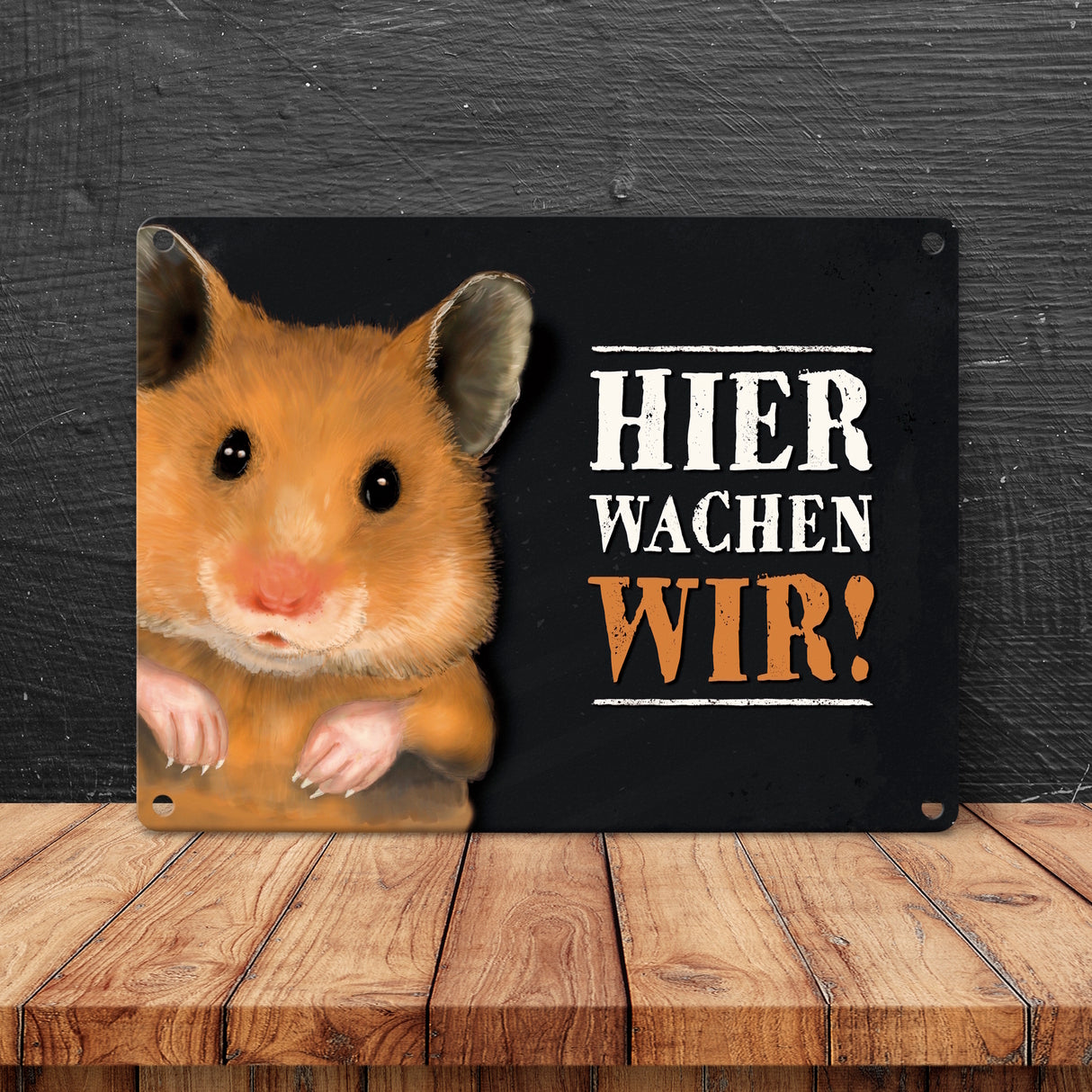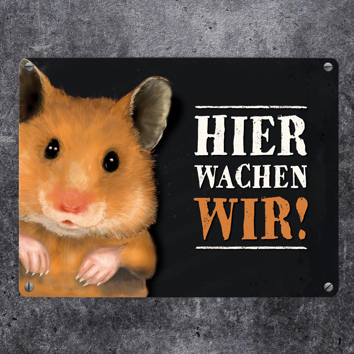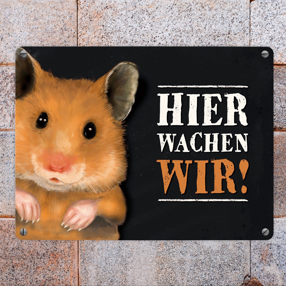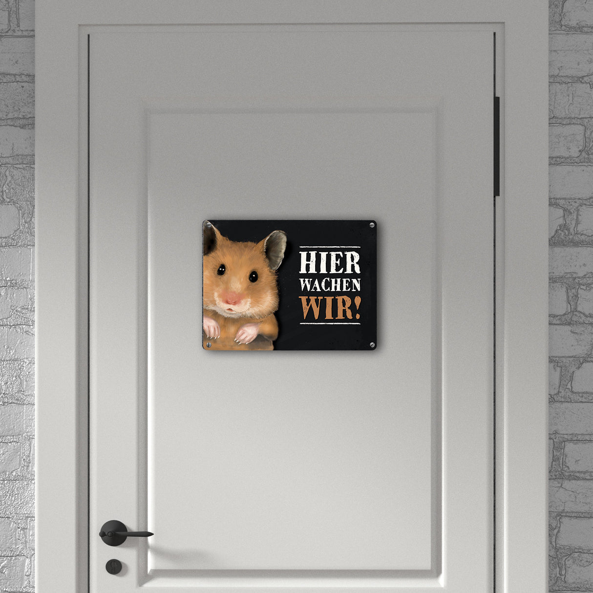 Metallschild mit Hamster Motiv und Spruch: Hier wachen wir!