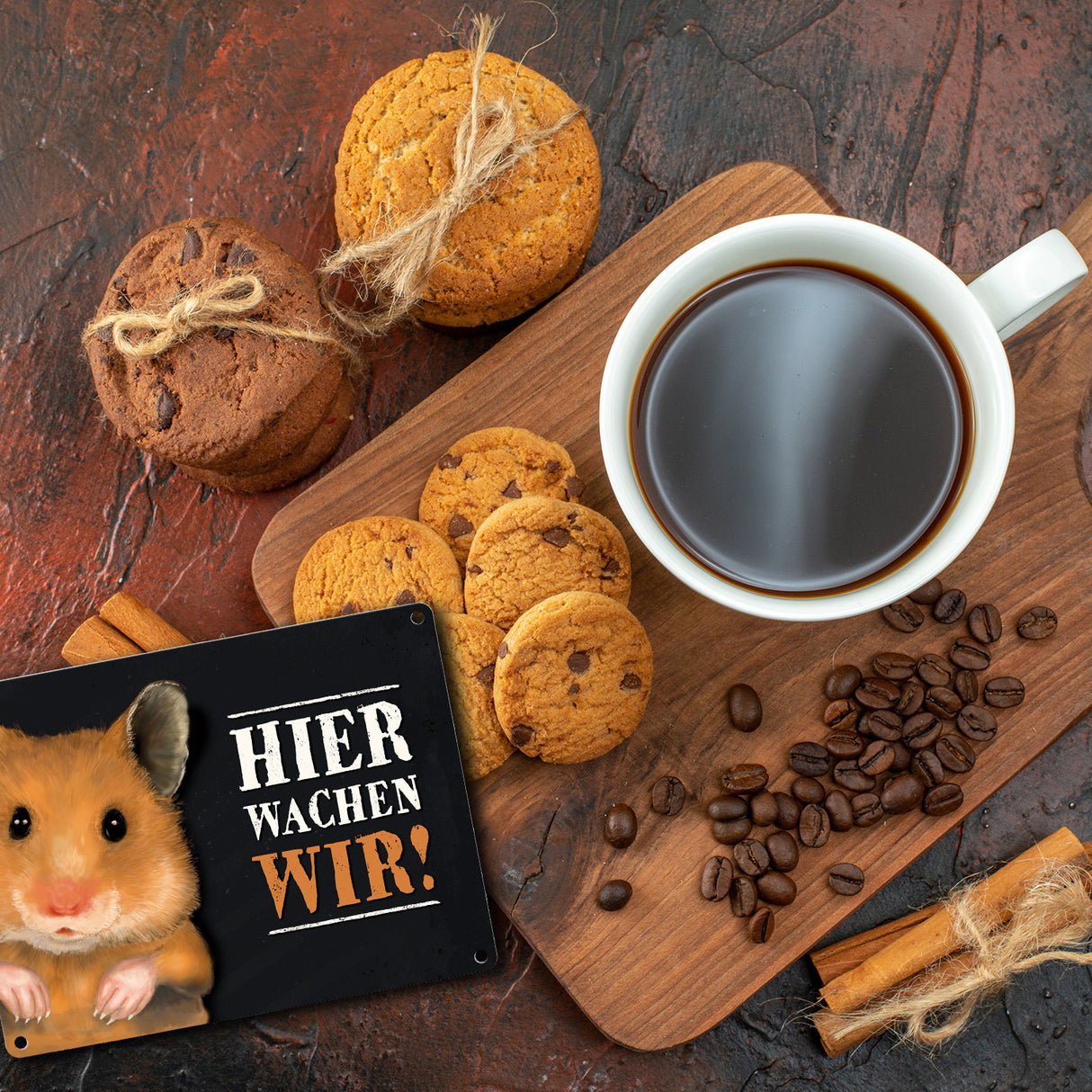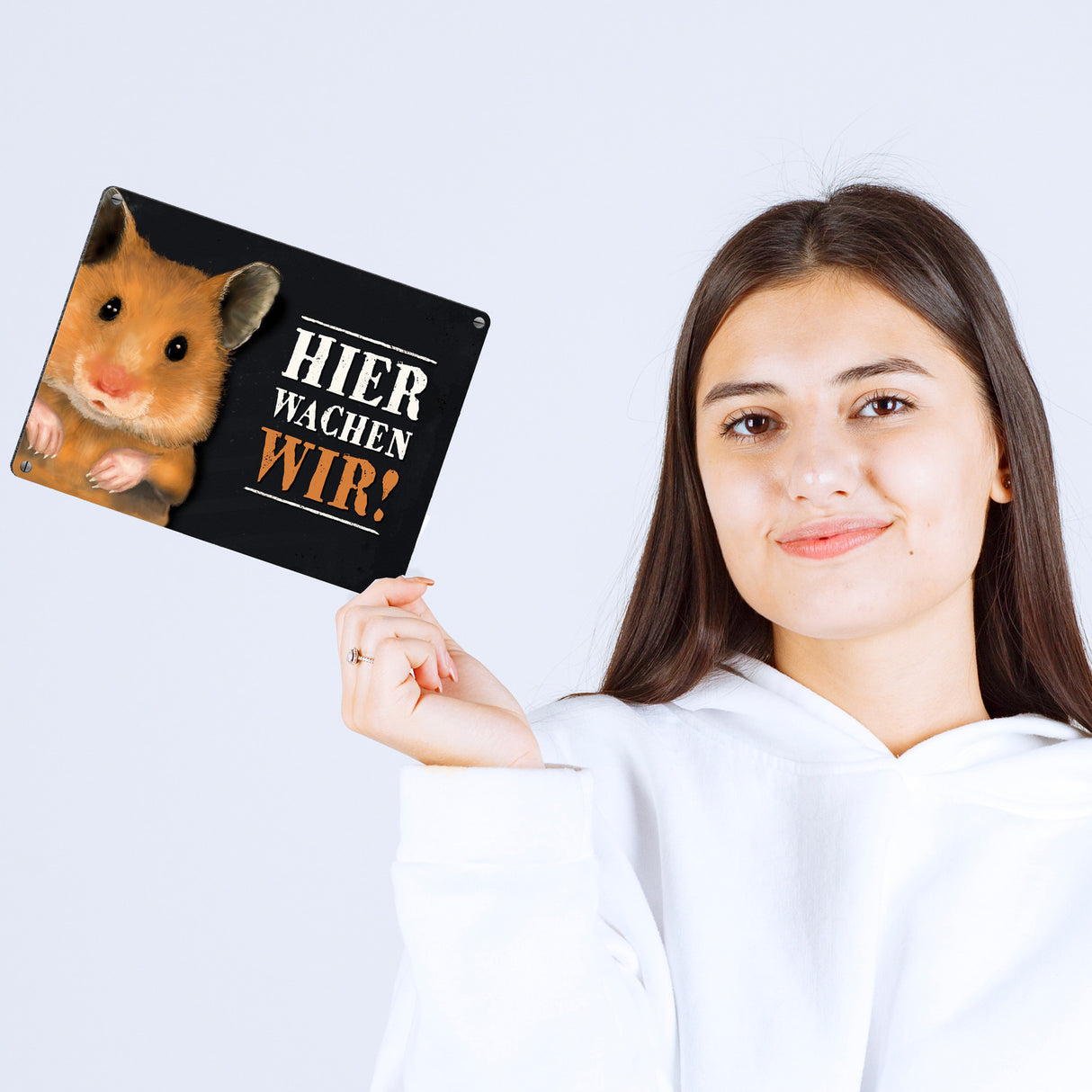 - 1x Metallschild mit Hamster Motiv und Spruch: Hier wachen wir! in der gewählten Größe