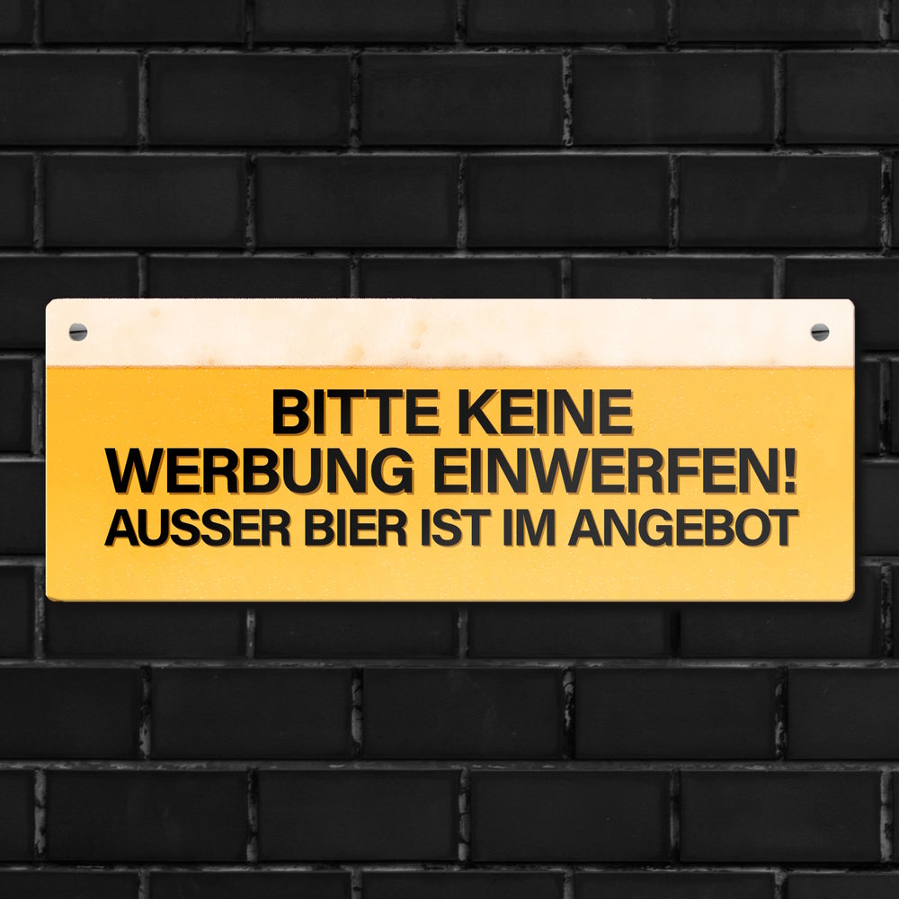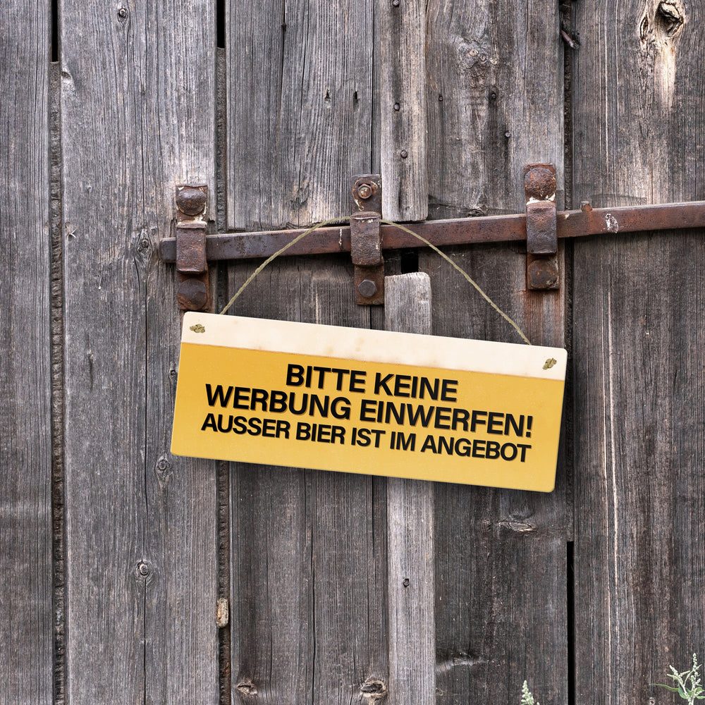 - 1x Metallschild mit Spruch: Bitte keine Werbung einwerfen! Außer Bier… in der gewählten Größe