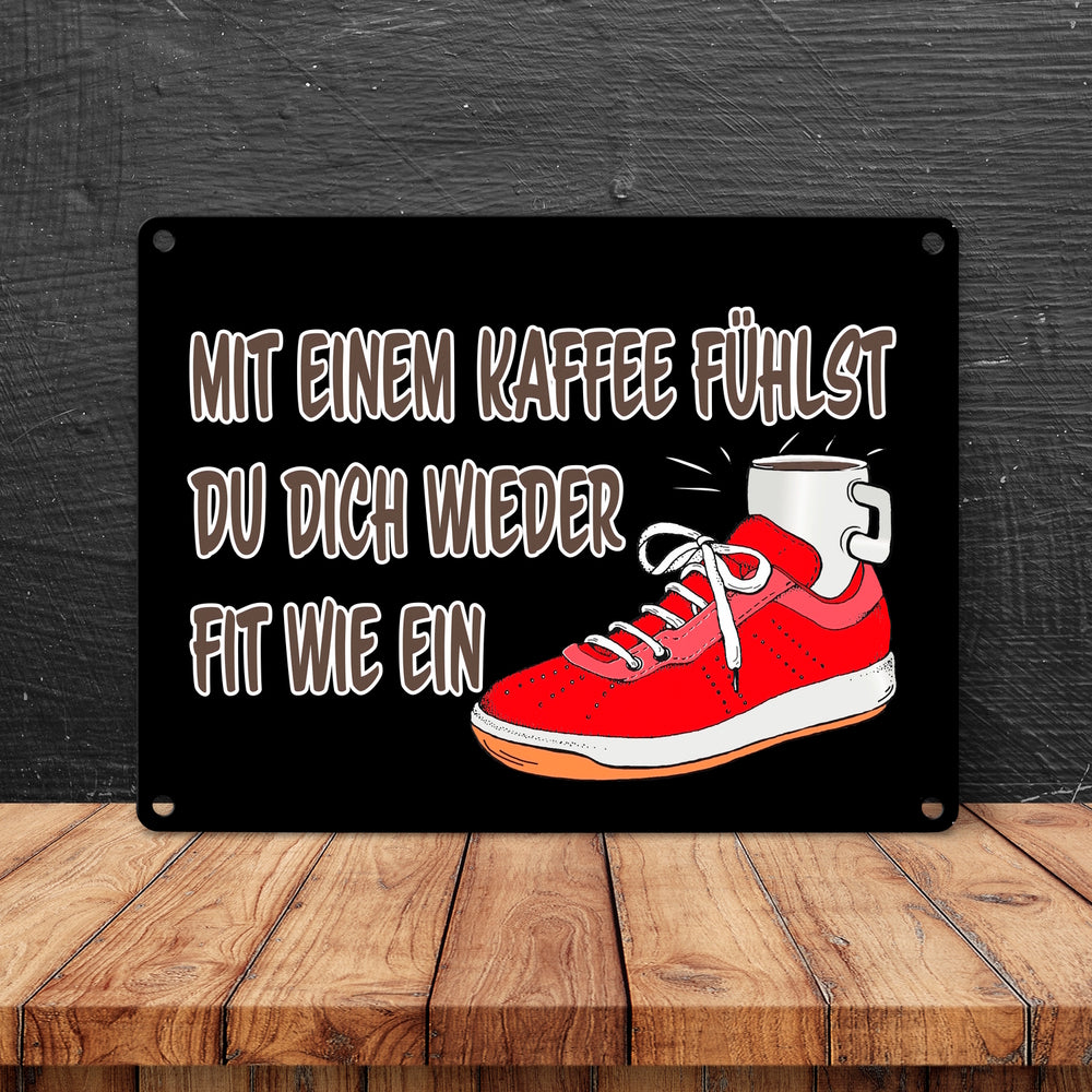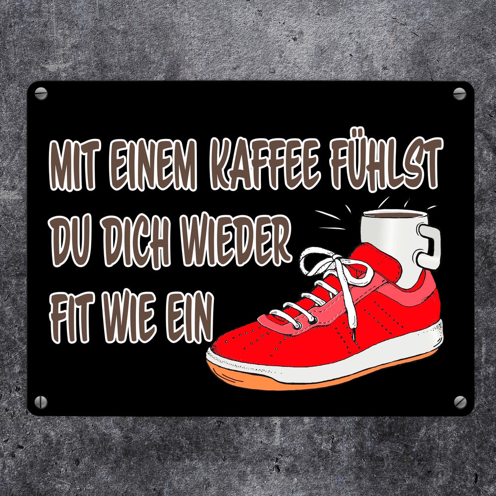 - Unser humorvolles Metallschild zeigt einen charmant gezeichneten roten Turnschuh, aus dem ein dampfender Kaffeebecher herausragt. Der witzige Spruch „Mit einem Kaffee fühlst du dich wieder fit wie ein Turnschuh“ bringt nicht nur Kaffee-Fans zum Schmunzeln, sondern sorgt garantiert für gute Laune in jeder Küche.