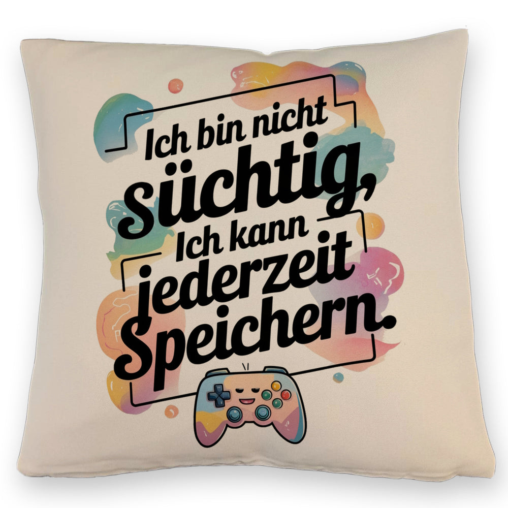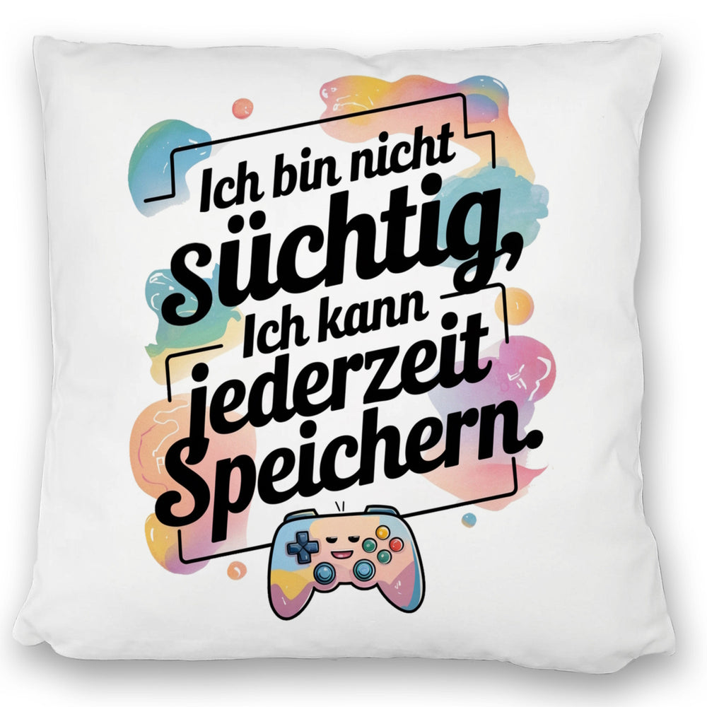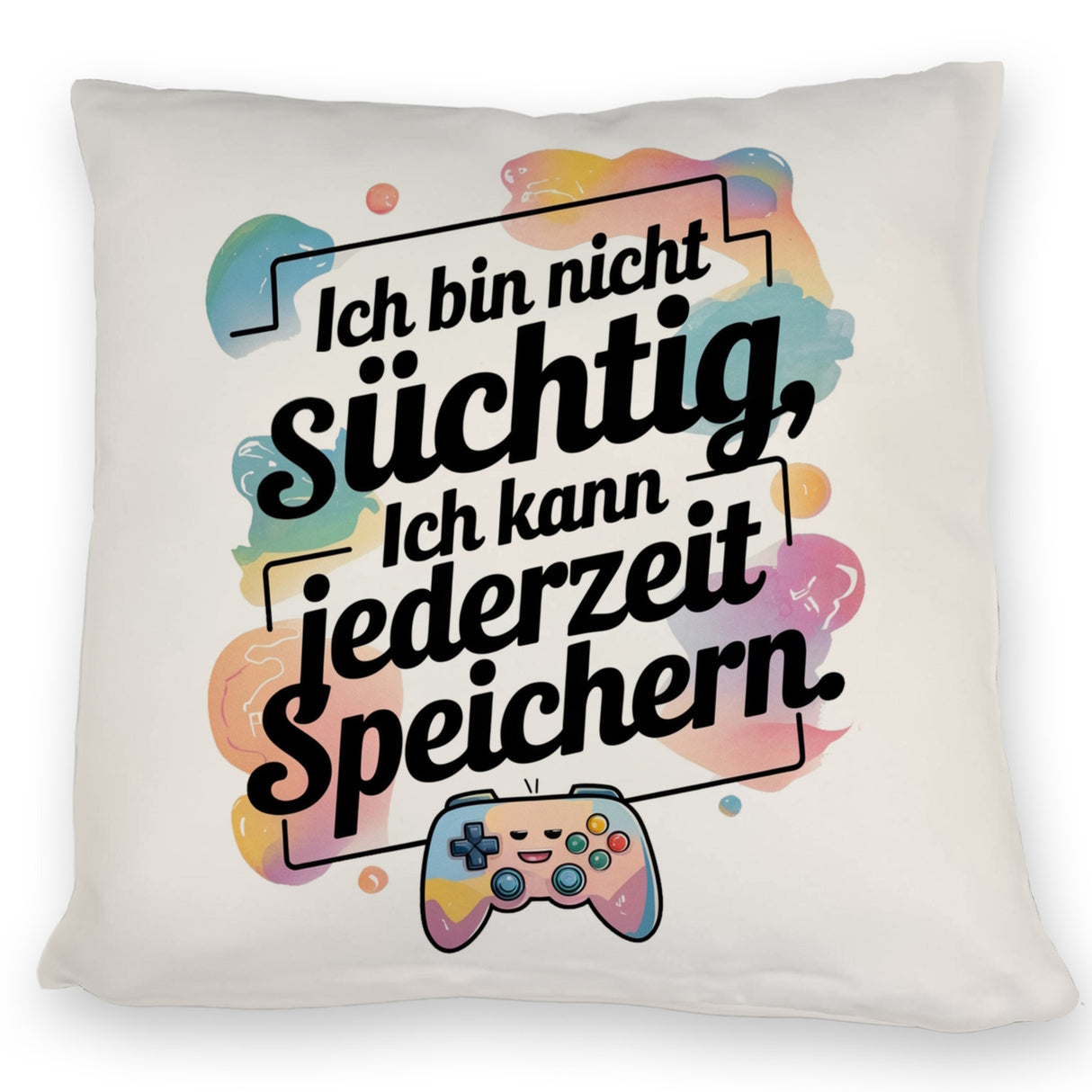 - Dieses humorvolle Kissen ist ein Muss für Gamer! Es präsentiert einen weißen Hintergrund mit einem typografischen Aquarell-Pastell-Design. Der lustige Spruch "Ich bin nicht süchtig, ich kann jederzeit speichern" prangt in großen schwarzen Buchstaben, umrahmt von sanften Pastellfarben und einem fröhlichen Spielcontroller am unteren Rand.