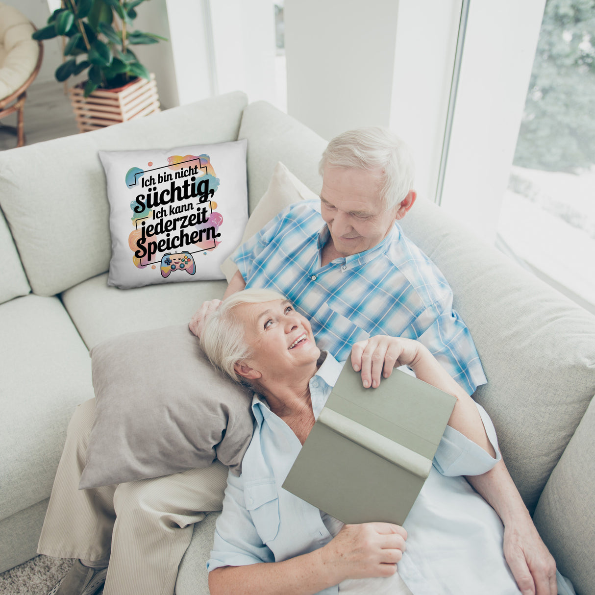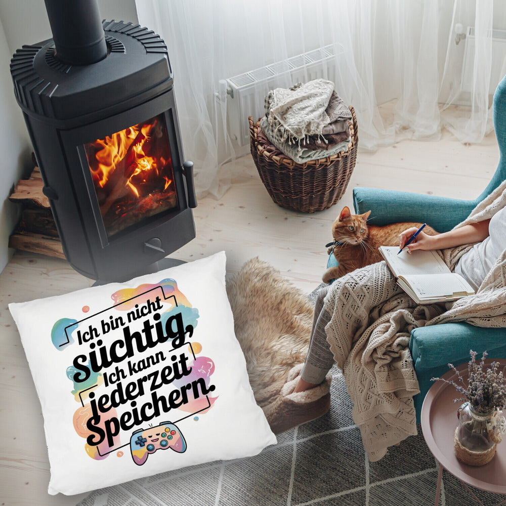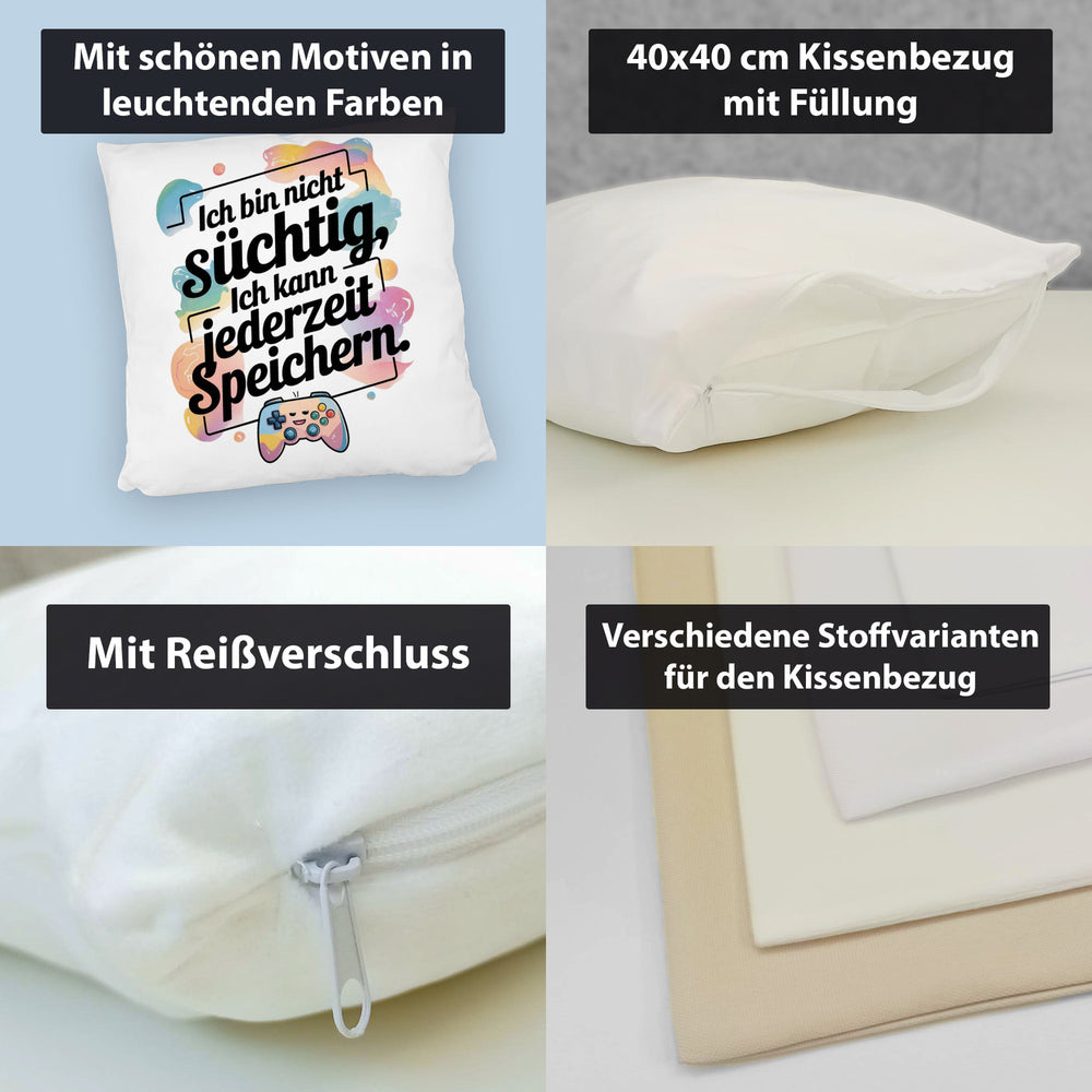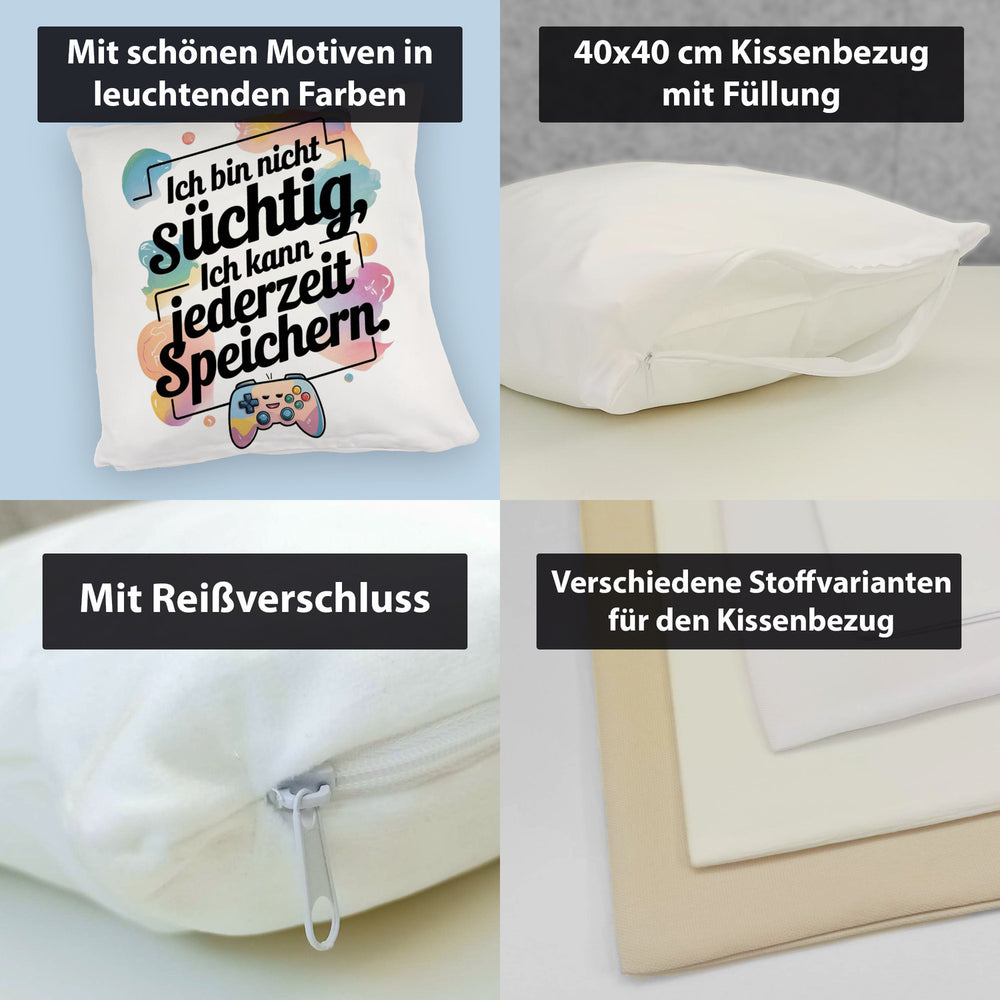 - Dieses humorvolle Kissen ist ein Muss für Gamer! Es präsentiert einen weißen Hintergrund mit einem typografischen Aquarell-Pastell-Design. Der lustige Spruch "Ich bin nicht süchtig, ich kann jederzeit speichern" prangt in großen schwarzen Buchstaben, umrahmt von sanften Pastellfarben und einem fröhlichen Spielcontroller am unteren Rand.