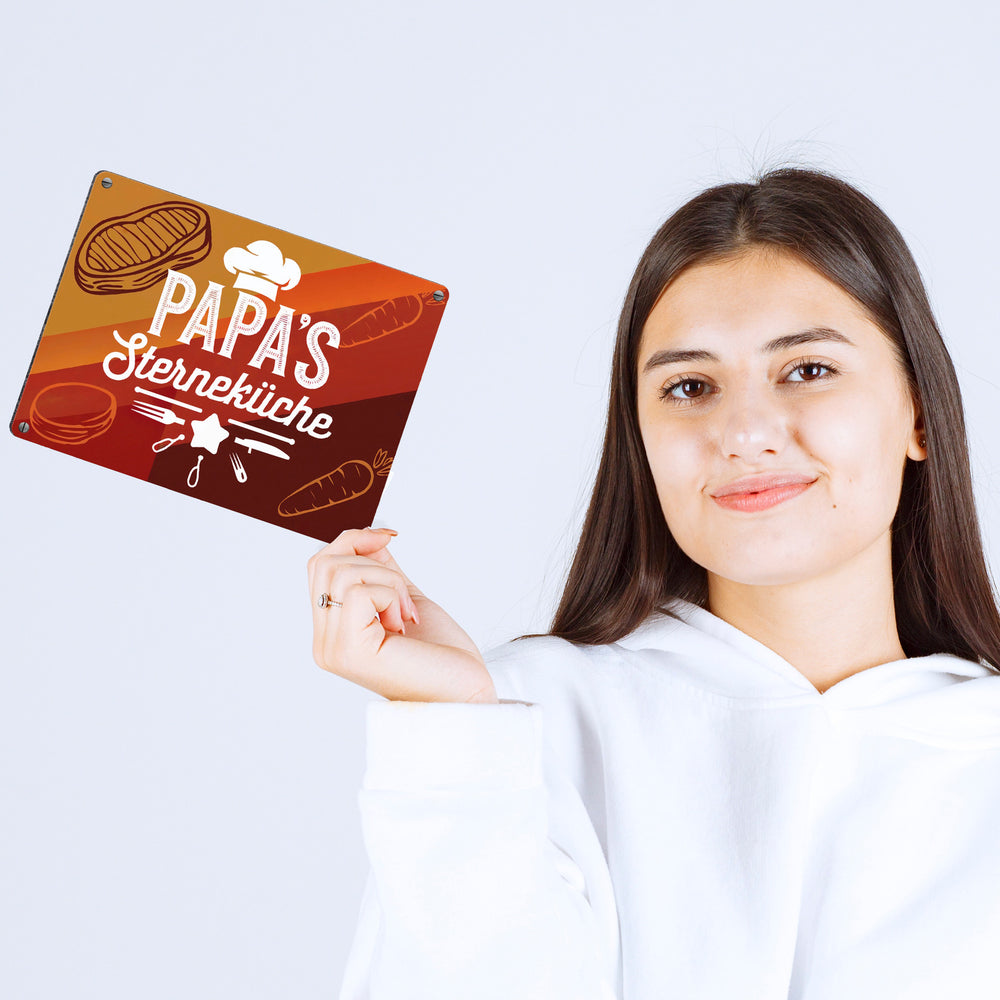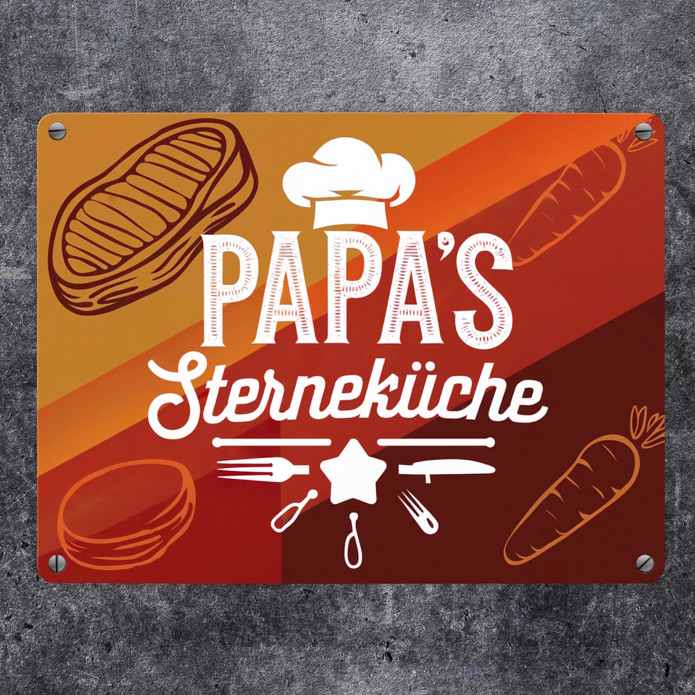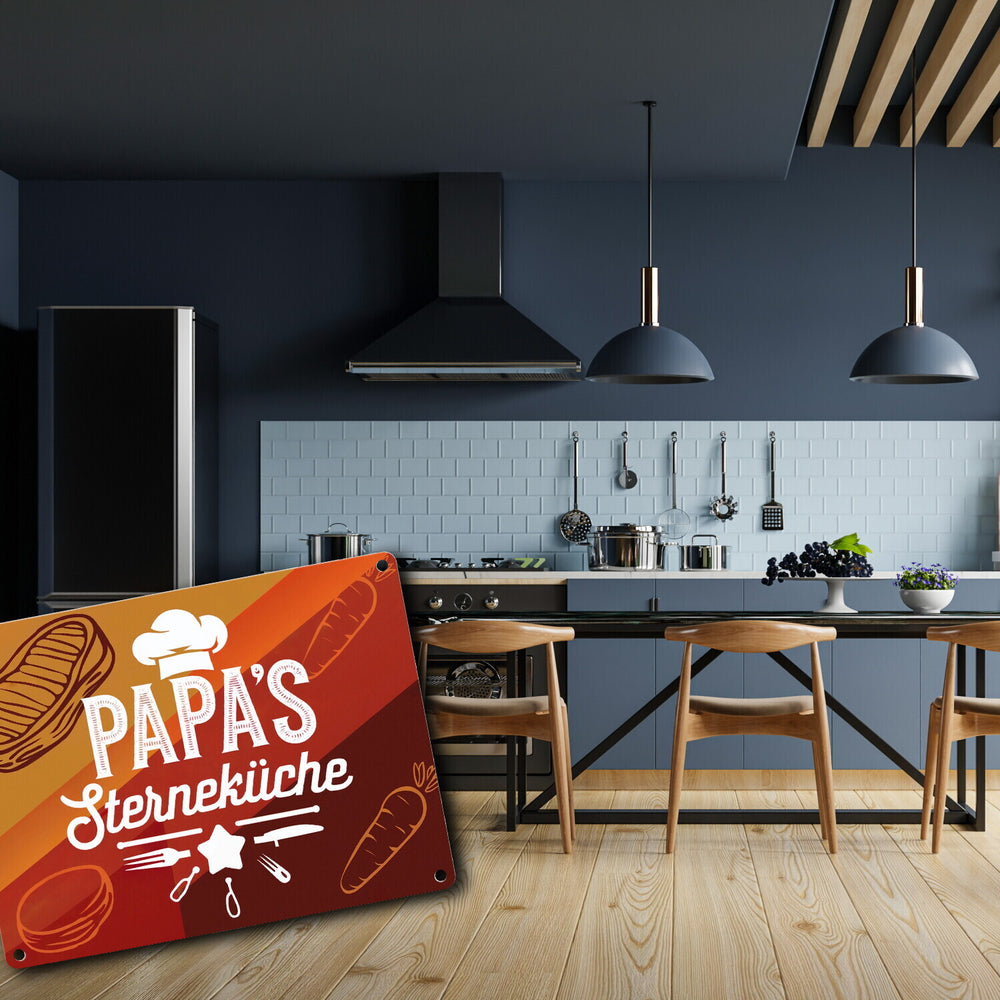 - Hol dir "PAPA'S STERNEKÜCHE", das mit Liebe designte Metallschild, das Qualität und Spaß in deine Küche bringt. Lass dein kulinarisches Revier stilvoll glänzen oder beschenke deinen liebsten Koch damit! Ein Muss für alle, die ihre Küche mit Charme und Lächeln aufwerten wollen.
