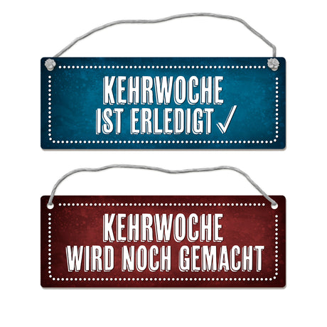 Kehrwoche wird noch gemacht oder ist erledigt Wendeschild mit Kordel in Rot-blau