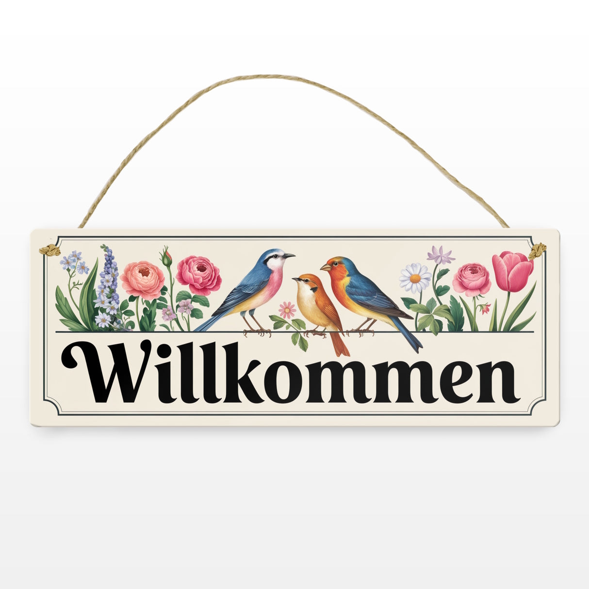 - Das Metallschild beeindruckt mit einem liebevoll gestalteten Motiv von drei farbenfrohen Vögeln in Blau, Orange und Gelb, die von bunten Blumen wie Rosen, Gänseblümchen und Tulpen umgeben sind. Auf einem cremefarbenen Hintergrund prangt das fröhliche "Willkommen" in eleganten schwarzen Kursivbuchstaben. Dieses Design zaubert ein Lächeln und Frühlingsgefühle ins Herz.