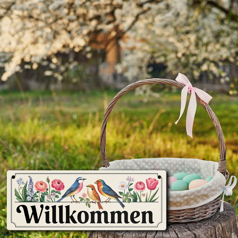- 1x Vögel und Blumen Willkommen Metallschild - Frühling in der gewählten Größe