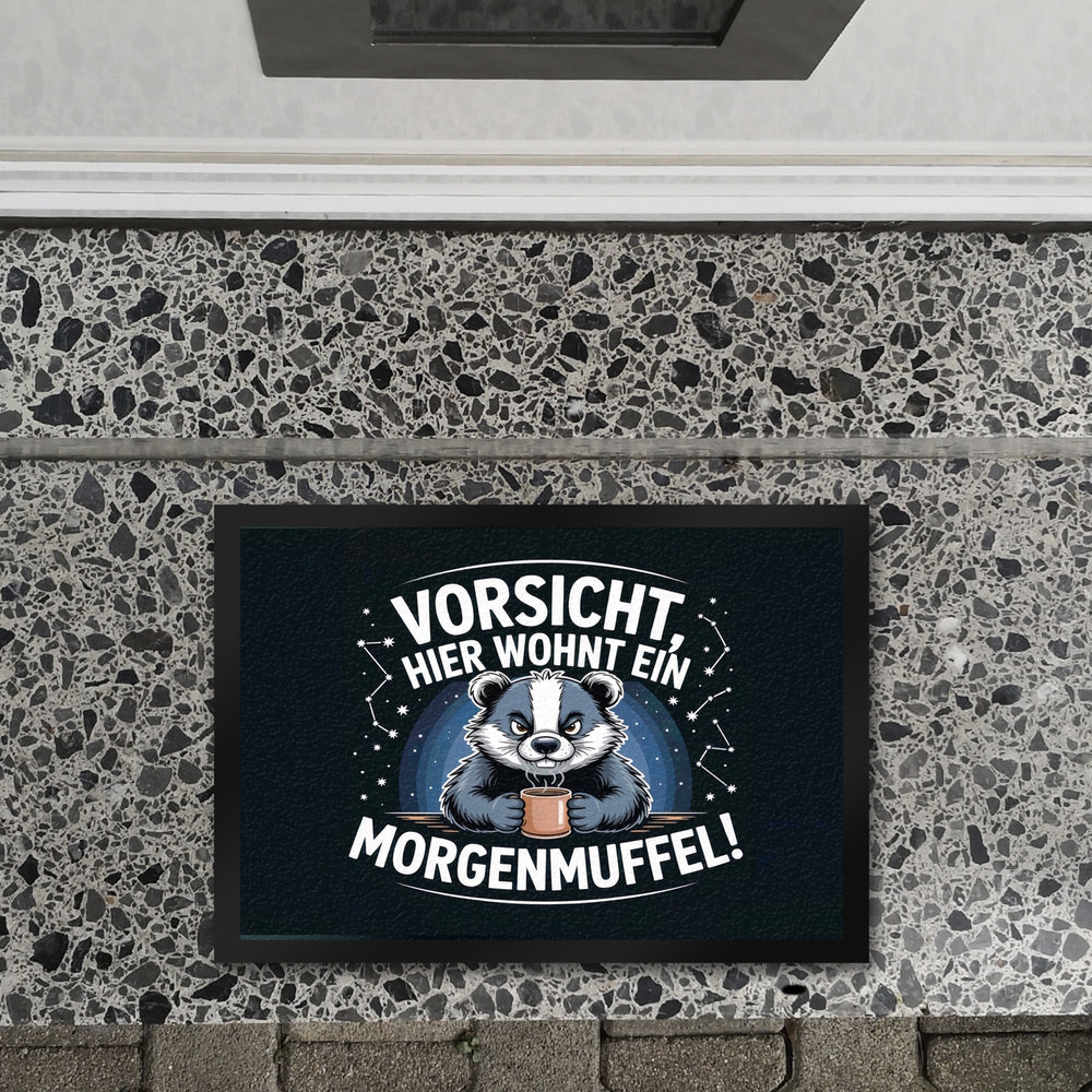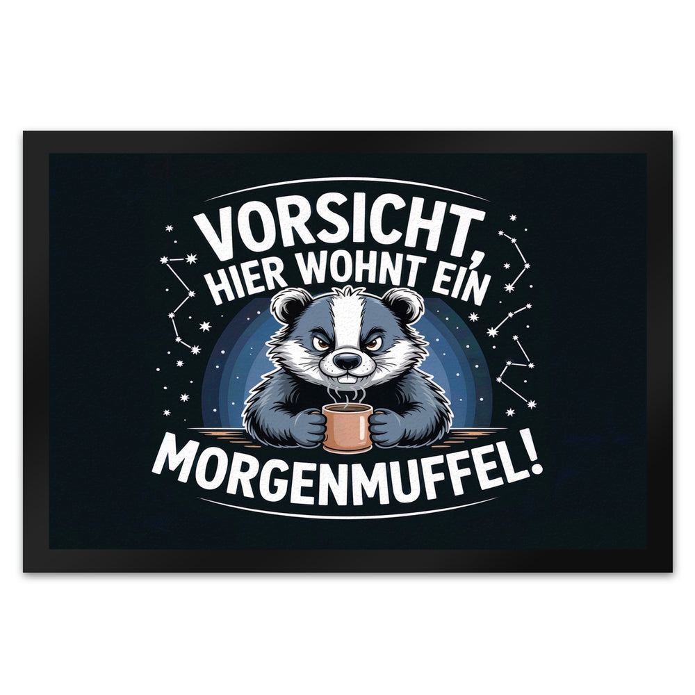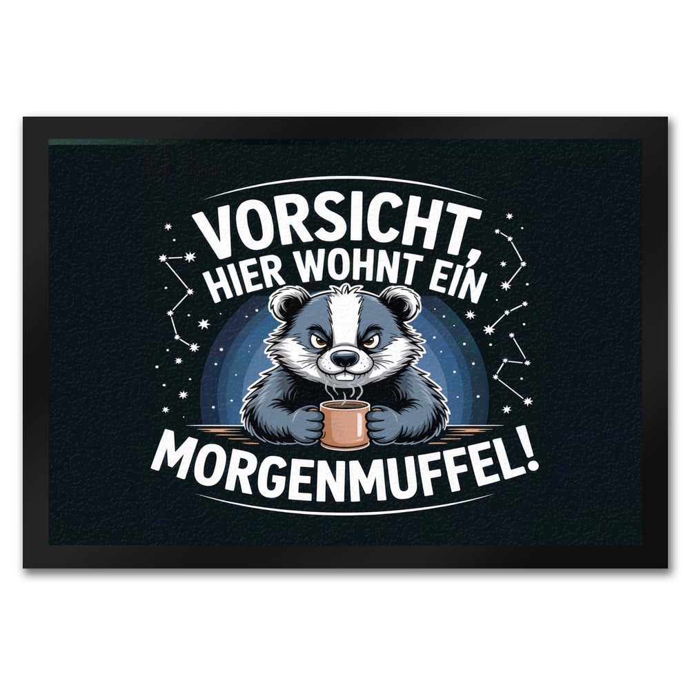 Vorsicht, hier wohnt ein Morgenmuffel! Fußmatte in 35x50 cm Dachs mit Kaffeebecher