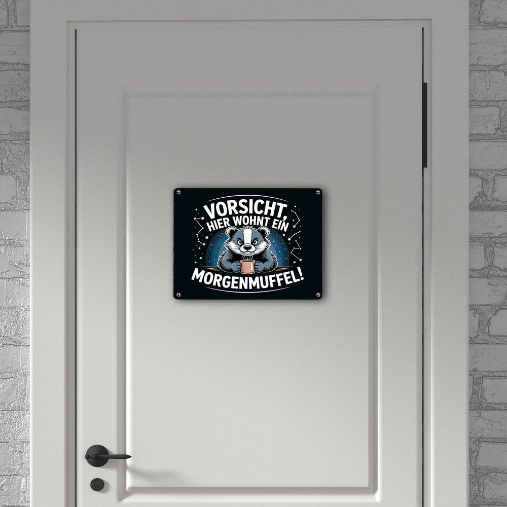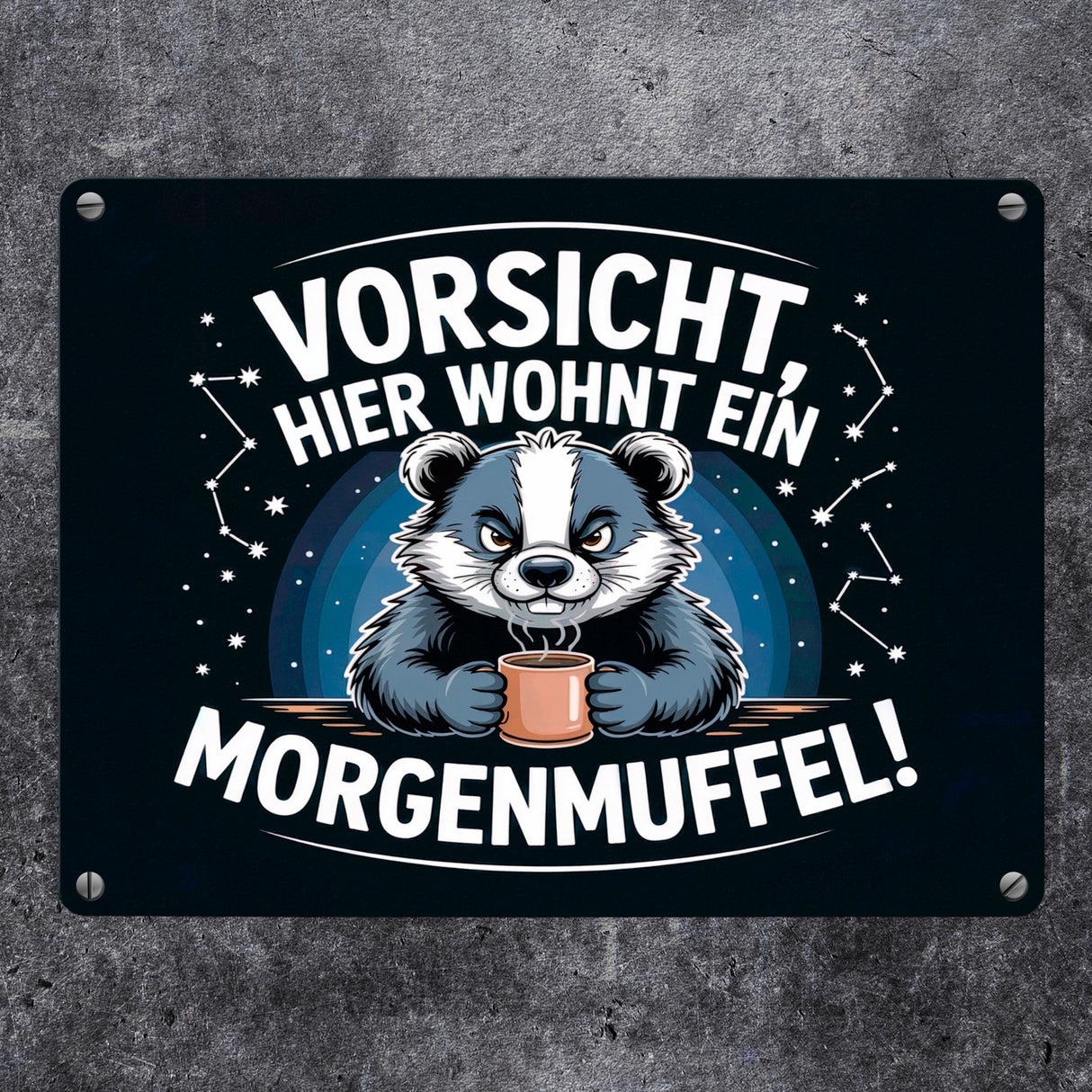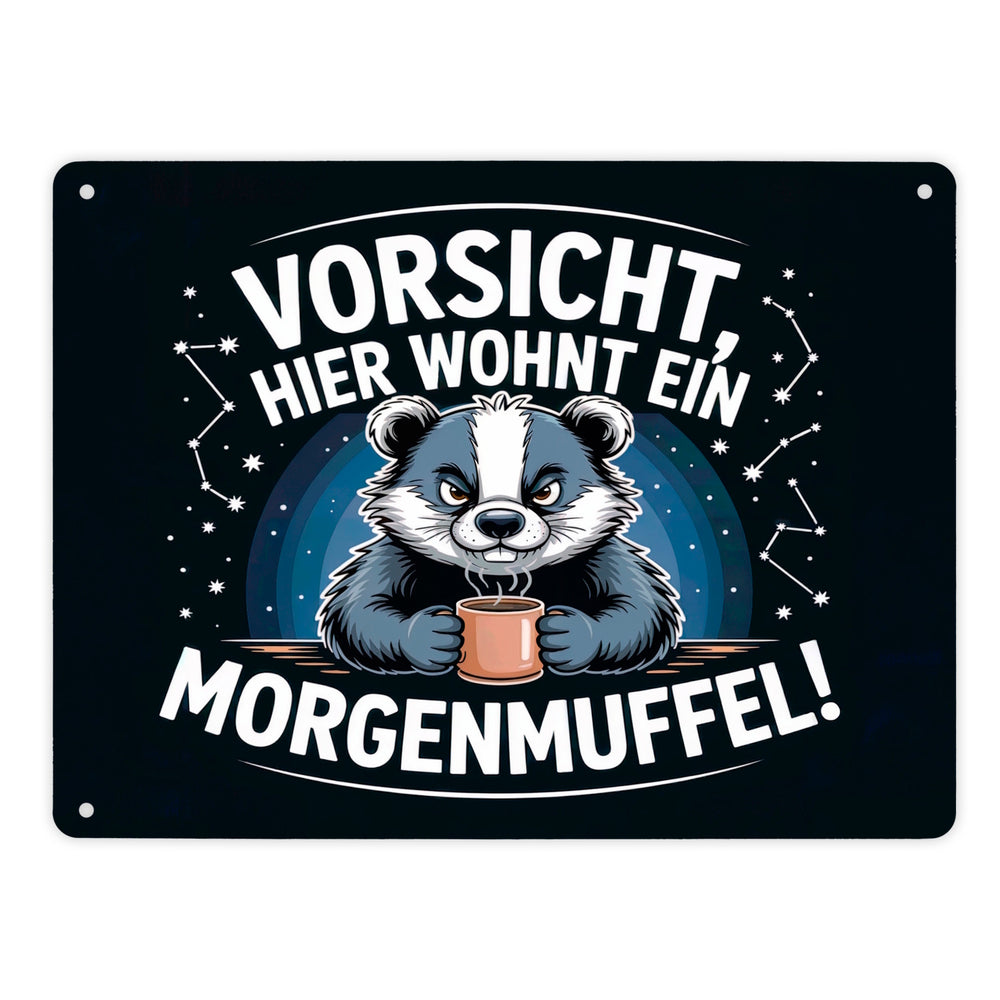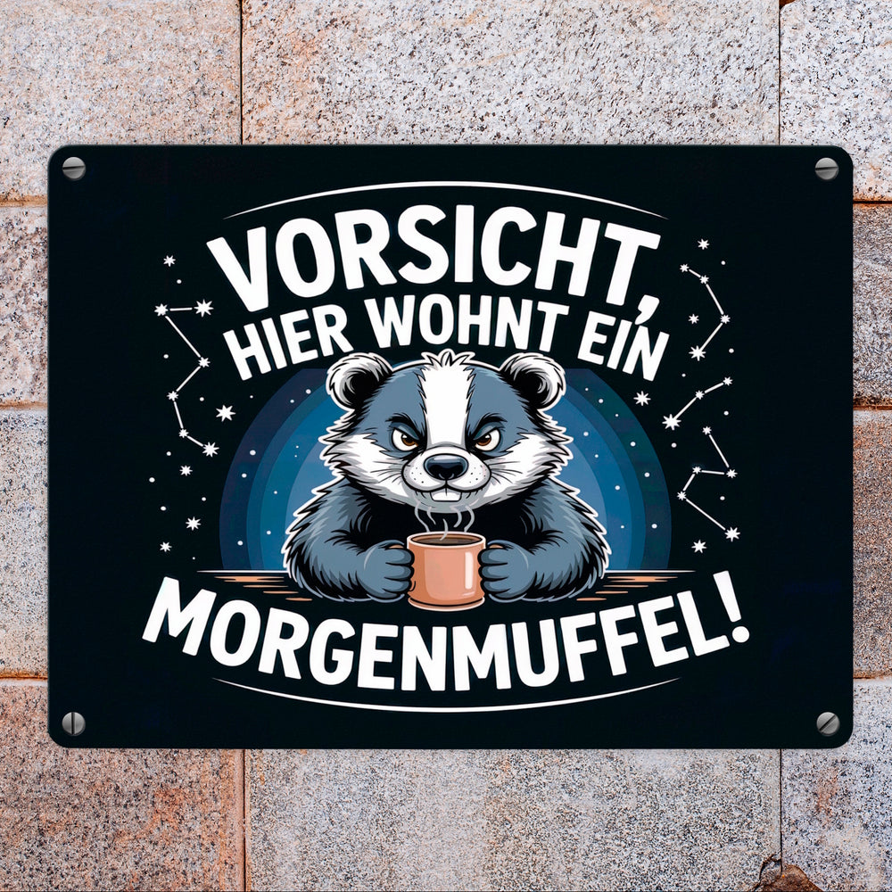 Vorsicht, hier wohnt ein Morgenmuffel! Metallschild in 15x20 cm Dachs mit Kaffeebecher
