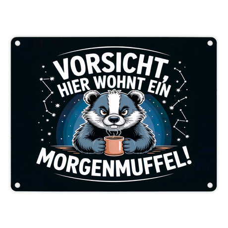 Vorsicht, hier wohnt ein Morgenmuffel! Metallschild in 15x20 cm Dachs mit Kaffeebecher