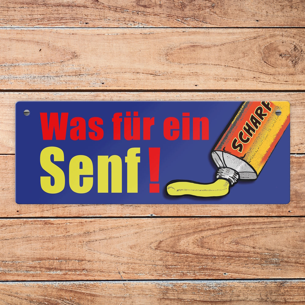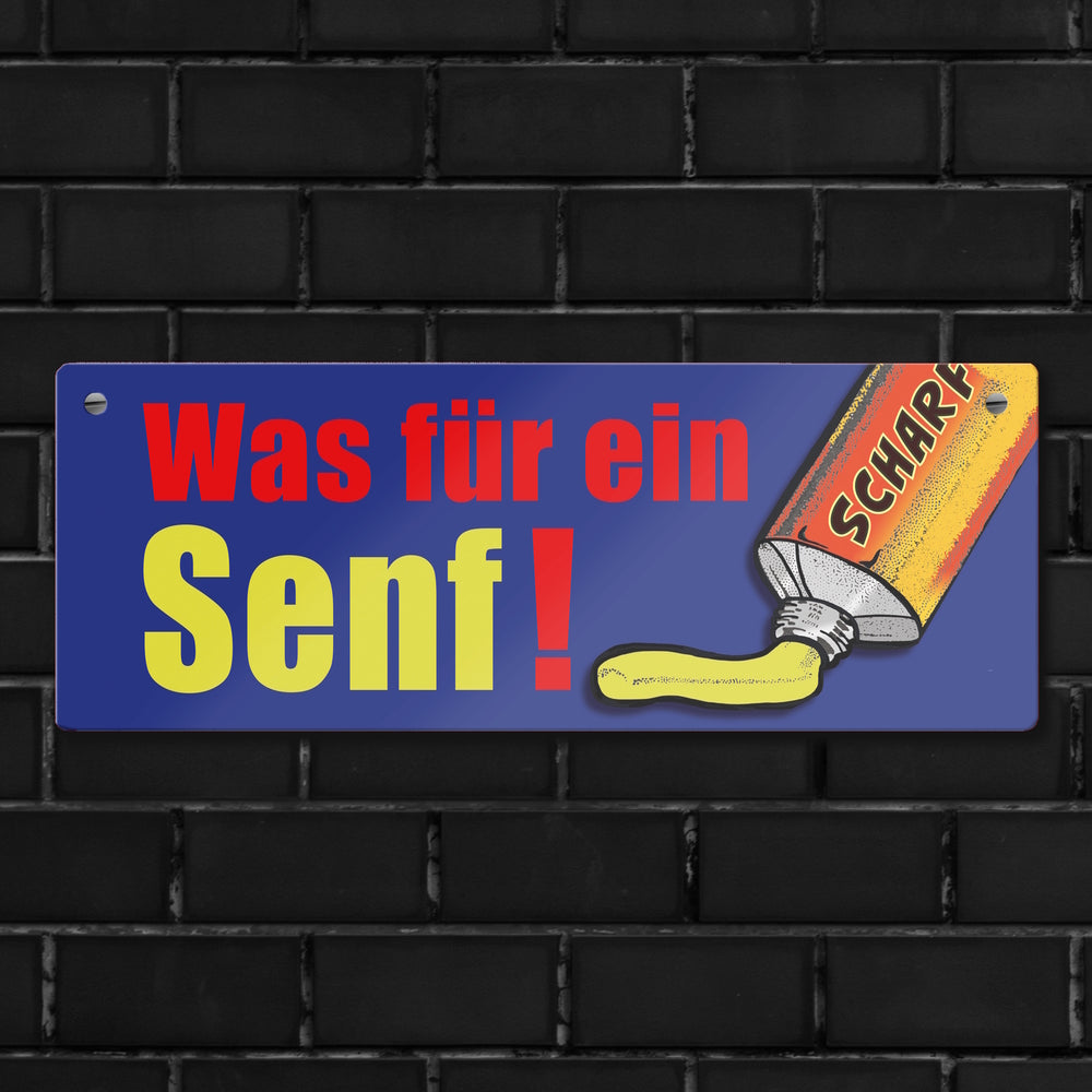 Was für ein Senf! Metallschild im Comicstil mit Senfmotiv und Spruch