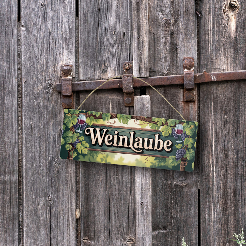 - Dieses charmante Metallschild im Vintage-Stil zeigt eine idyllische Weinlaube, umgeben von üppigen Weinreben. Der rustikale Look, als wäre es aus verwittertem Holz gefertigt, wird durch die kunstvoll handgemalte Schrift und zarte Illustrationen von Weingläsern und Traubenbündeln ergänzt. In warmen, erdigen Tönen lädt es zum Träumen ein.