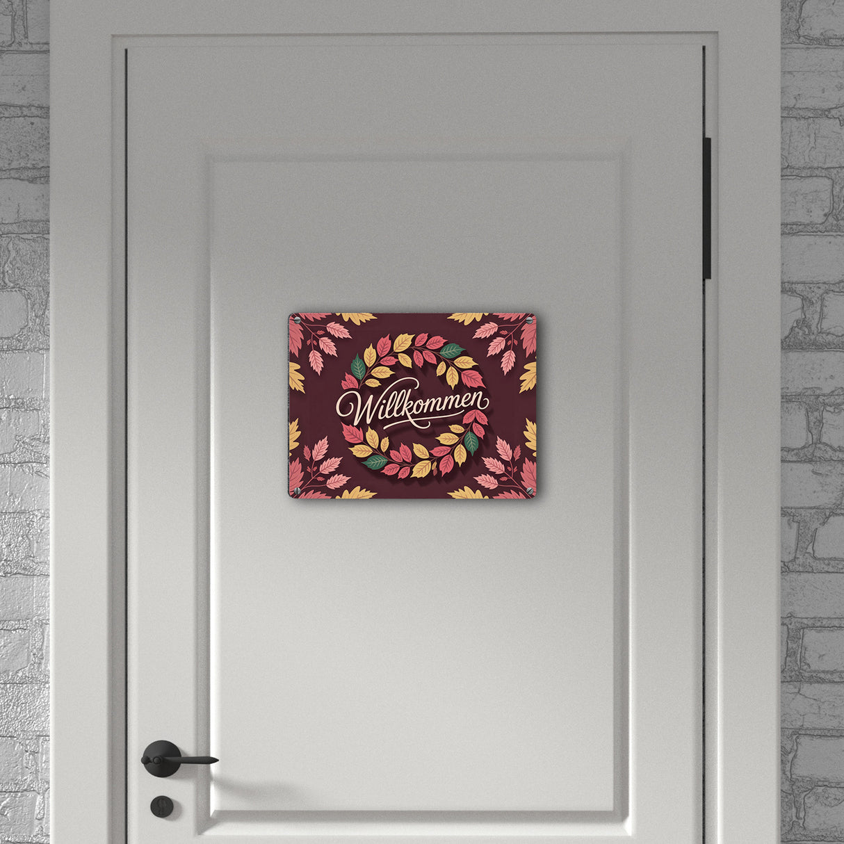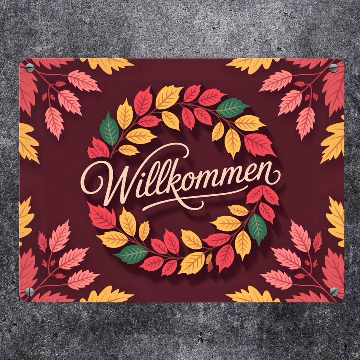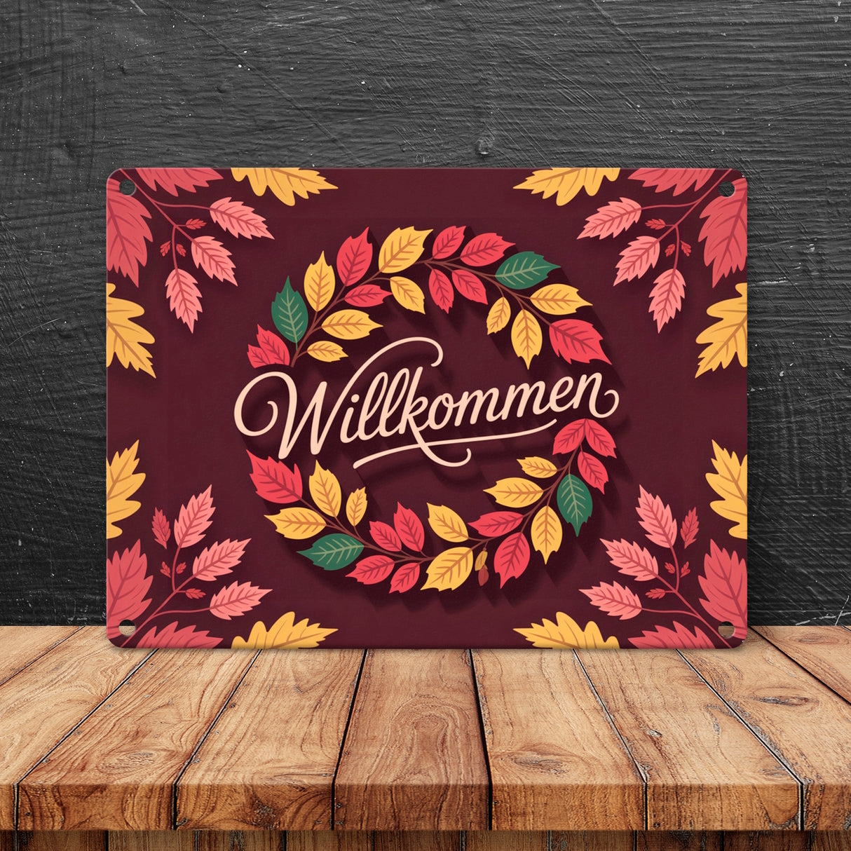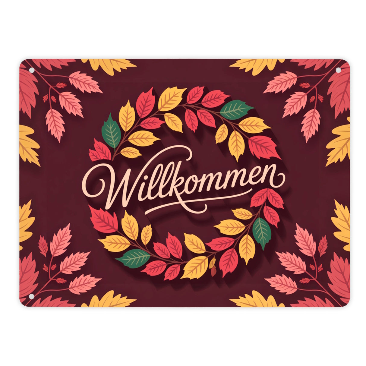 - Das Metallschild "Willkommen Herbstlaub Kranz" ist ein bezauberndes Herbstdekor. Es zeigt einen wundervoll gestalteten Kranz aus roten Eichenblättern, gelben Kastanienblättern und grünen Ahornblättern. Der warme Burgunderrot-Hintergrund und der goldene Willkommensgruß machen es zu einem absoluten Hingucker an jeder Haustür.