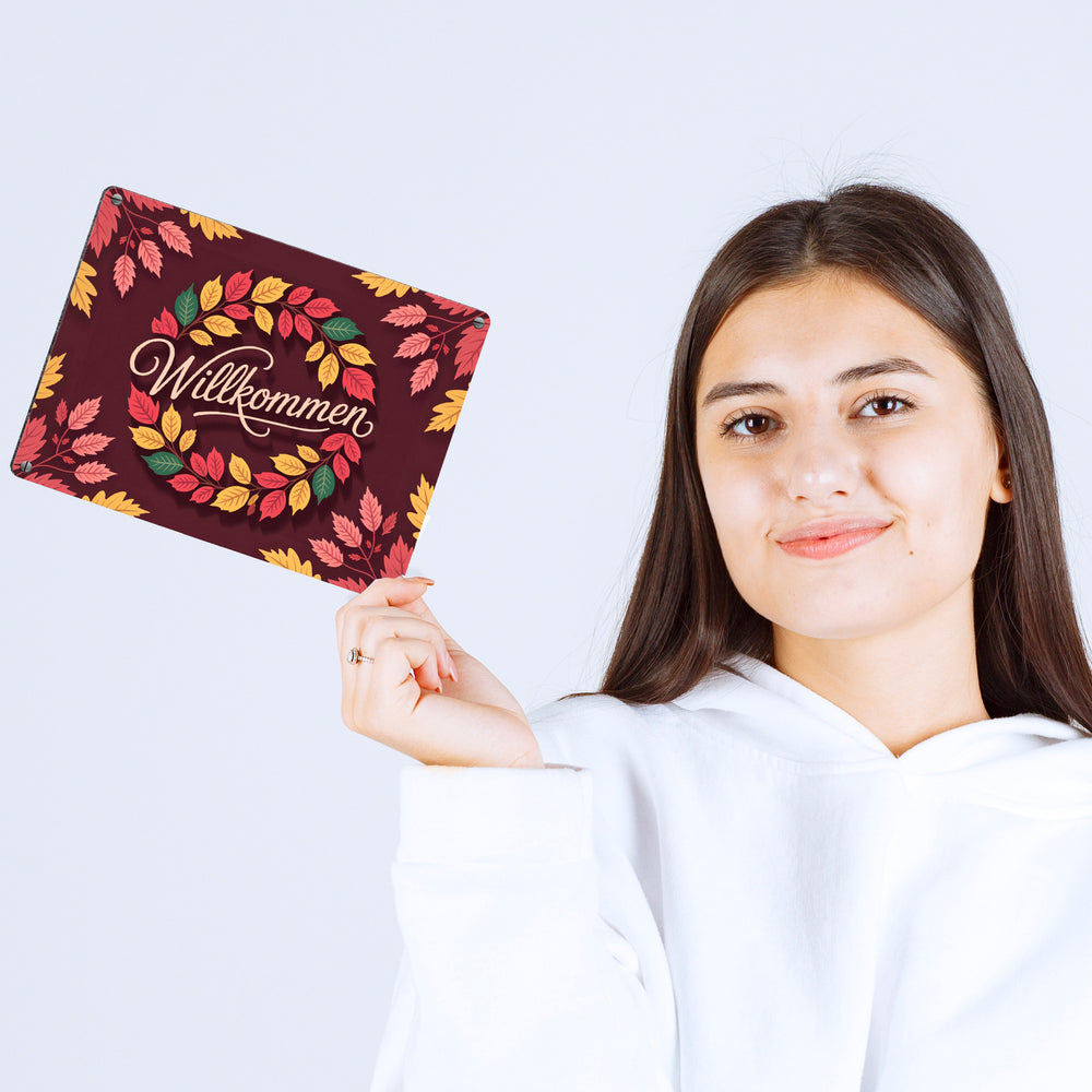 - 1x Willkommen Herbstlaub Kranz Metallschild in 15x20 cm in der gewählten Größe