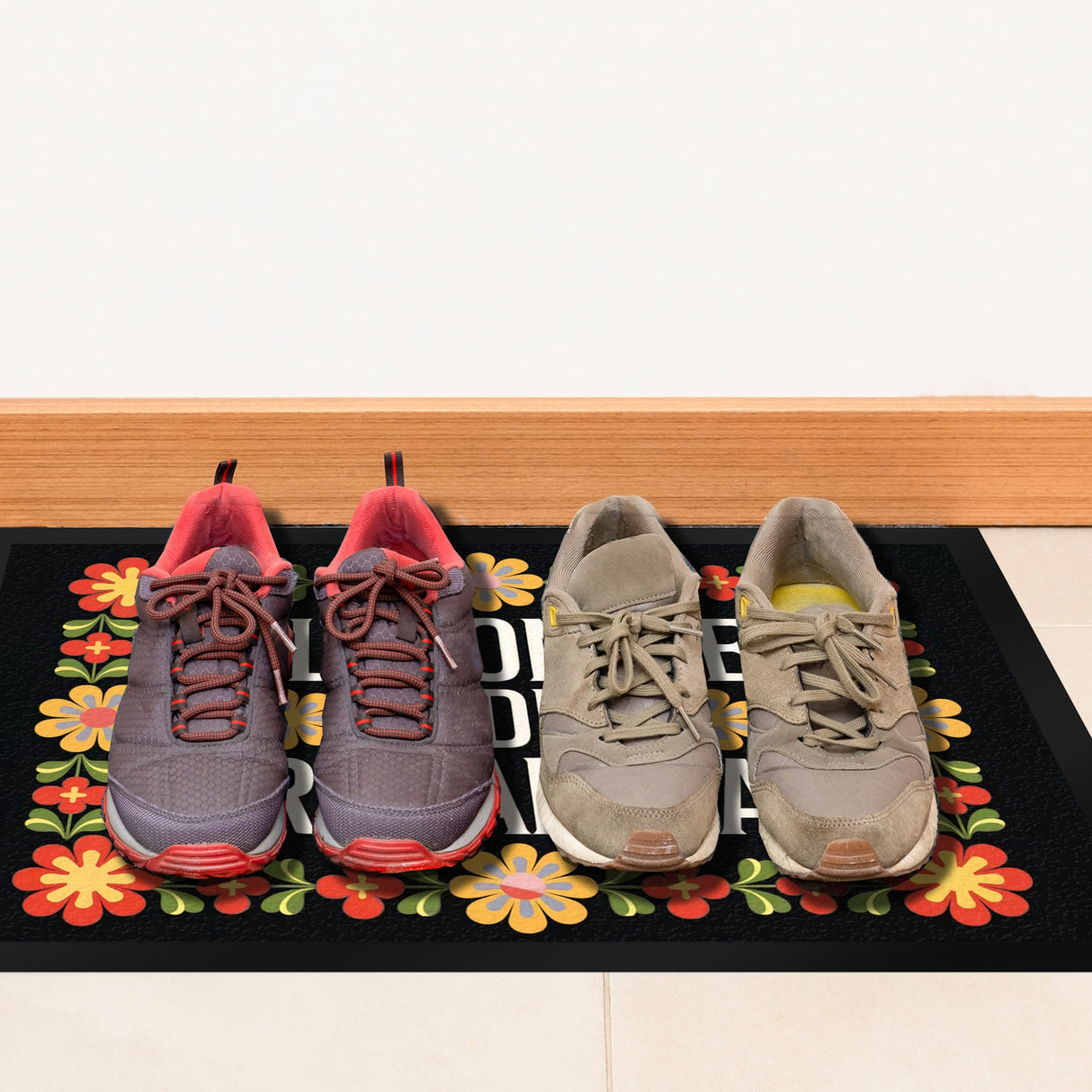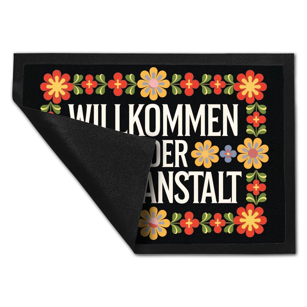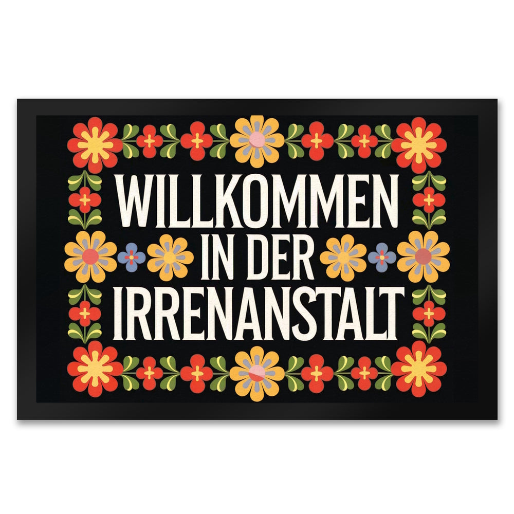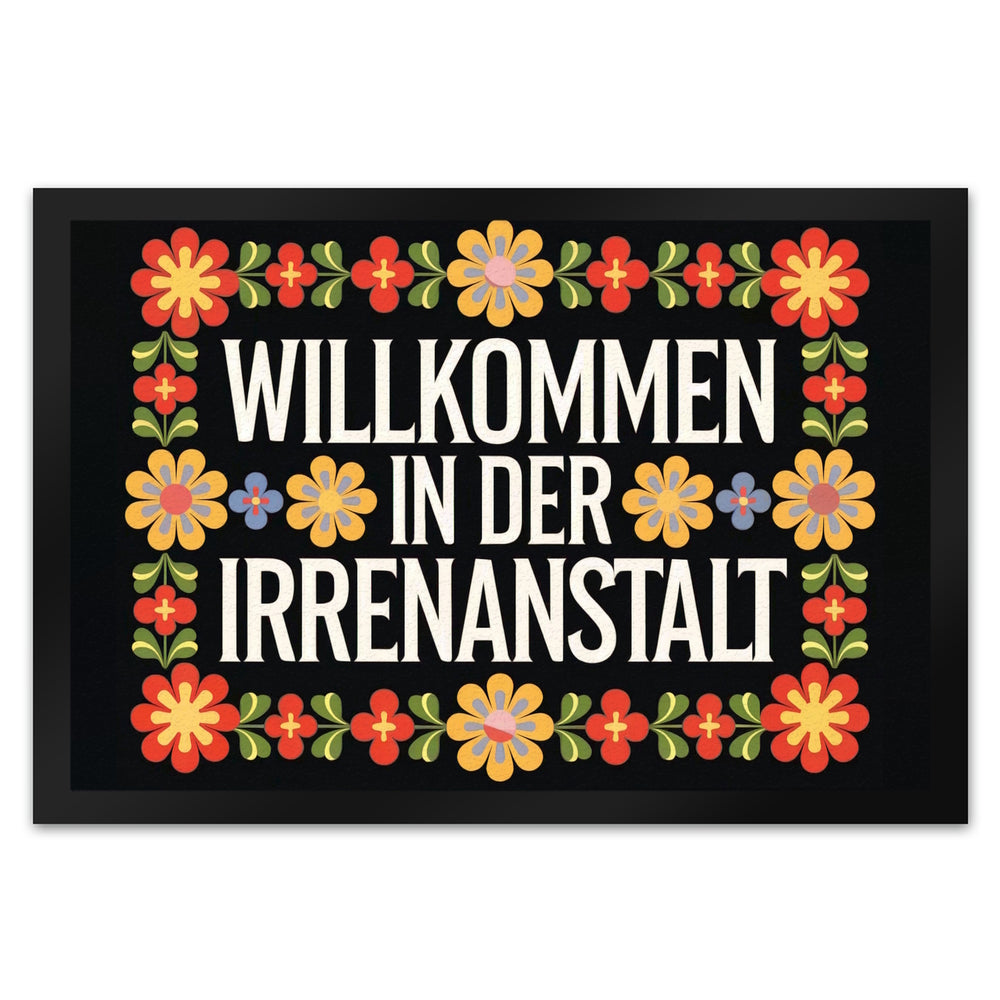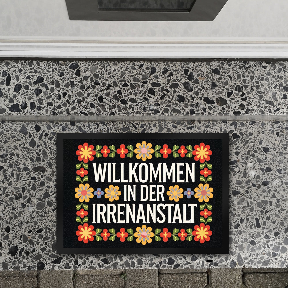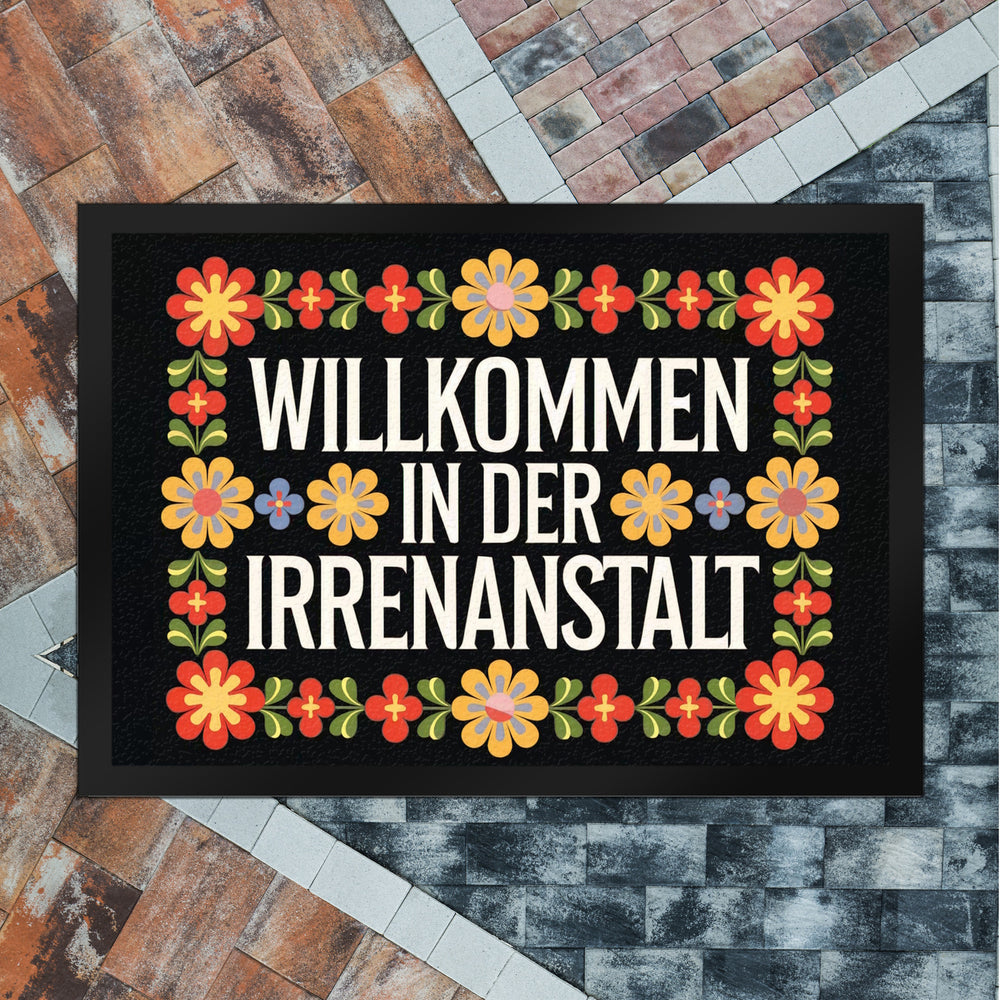 - Willkommen in der Irrenanstalt! Unsere Fußmatte begrüßt dich und deine Gäste mit einem Augenzwinkern. Sie kombiniert schwarzen Hintergrund und dekorative Schriftart mit wilden, retro-bunten Blumenornamenten. Perfekt für alle, die Humor lieben und ihren Eingangsbereich aufpeppen wollen!