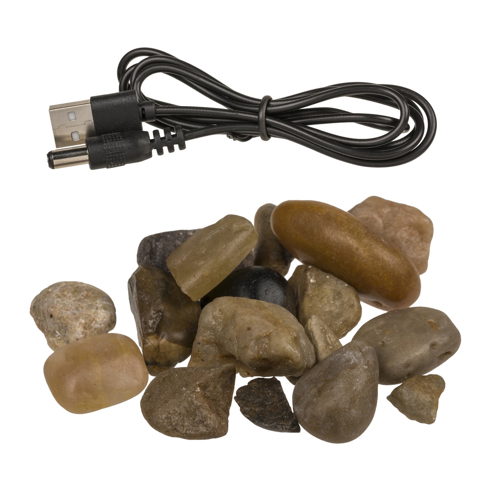 - 1x Zimmerbrunnen Wasserspiel - Tischbrunnen mit LED bestehend aus 1x Brunnen, 1x Steine und 1x USB-Kabel. Ebenso liegt eine Bedienungsanleitung in deutscher Sprache bei.
