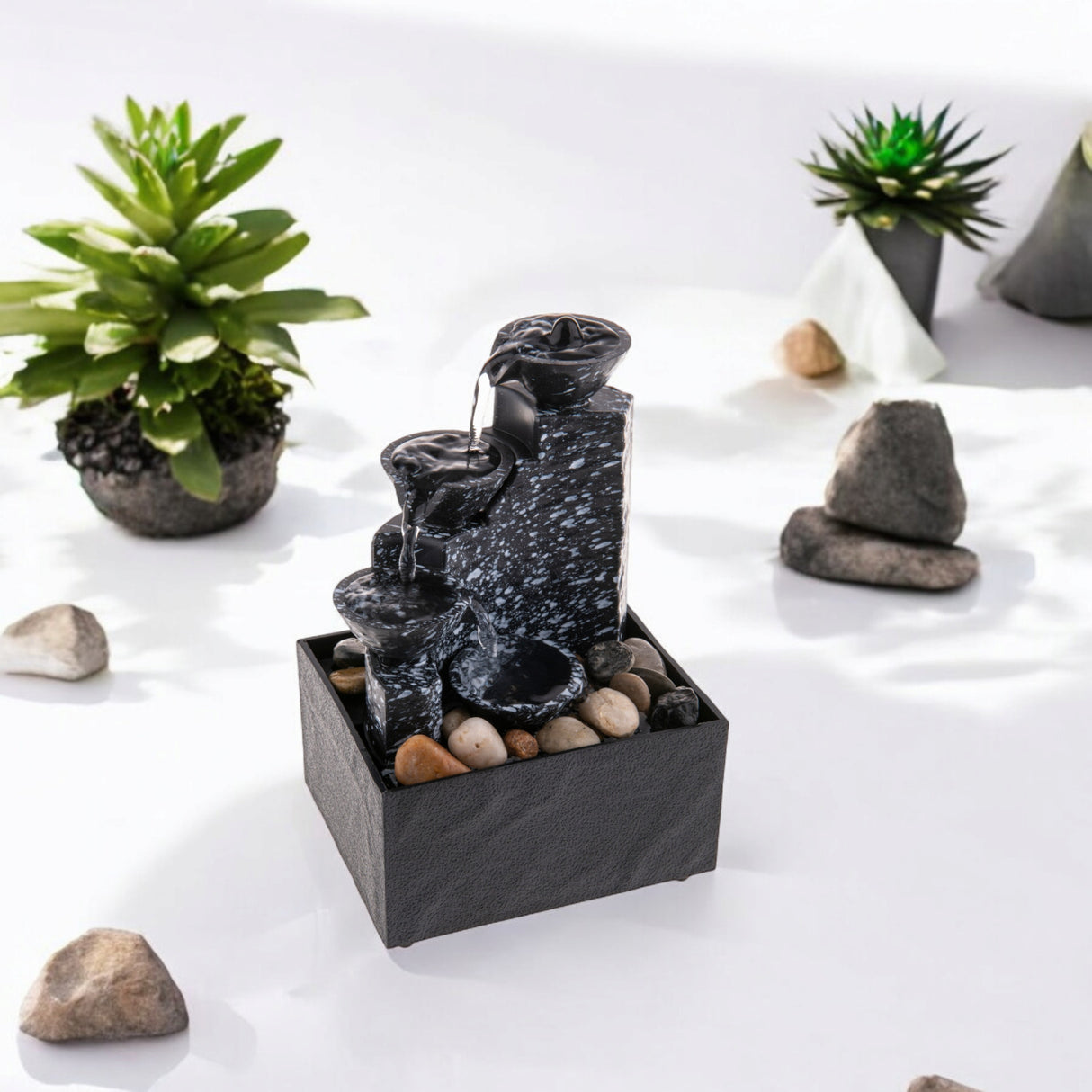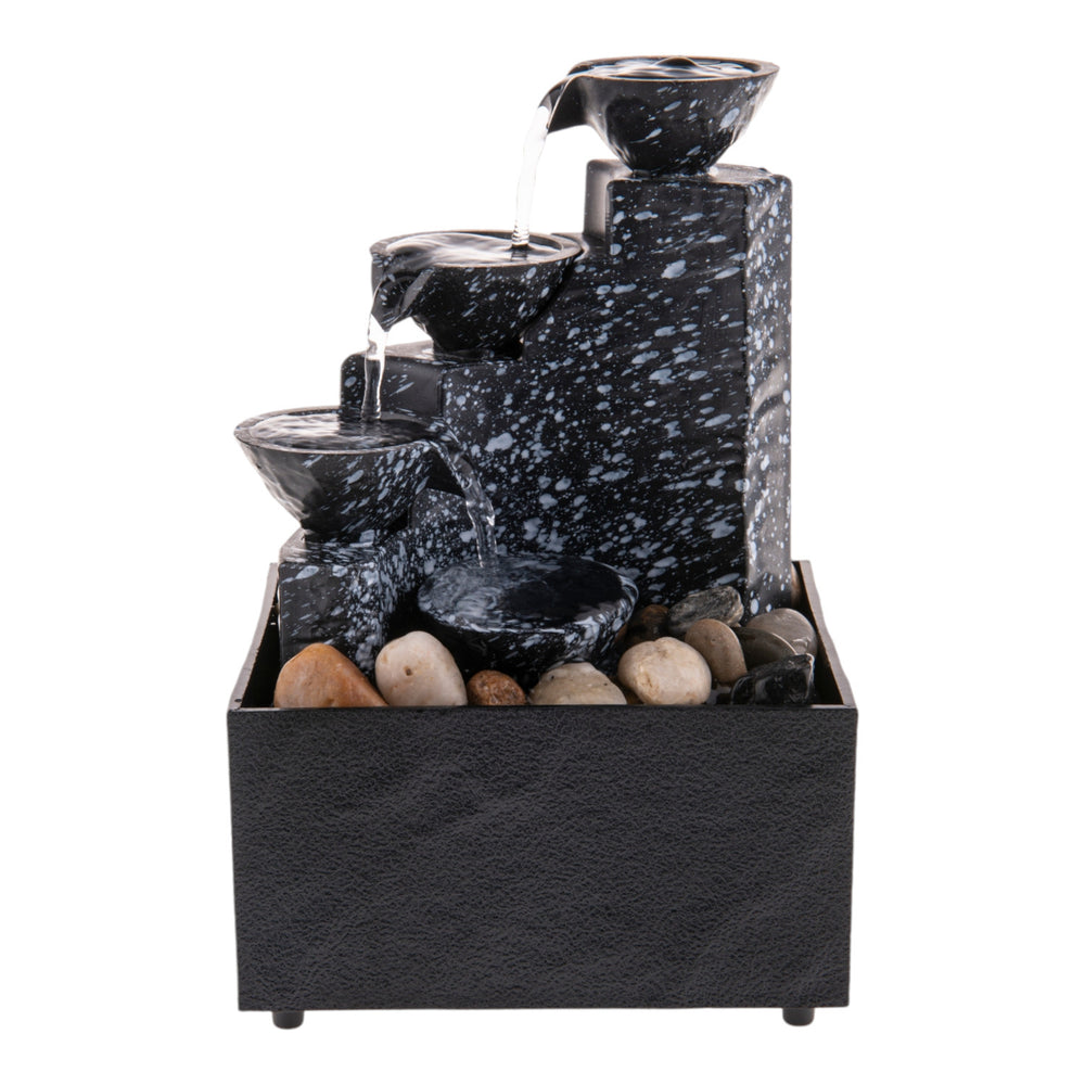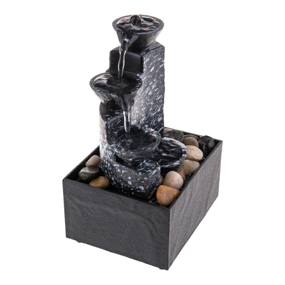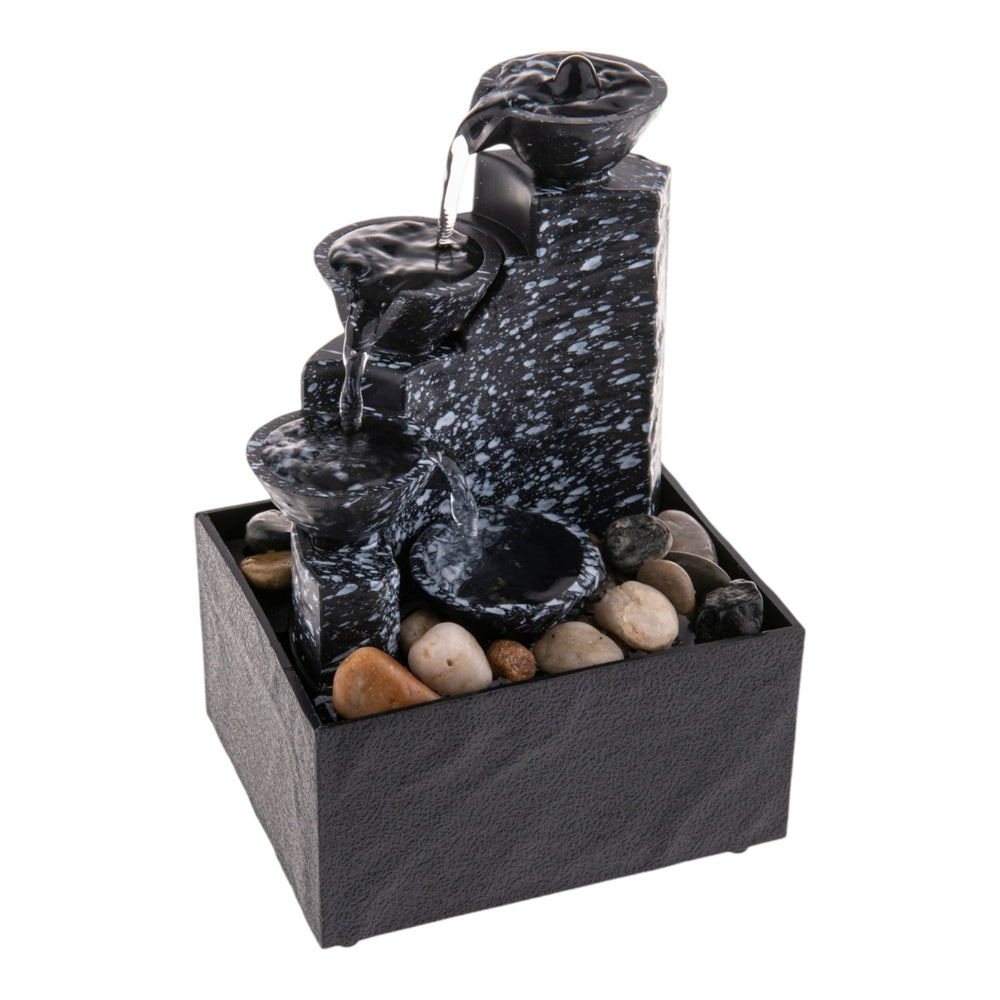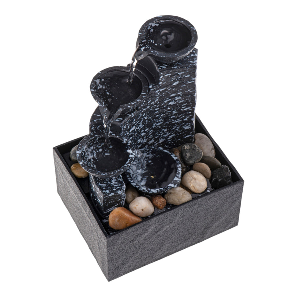 - Unser Tischbrunnen im Feng Shui Stil besteht aus mehreren schicken Schalen und einem sanften LED-Licht. Das Wasser plätschert von oben nach unten und wird in einem Becken aufgefangen. Einfach an den Strom anschließen, Steine rein und los! Hergestellt aus robustem Kunststoff, ist er leicht und langlebig.