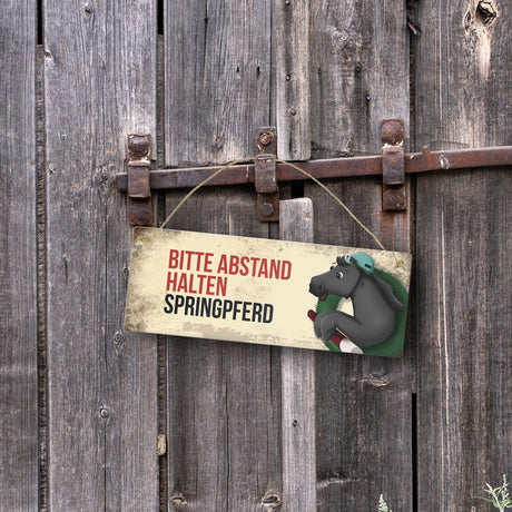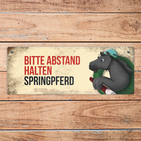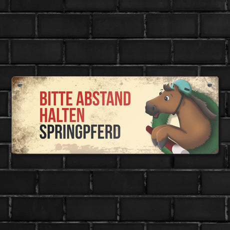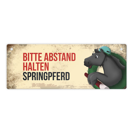 Metallschild mit schwarzem Springpferd Motiv und Spruch: Bitte Abstand halten