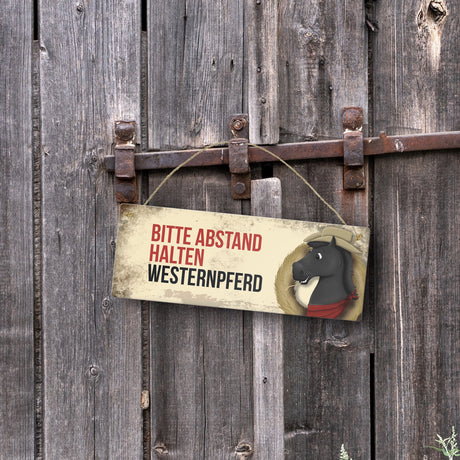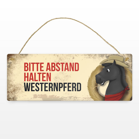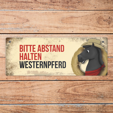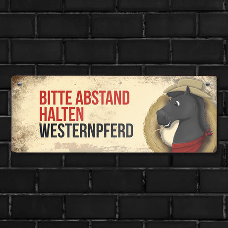 Ab €6,95Grundpreis /Nicht verfügbarAuf LagerMetallschild mit schwarzem Westernpferd Motiv und Spruch: Bitte Abstand halten