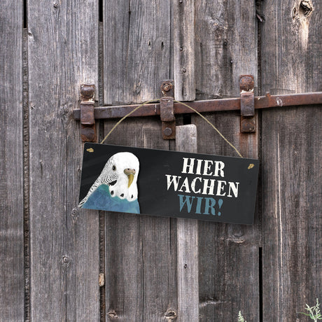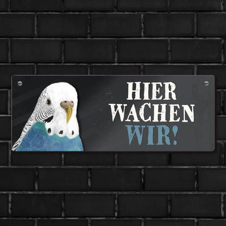 Ab €16,95Grundpreis /Nicht verfügbarAuf LagerMetallschild mit Wellensittich blau Motiv und Spruch: Hier wachen wir!