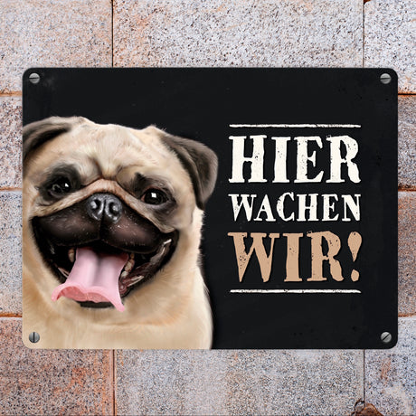 Ab €6,95Grundpreis /Nicht verfügbarAuf LagerMetallschild mit Mops Motiv und Spruch: Hier wachen wir!