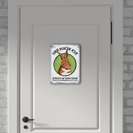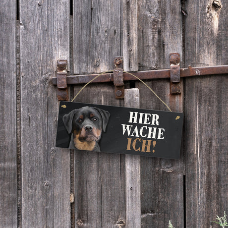 Metallschild mit Rottweiler Motiv und Spruch: Hier wache ich!