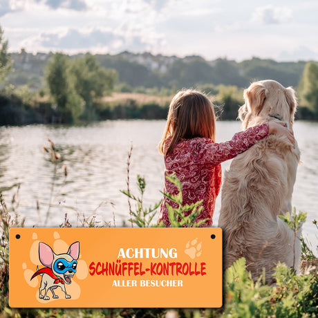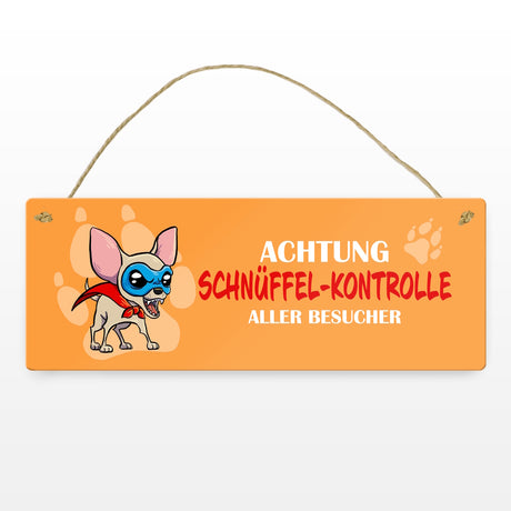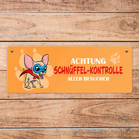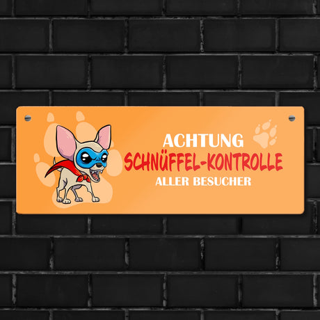 Metallschild mit Chihuahua - Achtung Schnüffel-Kontrolle aller Besucher