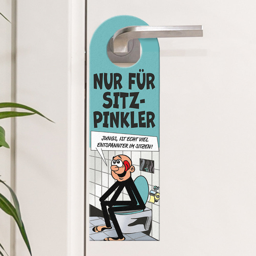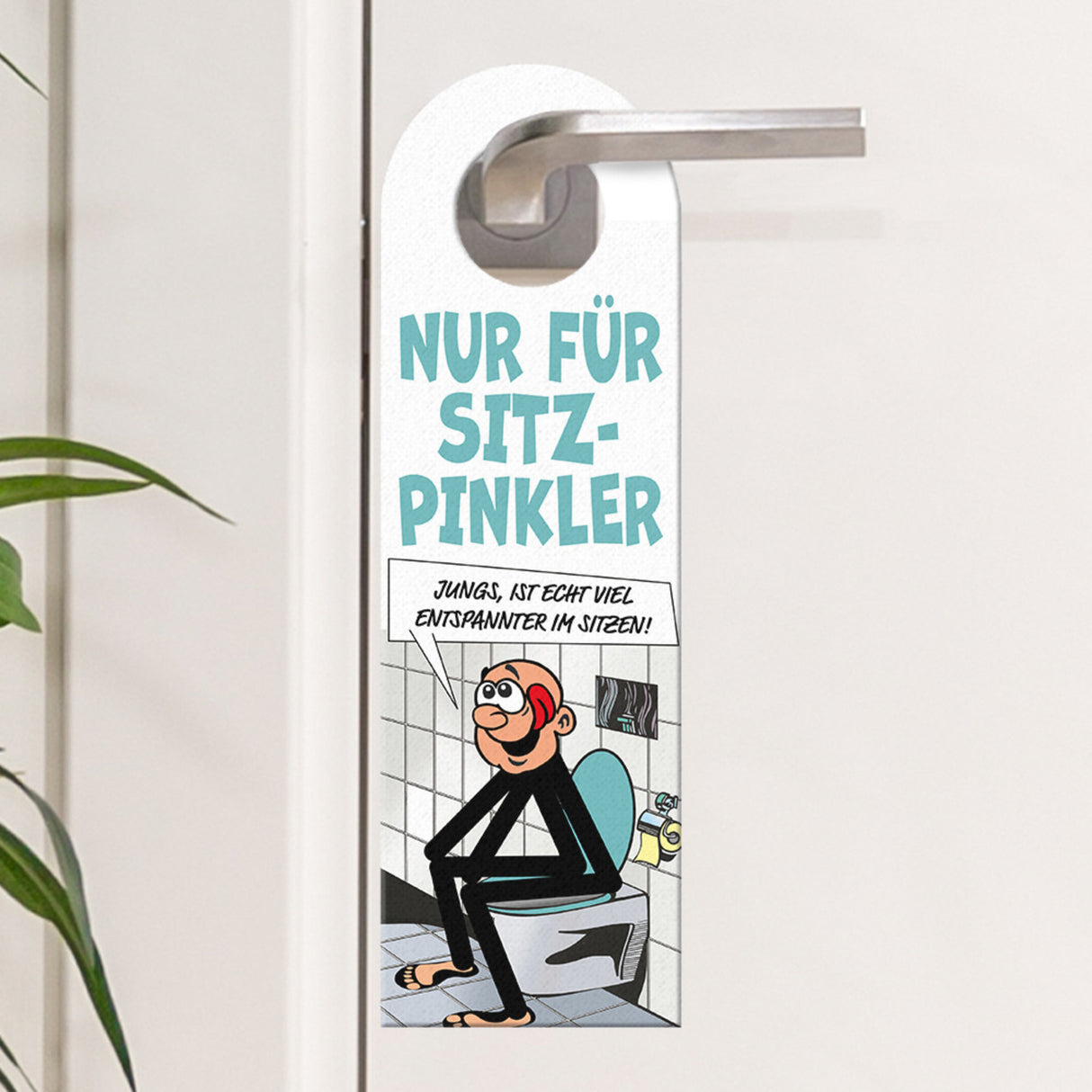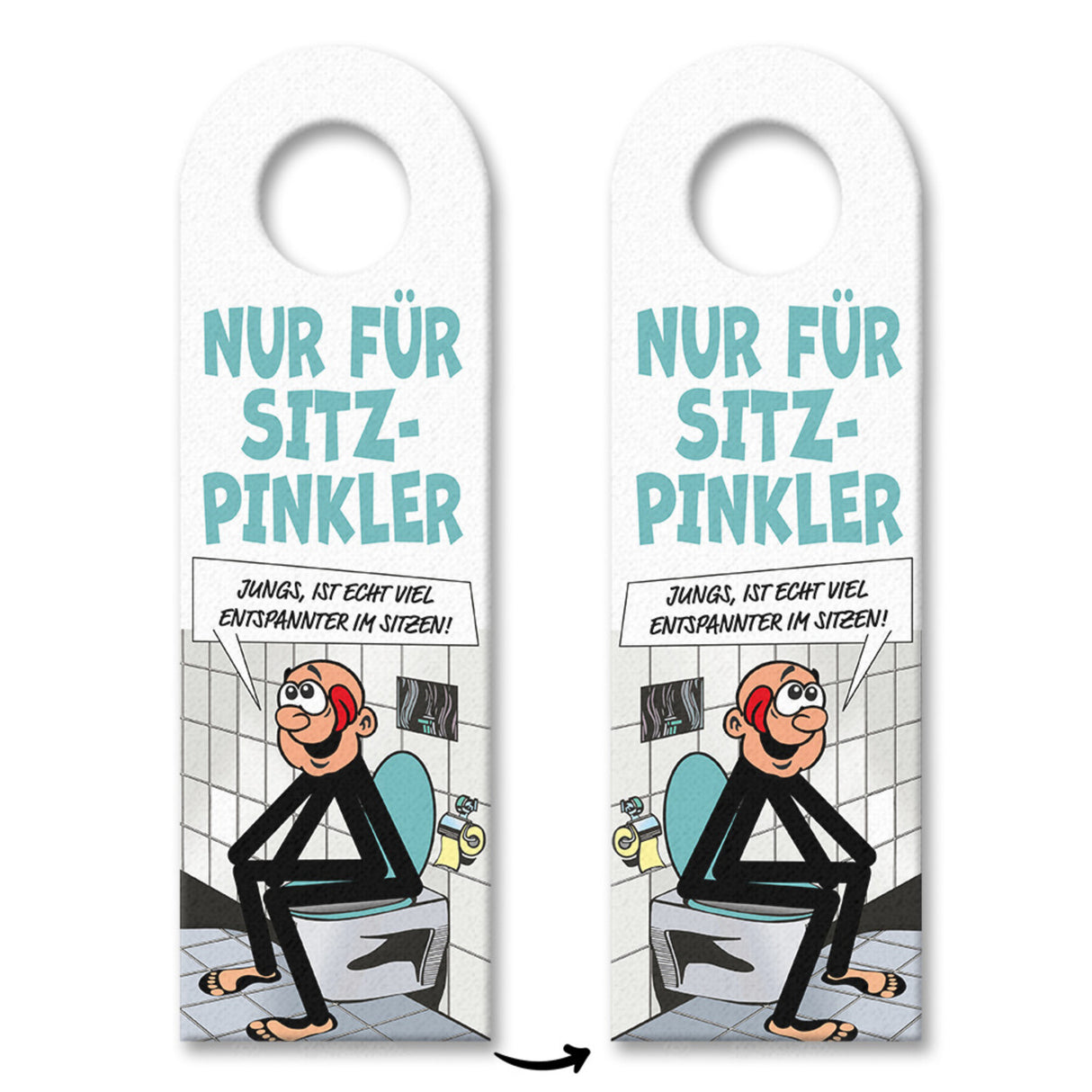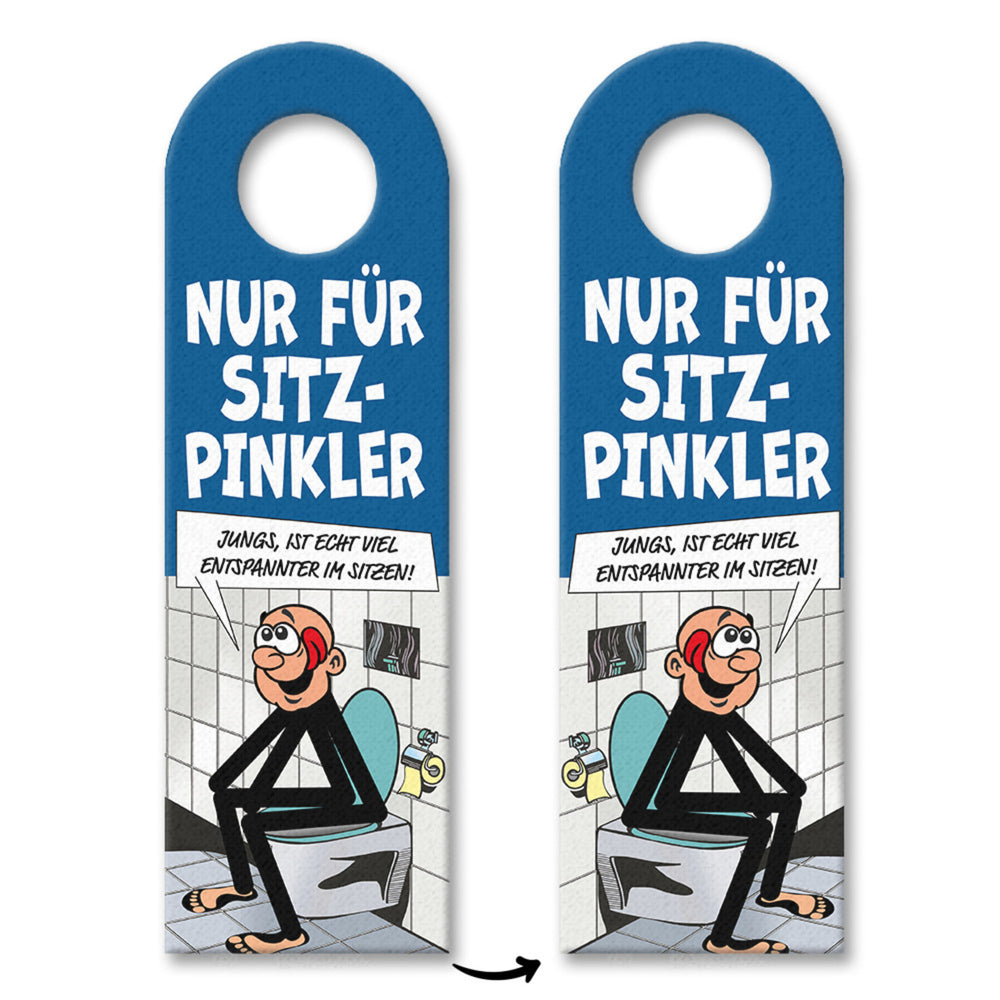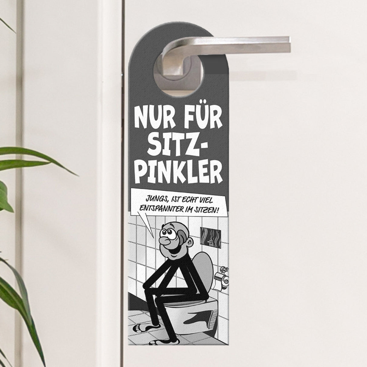 - 1x Bitte im Sitzen pinkeln Türhänger im Comic-Stil schwarz in der gewählten Setgröße