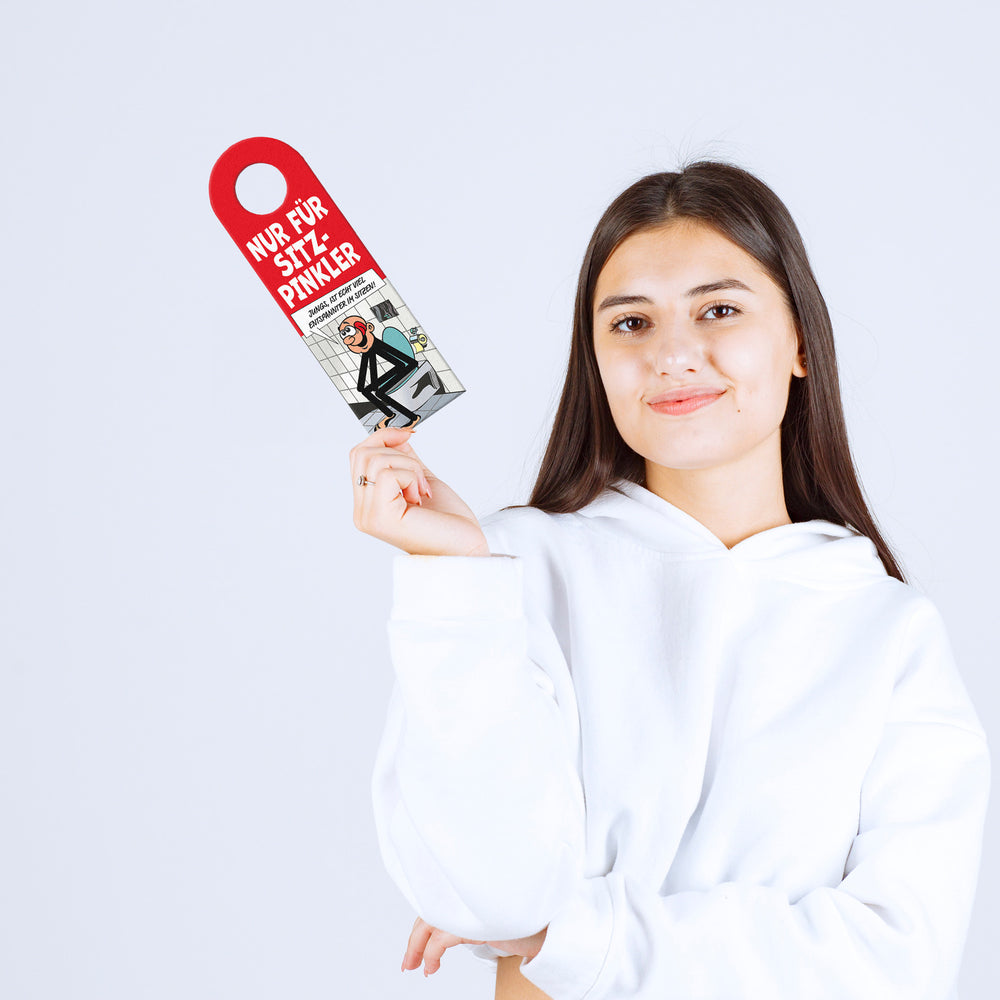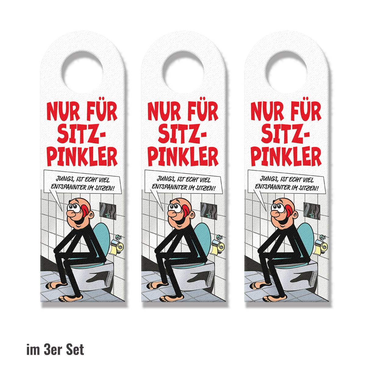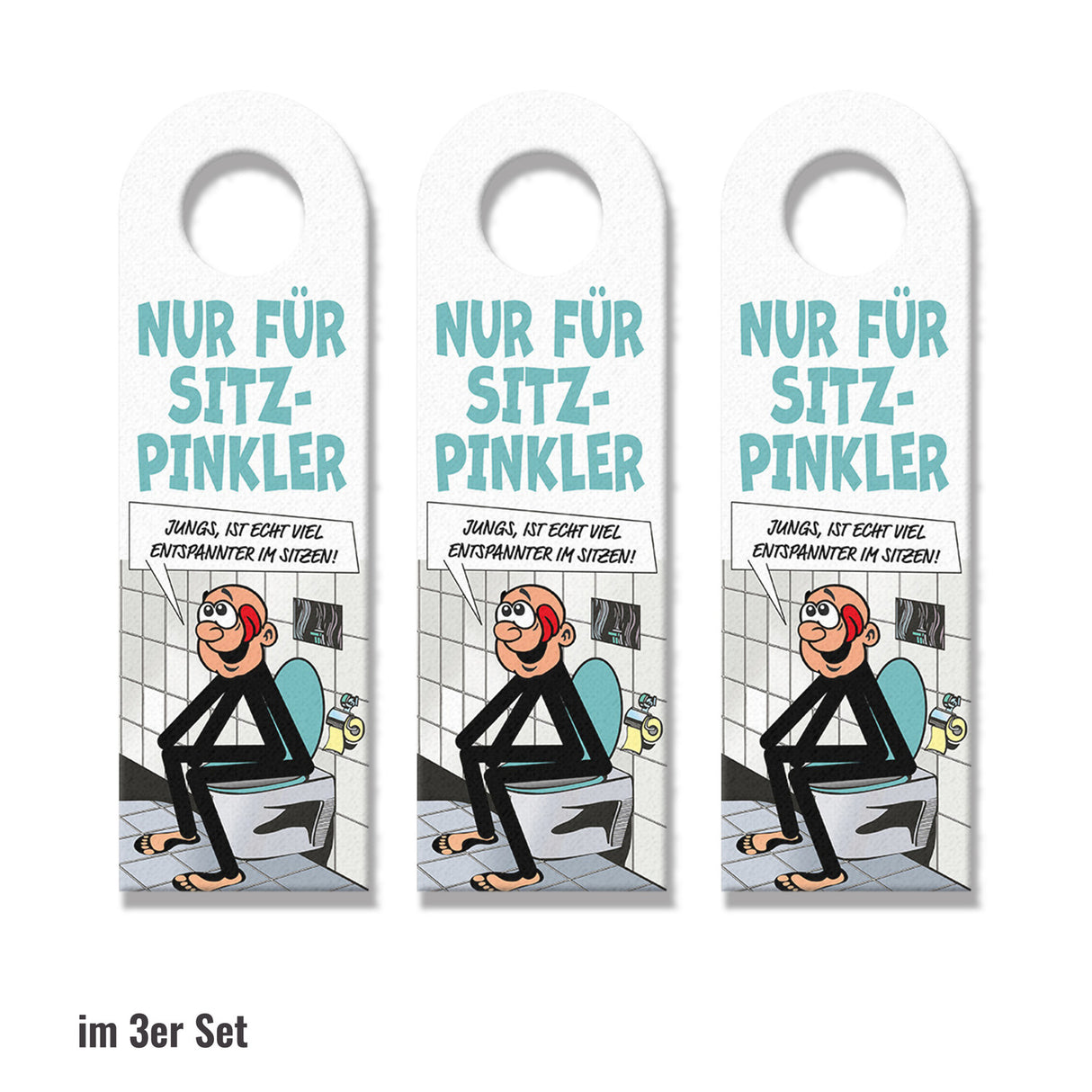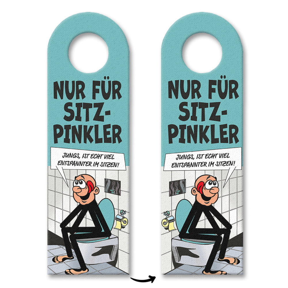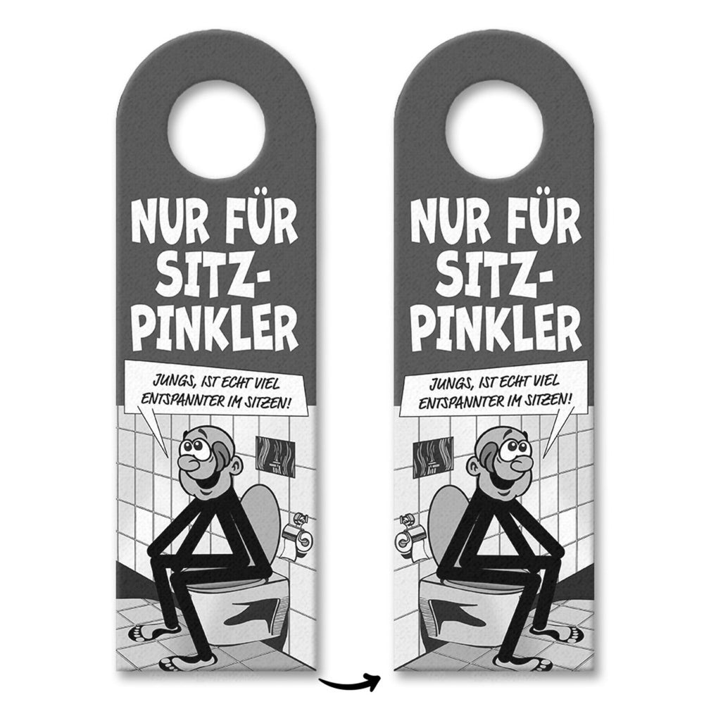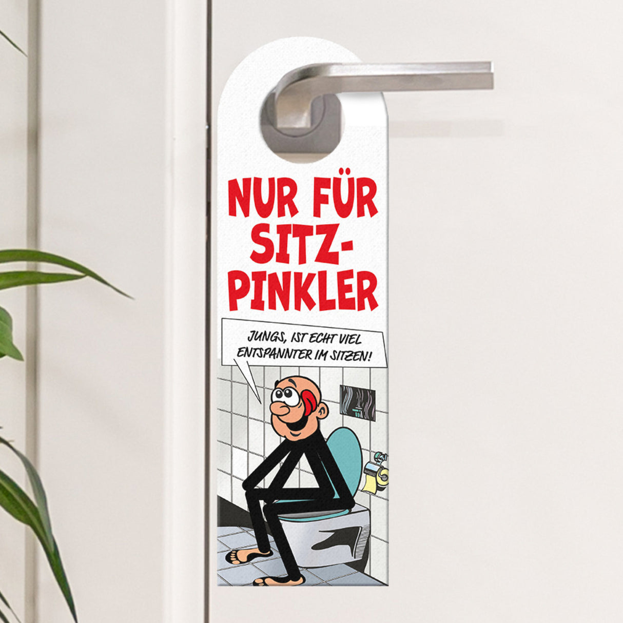 - 1x Bitte im Sitzen pinkeln Türhänger im Comic-Stil schwarz in der gewählten Setgröße