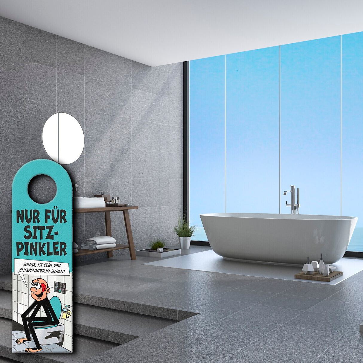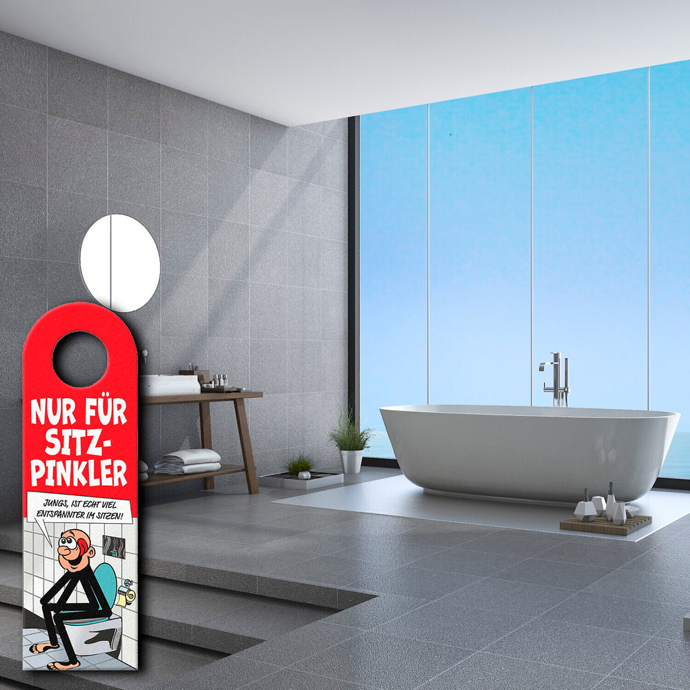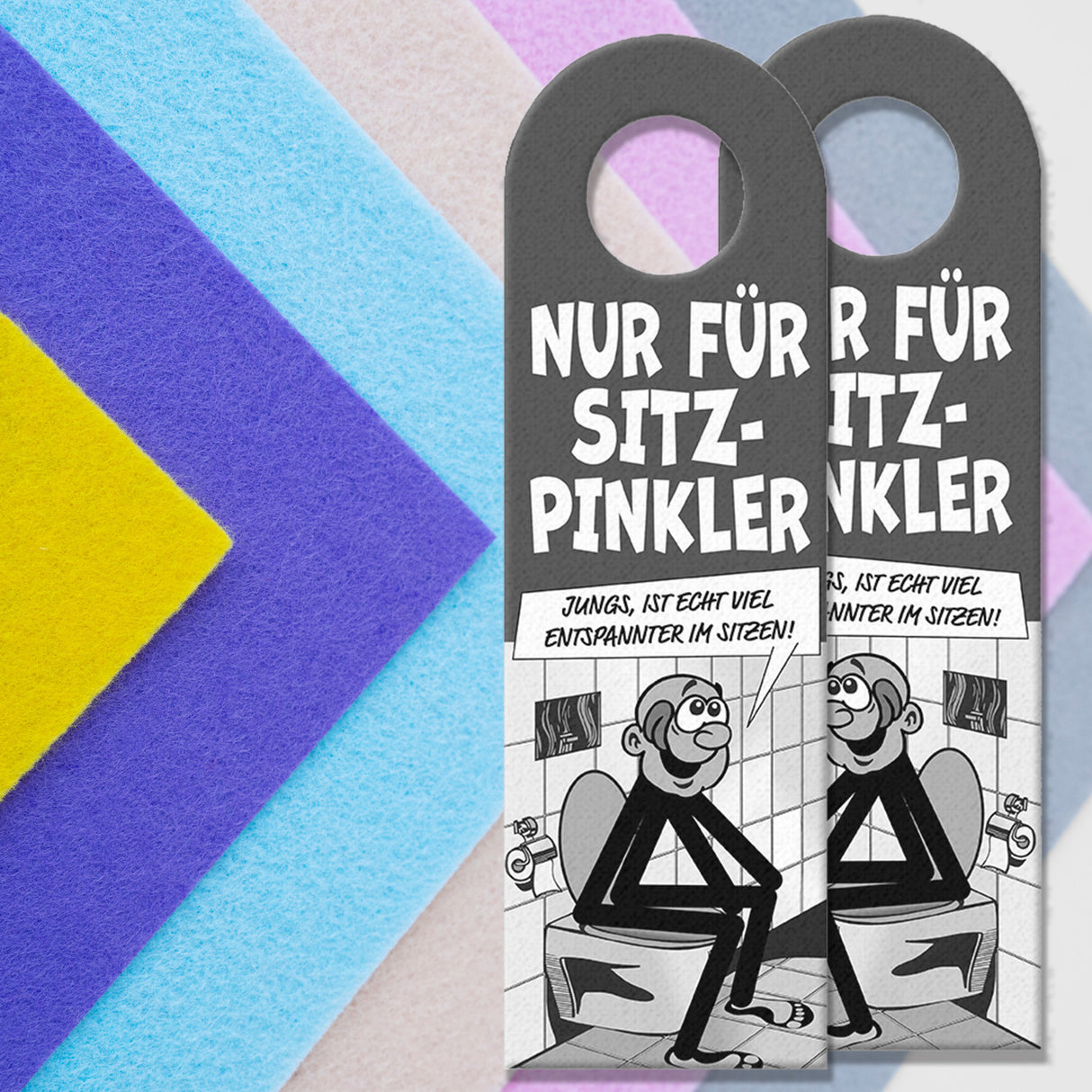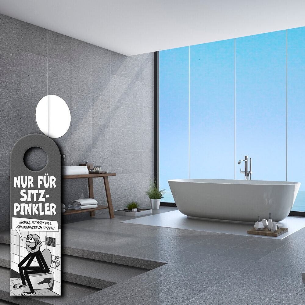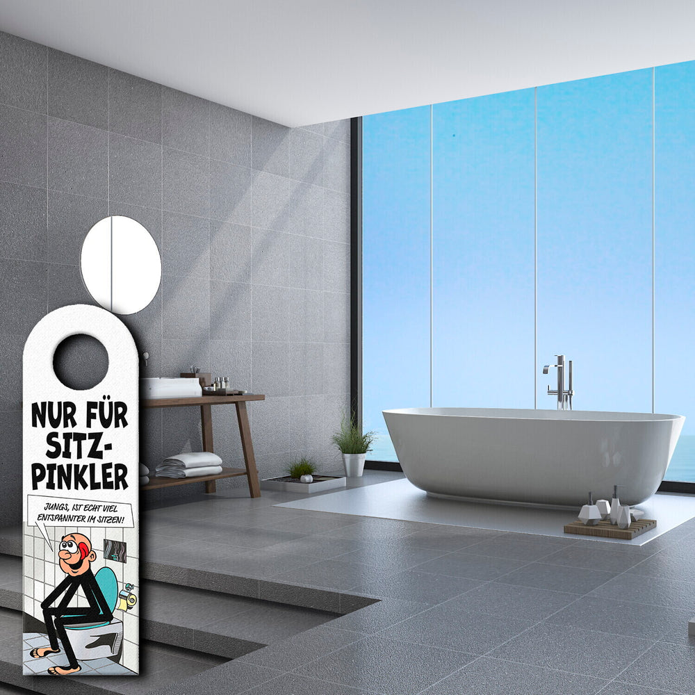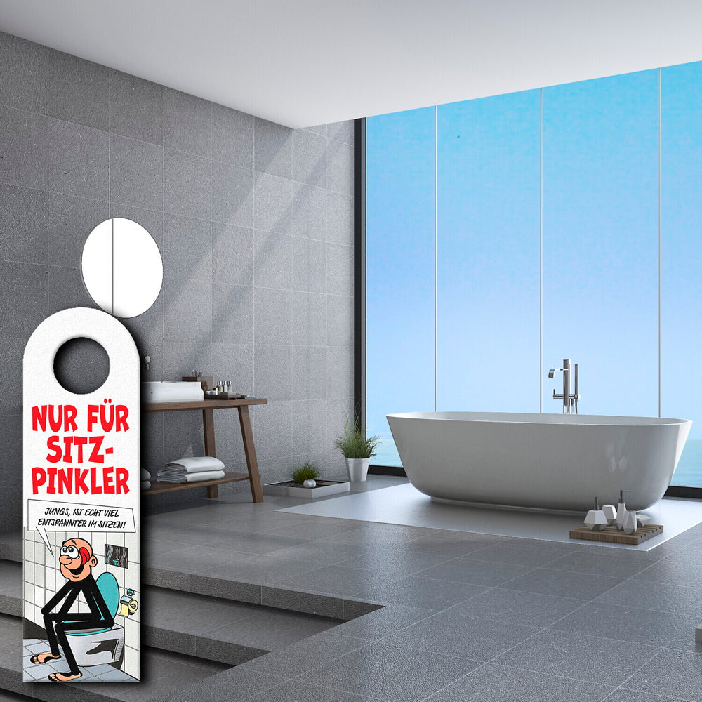 - 1x Bitte im Sitzen pinkeln Türhänger im Comic-Stil schwarz in der gewählten Setgröße
