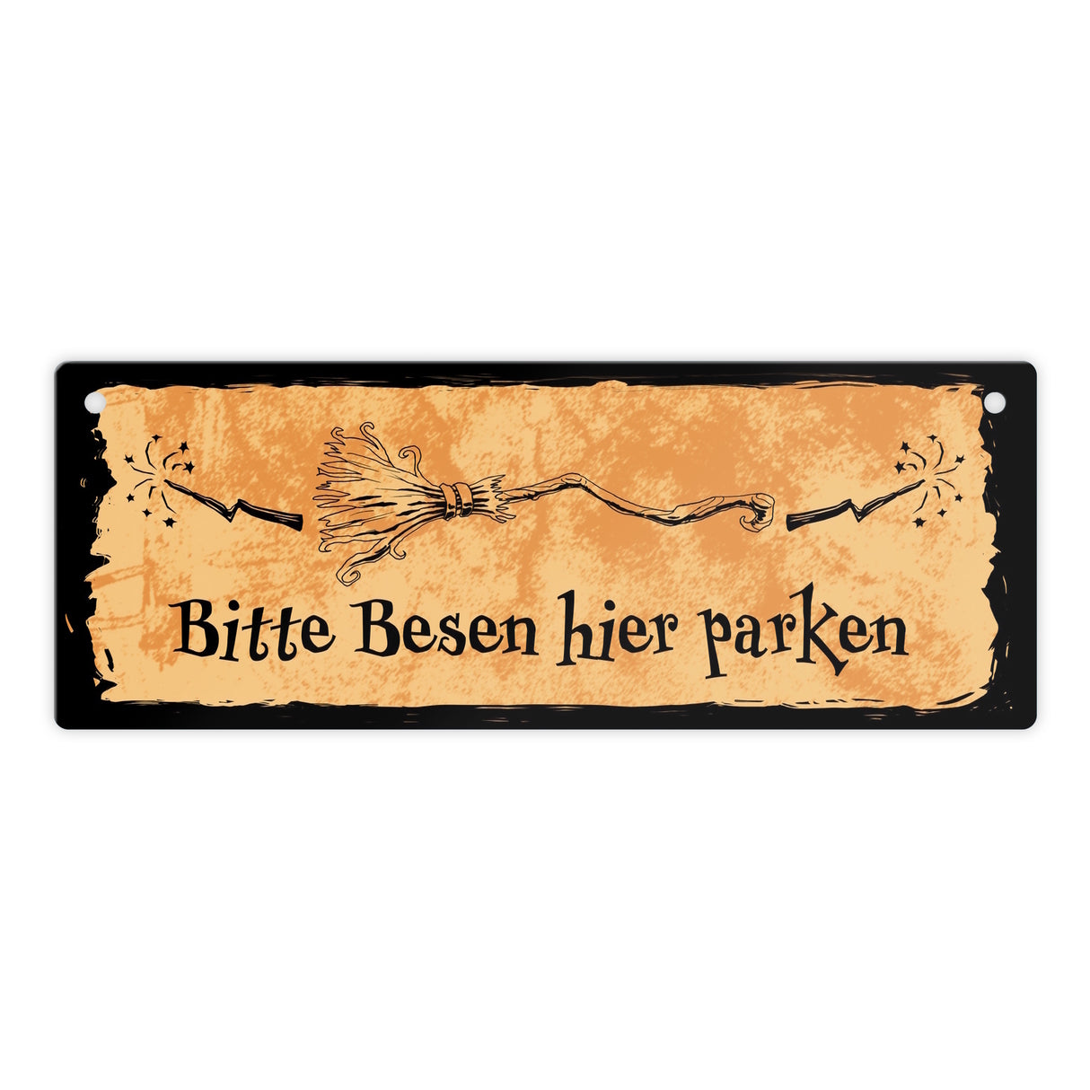 Metallschild für Hexen mit Besen-Motiv und Spruch - Bitte Besen hier parken