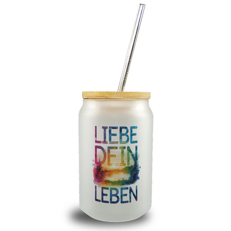 • 1x Liebe dein Leben Trinkglas mit Bambusdeckel Aquarell Design mit Bambusdeckel oder Henkel