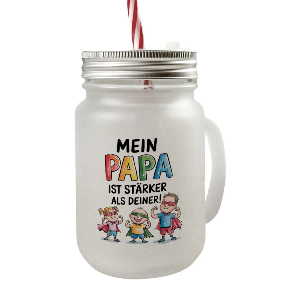 - 1x Mein Papa ist der stärkste Superheld Trinkglas mit Bambusdeckel mit Bambusdeckel oder Henkel